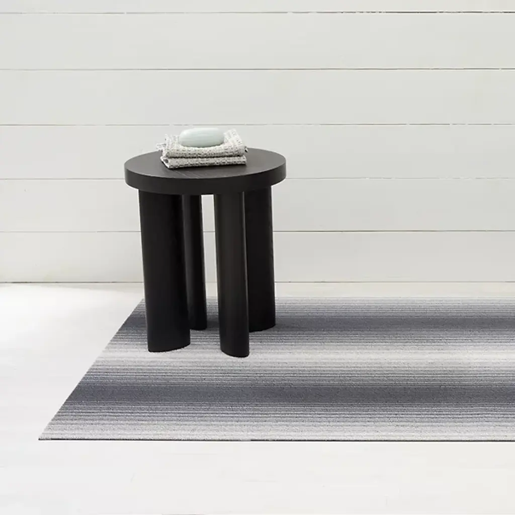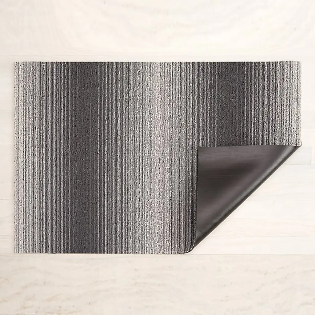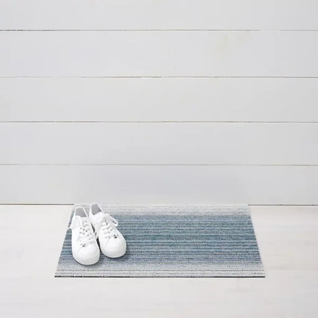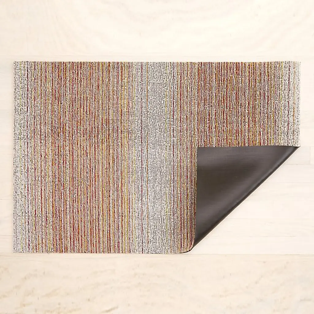 Keep floors clean on the inside by walking across the artful striations of the Fade Stripe Shag Floormat from Chilewich. It gives a secure sensation on the floor with a gripping vinyl backing. On top, mold-resistant vinyl packs into a tight composition that catches dirt while remaining easy to clean. The color-treated strands guide the eyes as a pattern of lines on the floormat. These lines rest alongside each other in generous passes of inviting color.