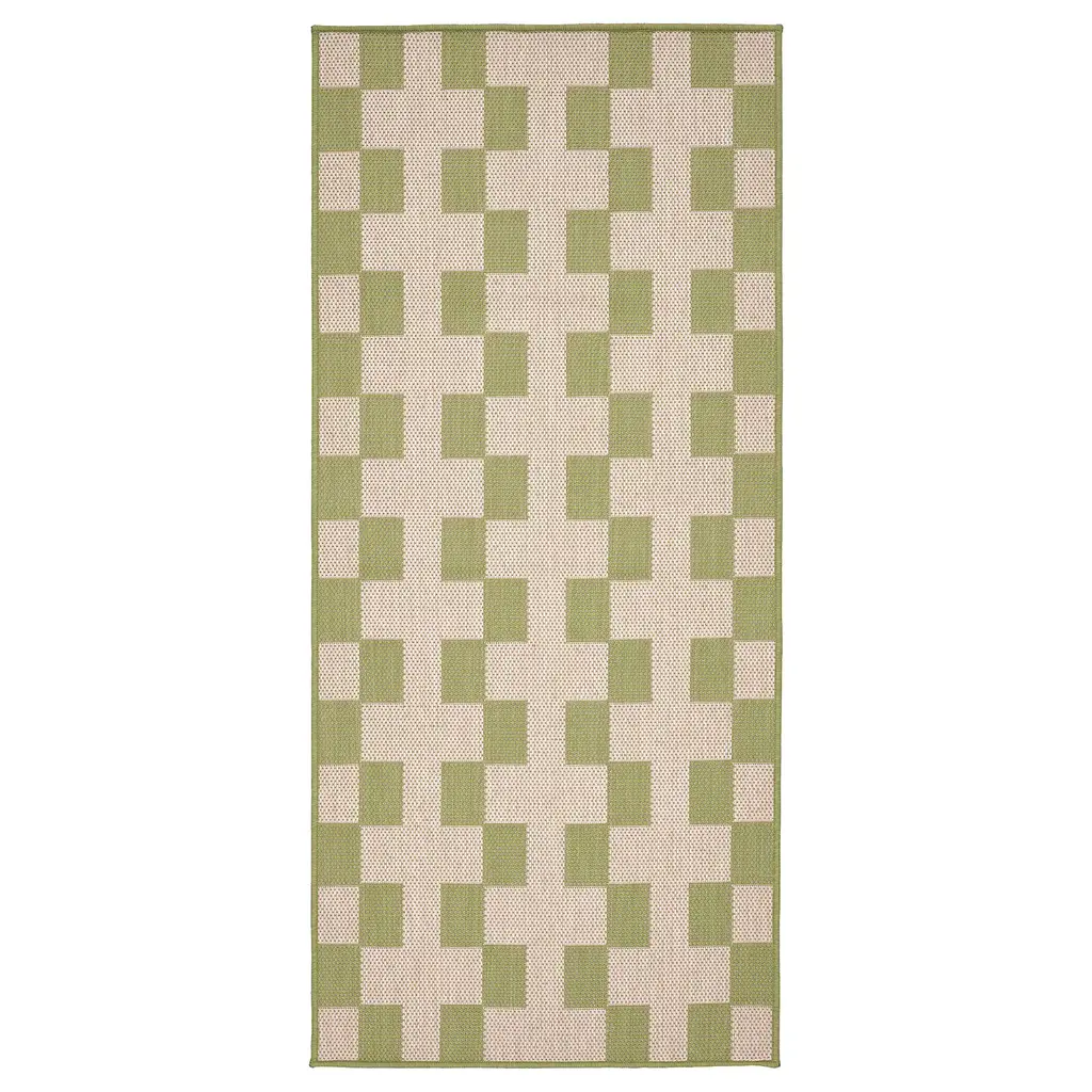 GÅNGSTIG Kitchen mat - flatwoven green/off-white 2 ' 4 "x5 ' 3 ". Easy to vacuum thanks to its flat surface. Tested and approved for use outdoors in moderate to warm climate conditions with rain. A perfect companion for all types of flooring, even those with underfloor heating.