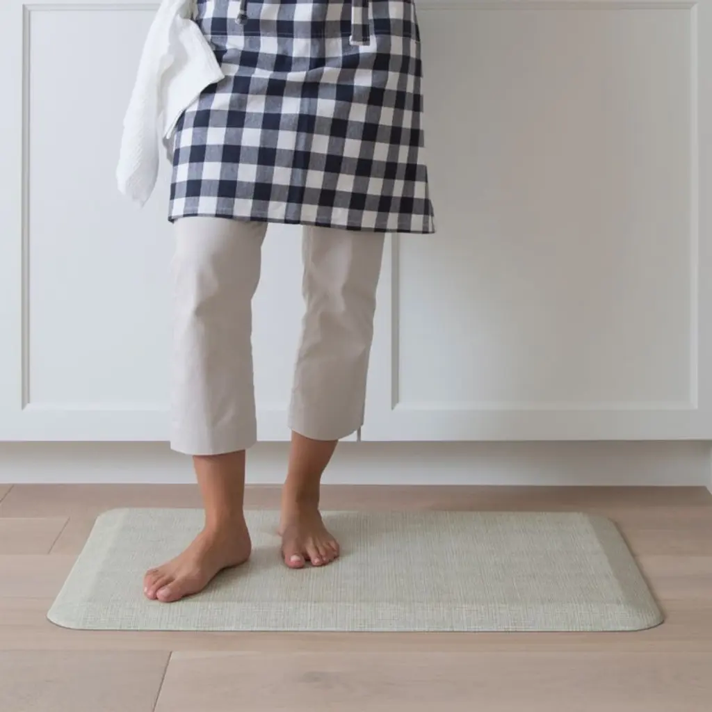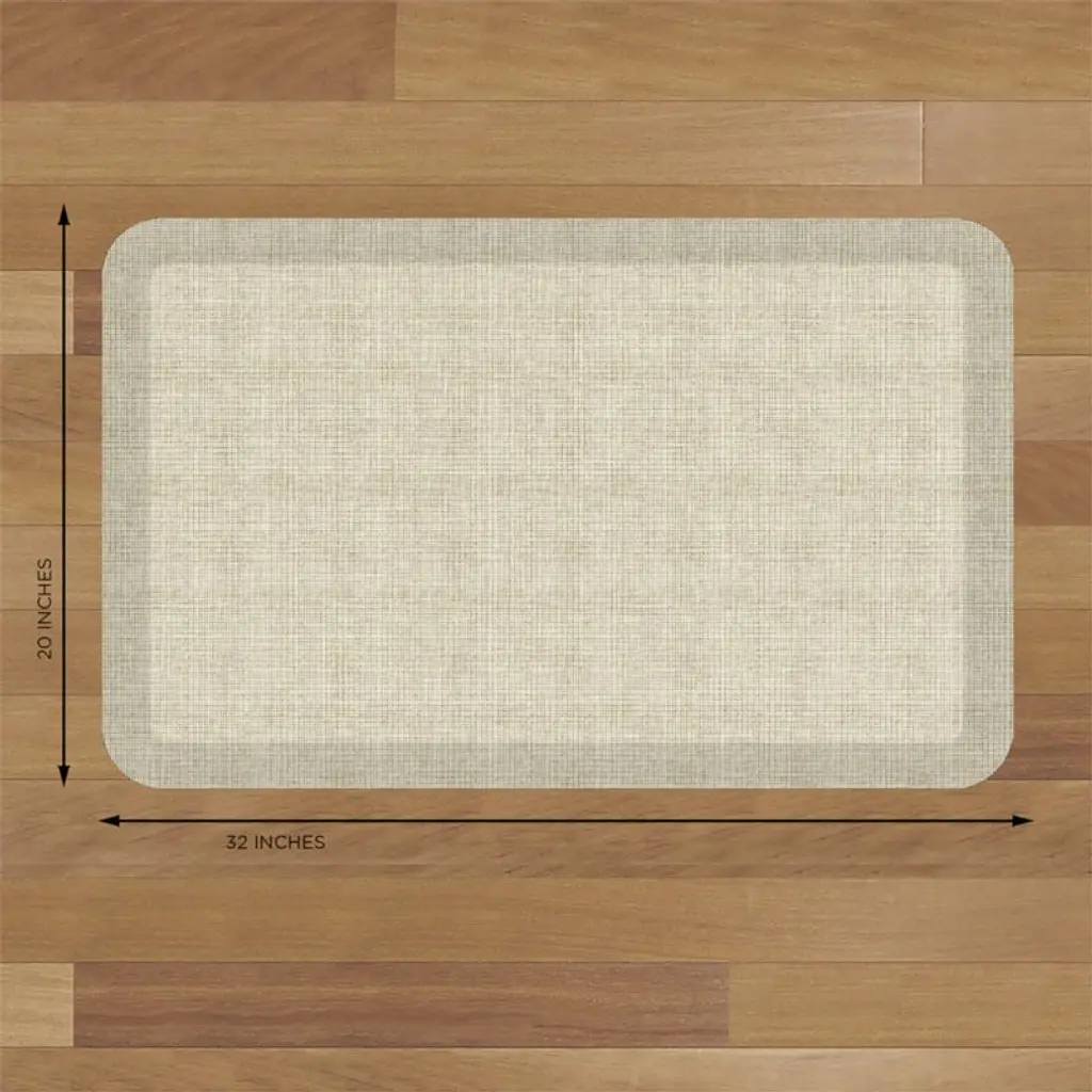 Finished with tightly woven tweed in antique white, this elegant kitchen mat eliminates fatigue as you chop vegetables, roll out cookies and wash dishes. Thick and supportive, the mat helps reduce pain so you can clean and cook in comfort. Thanks to its curl-free beveled edges and non-slip bottom, the off-white kitchen mat helps create a safe workspace in the kitchen or laundry roomor paired with a standing desk. The stain-resistant, waterproof mat cleans up easily with a quick swipe of a soapy cloth.