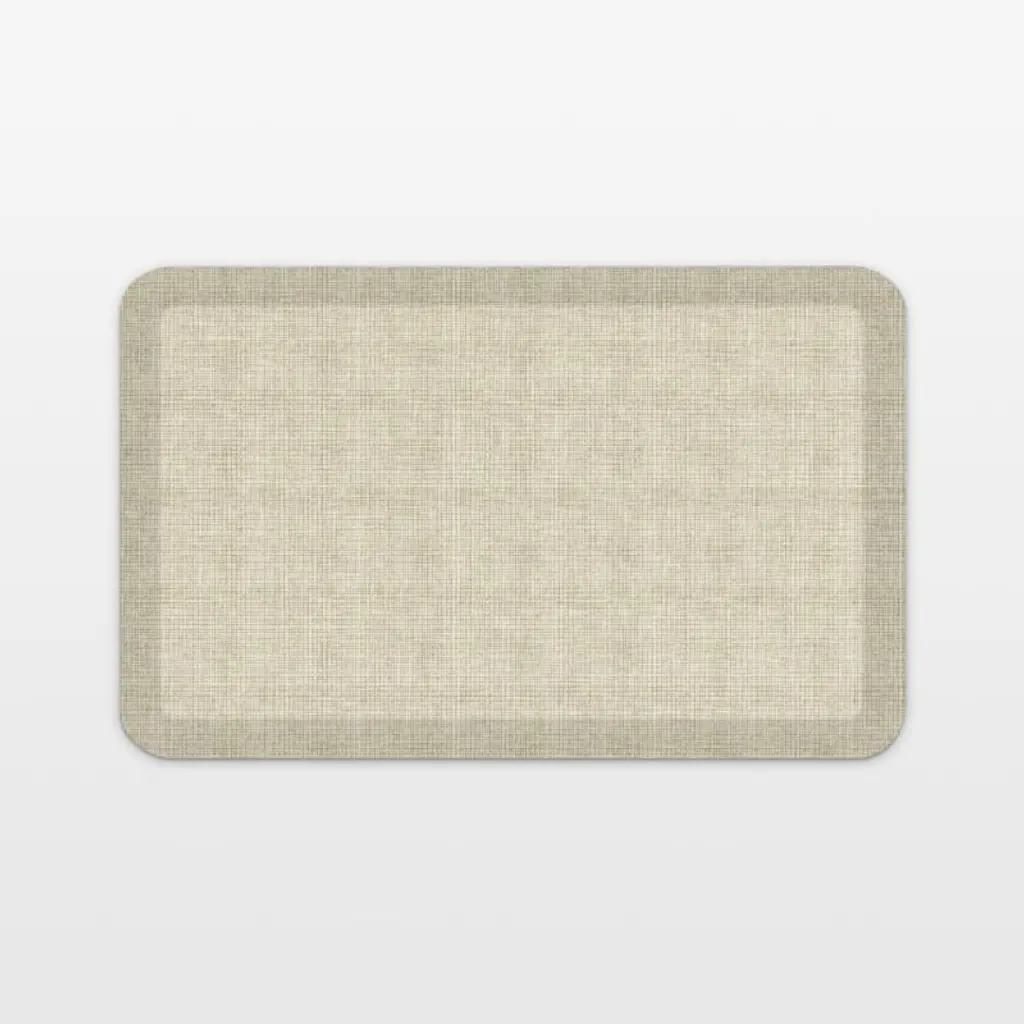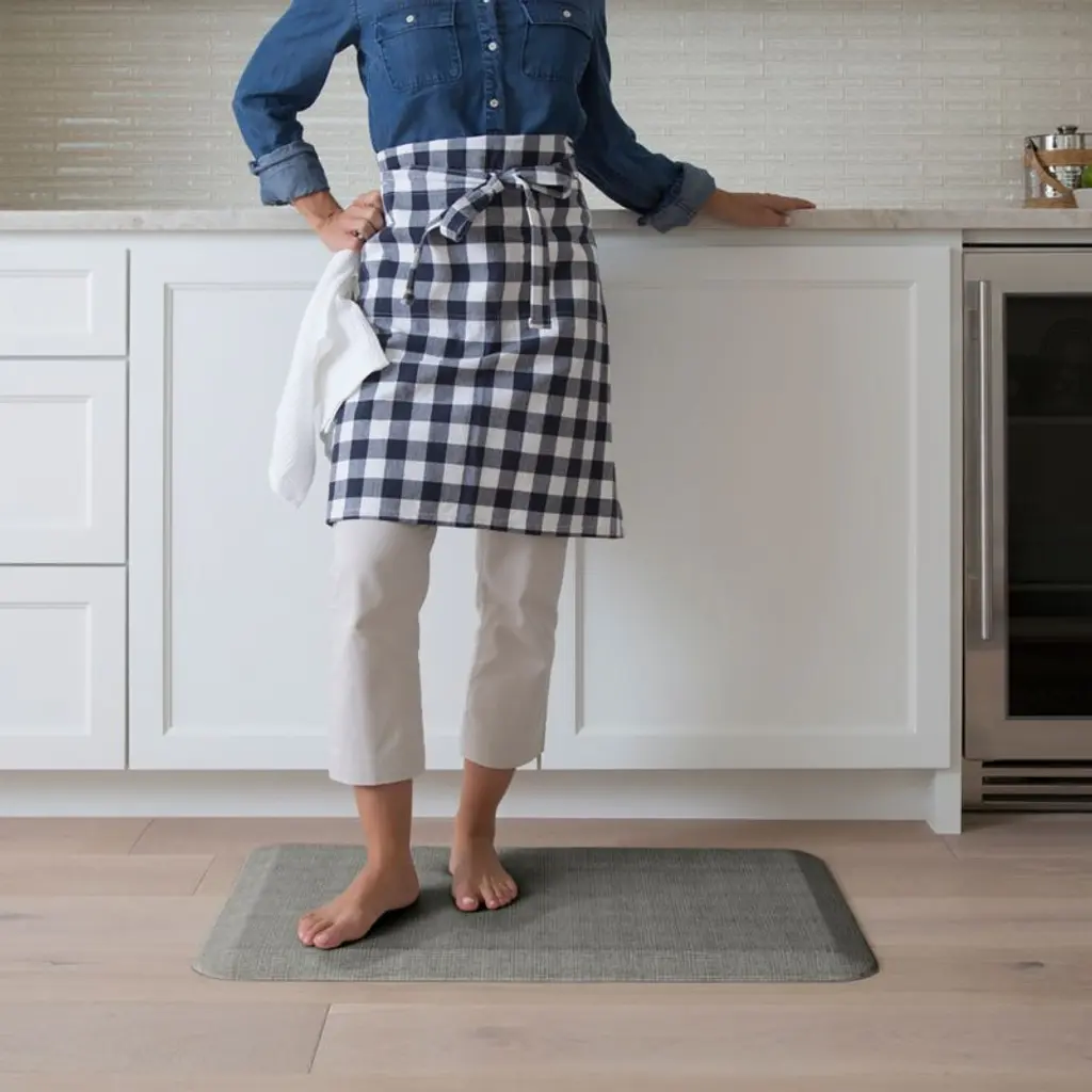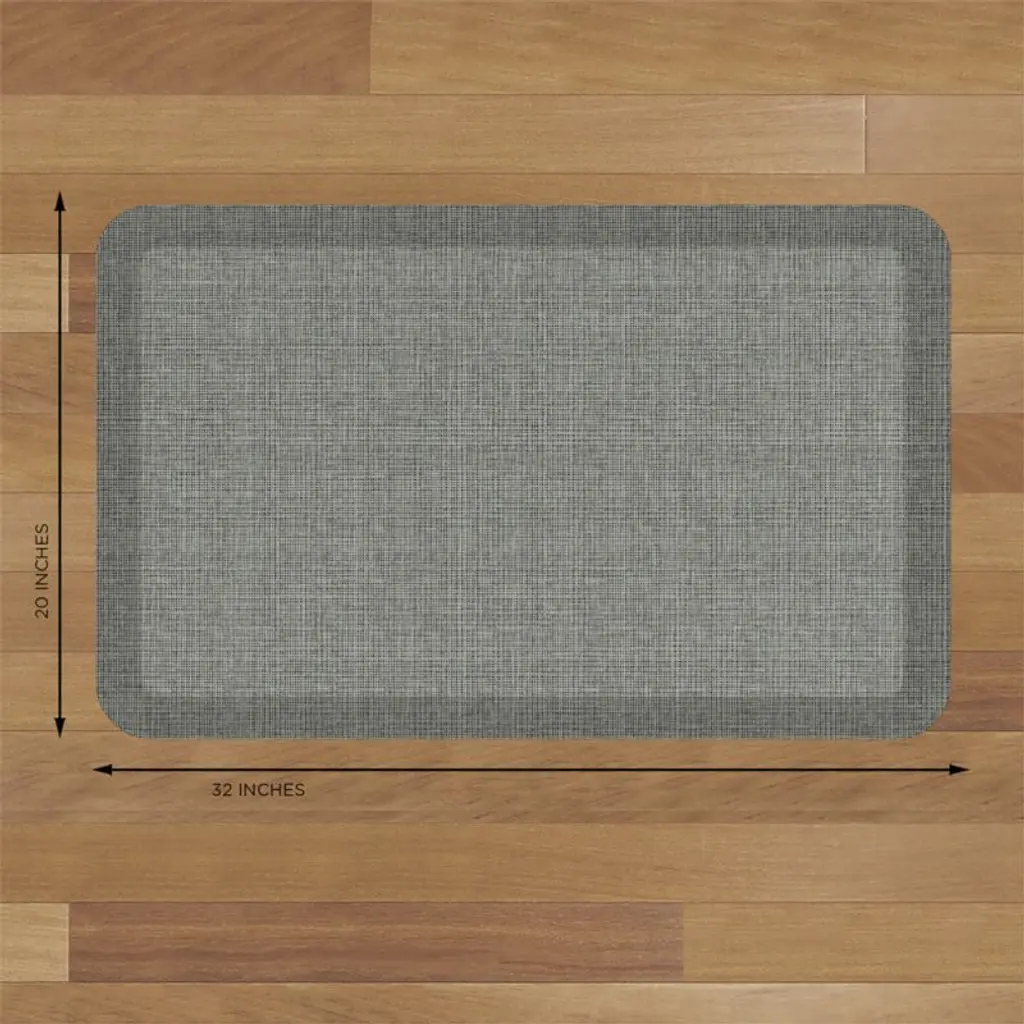 Finished with tightly woven grey tweed, this elegant kitchen mat eliminates fatigue as you chop vegetables, roll out cookies and wash dishes. Thick and supportive, the mat helps reduce pain so you can clean and cook in comfort. Thanks to its curl-free beveled edges and non-slip bottom, the grey kitchen mat helps create a safe workspace in the kitchen or laundry roomor paired with a standing desk. The stain-resistant, waterproof mat cleans up easily with a quick swipe of a soapy cloth.