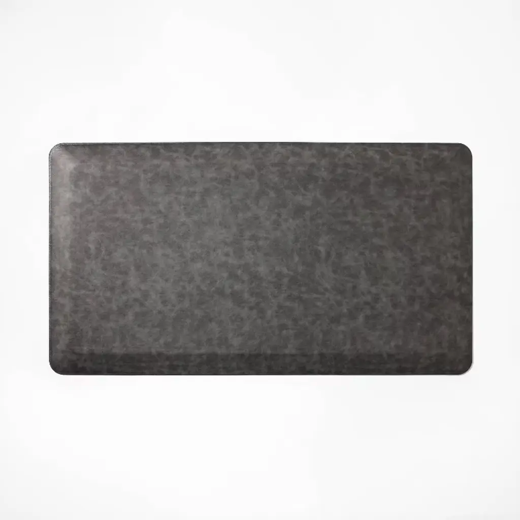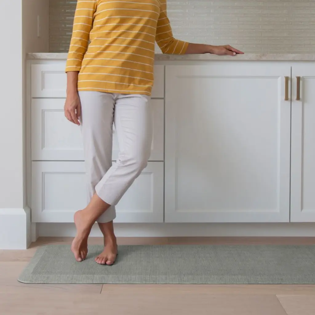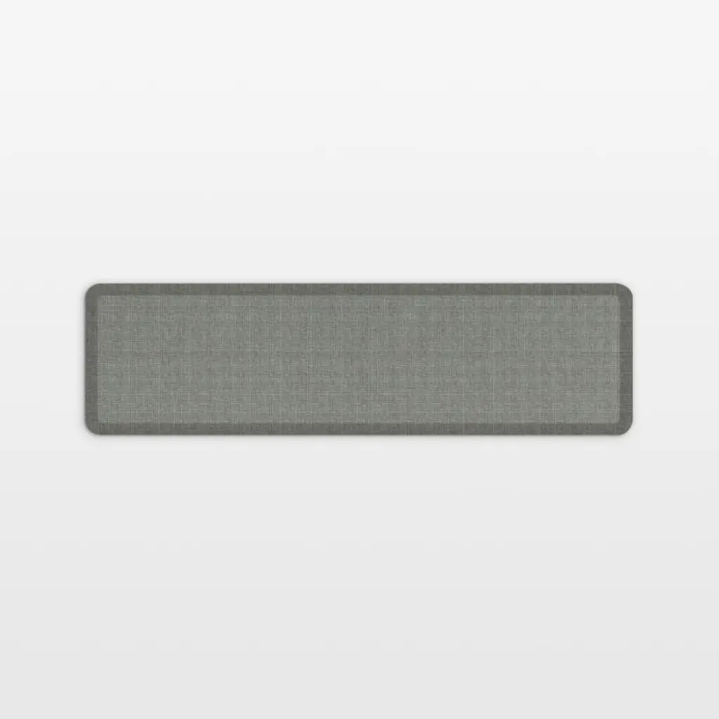 Finished with tightly woven grey tweed, this elegant kitchen mat eliminates fatigue as you chop vegetables, roll out cookies and wash dishes. Thick and supportive, the mat helps reduce pain so you can clean and cook in comfort. Thanks to its curl-free beveled edges and non-slip bottom, the grey kitchen mat helps create a safe workspace in the kitchen or laundry roomor paired with a standing desk. The stain-resistant, waterproof mat cleans up easily with a quick swipe of a soapy cloth.