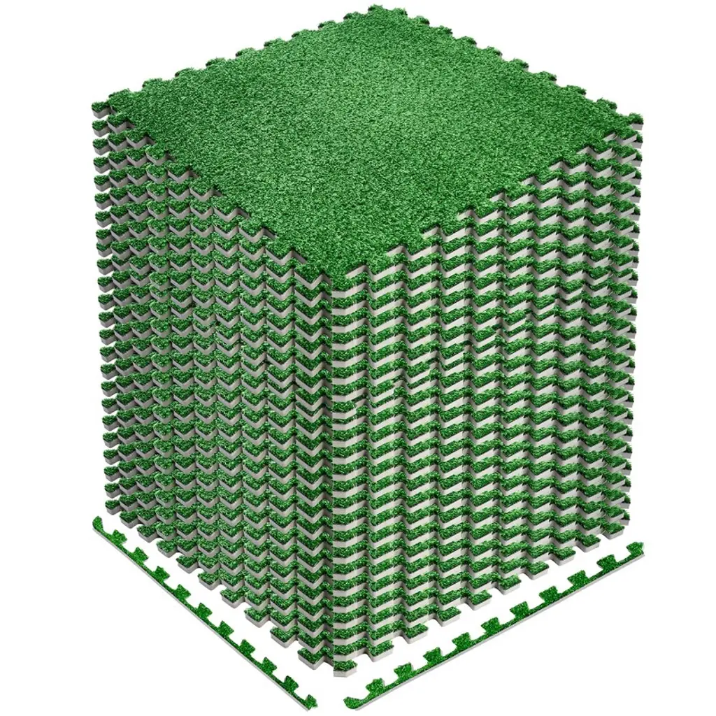 The grass is truly greener on the other side with Sorbus Interlocking Grass Tiles! Make a meadow out of your deck, patio, or balcony with grass carpet tiles that combine the softness of EVA foam and durability of artificial turf. It features 12 foam tile pieces that soften your indoor/outdoor space with the look of real grass so there is no need to add water, fertilizer, or pesticides! In a few short minutes, you can create beautiful protective flooring that last for seasons of enjoyment.Versatile from the patio to the playroom!Whether you're decorating a patio or need a padded play area for kids, these interlocking mats are versatile enough to be used almost anywhere! Revamp your outdoor living space with artificial turf tiles that bring a natural, comfortable look to any patio, terrace, or balcony. They install in seconds for an impromptu barbecue on the deck or rooftop garden retreat with tables and lounge chairs. With this amazing set up, guests are sure to be green with envy! Indoors, update a playroom for kids or add to your home gym to protect both your floor and exercise equipment. These tile mats are also suitable for party tents, wedding tents, canopies, trade shows, conventions, office spaces, and more.Easy installation with no adhesive needed.Faux grass tiles can be installed both indoors/outdoors.Detachable edges pieces allows any tile to be a border.Can be Installed in specific areas or wall-to-wall.Printed Film material is OPP 100% Plastic, Mat is 100%PE.Durable enough to withstand common foot traffic.The 12-pack tiles cover approx 48 sq feet.Each tile measures approximately 25"L x 25"WItem Weight 17.46 poundsOutdoor LivingNo more watering or mowing! Install these maintenance-free tiles to any patio, balcony, etc.PlayroomProvide a comfortable play surface for kids that brighten any room with a fun update.