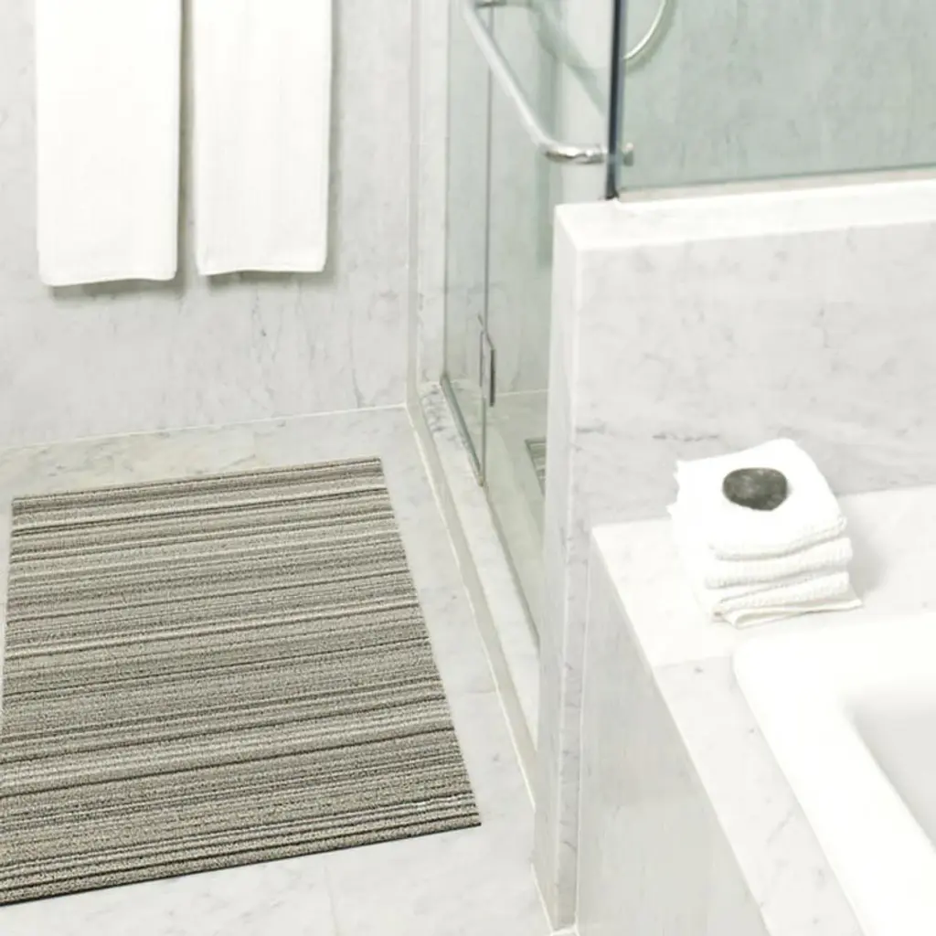 A simple floor covering to accent an entryway or primary bathroom, the Skinny Stripe Indoor/Outdoor Shag Mat from Chilewich is ready to stand up to frequent, everyday use. A shag-style mat with a plush feel underfoot, this mat is made from hard-wearing vinyl ready to weather any unexpected outdoor conditions or steamy shower interiors.Highlights