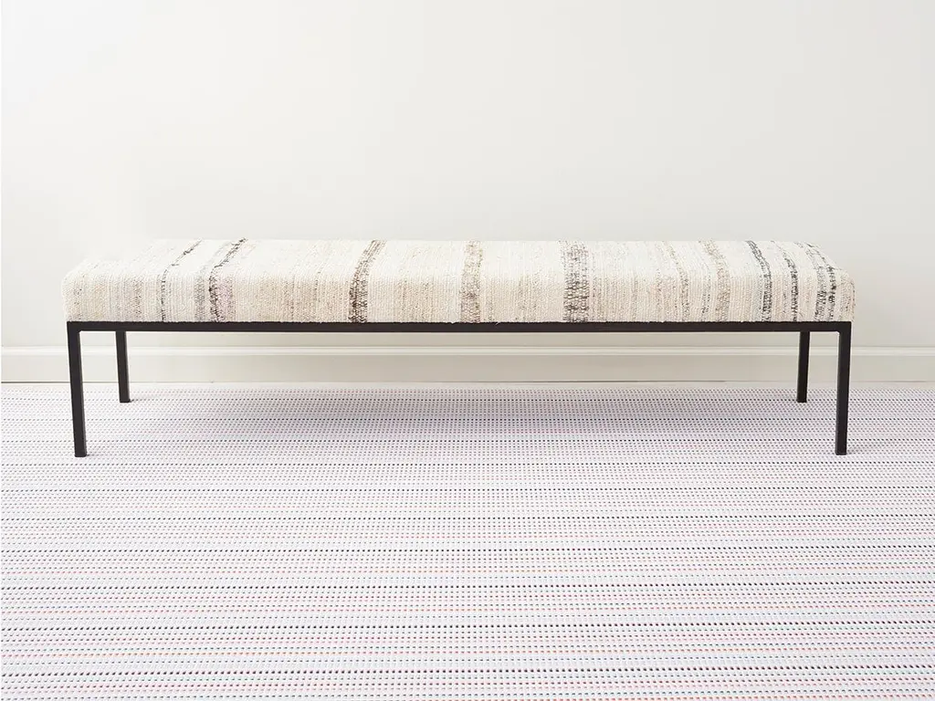 Made from woven textiles, our floor mats are durable, versatile beautiful and easy to clean. Perfect for use in entryways, dining areas, bedrooms, living areas and kitchens. Revealing patterns within patterns and stripes within stripes, Tambour was developed through an iterative process of combining multiple weaves into one harmonious design. It explores novel ways to display vibrant color, balancing the horizontal and the vertical to create a versatile visual rhythm. TO CLEAN: Vacuum to remove loose dirt or wipe clean with soap, water, and a soft sponge or cloth. Resists stain-causing bacteria, mold, and mildew. For over a decade, New York based designer Sandy Chilewich has been creating original and innovative vinyl products for the home. Her woven, tufted, molded and spun textiles are available in a range of vibrant and neutral hues that have become synonymous with the Chilewich brand name.