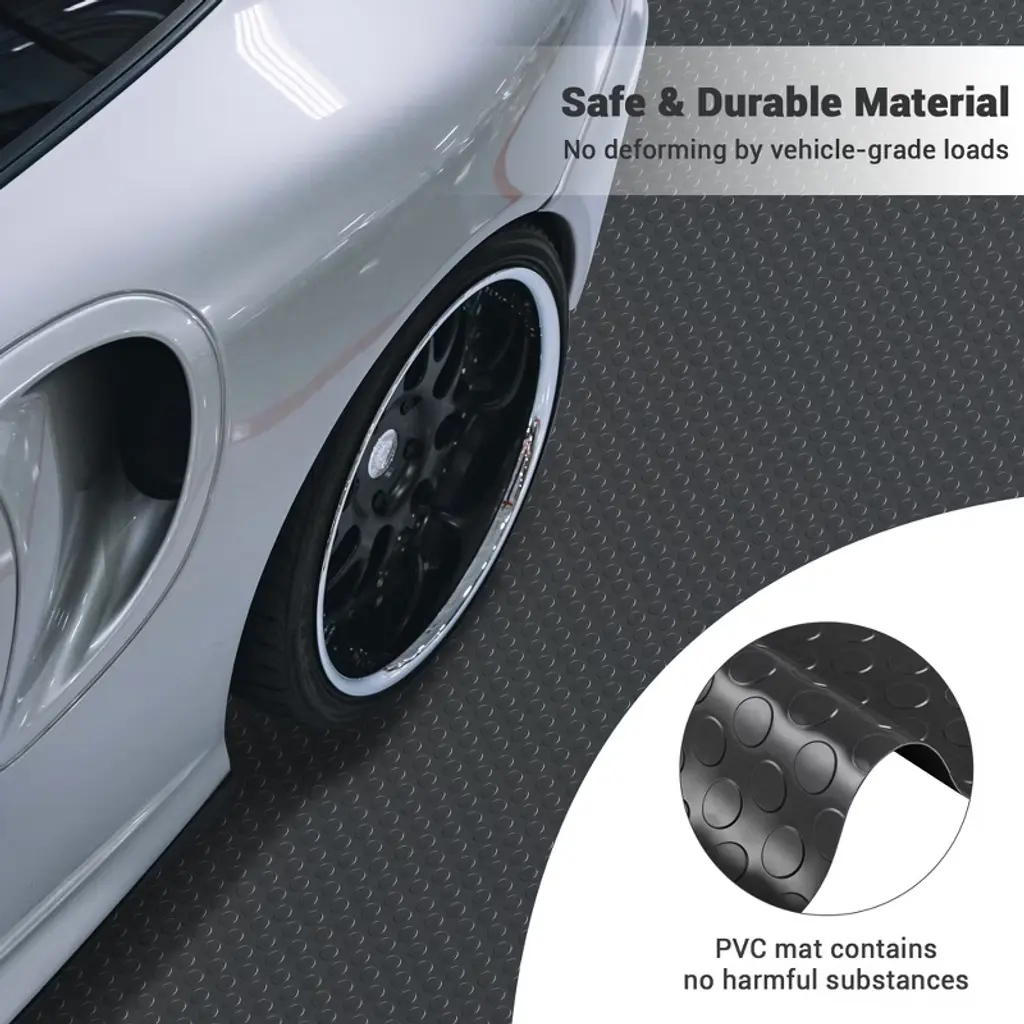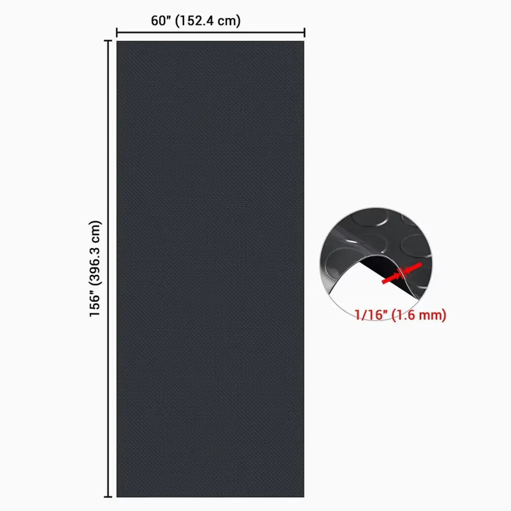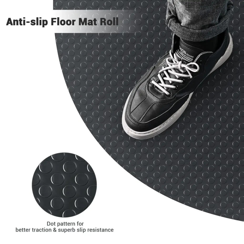 Features:- Anti-slip Floor Mat Roll - 156"x60" Floor Mat Roll features round dot pattern for better traction & superb slip resistance, covers concrete or wood sub-floors to prevent deterioration and hide cracks, ideal for residential garage, parking lot, warehouse, food factory, hospital, stadium, hallway- Safe & Durable Material - Made of PVC, floor mat contains no harmful substances for safe use and produces no odor; Durable and wear resistant, and can support long-time standing and withstand vehicle-grade loads like trailers, trucks, or SUVs without deforming- Easy to Cut & Install - Available in customizable shape by easy cutting with sharp knife or scissor according to your garage size; Easy to install by just rolling out the floor mat on the surface for a smooth and even display- Easy to Clean - Easy to clean by using vacuum cleaner, broomstick, dry mop to remove crumbs, dust or debris, which saves you time and energy; No dismantling required for effortless maintenance, only step on and clean- Water Resistant - Water resistant floor mat provides excellent protection from dirty water penetration, which makes stains easy to remove and no pollution to the floor creating a dry and clear environmentSpecifications:- Mat Size(LxW): 156" x 60" (396.3 x 152.4 cm)- Overall Thickness with Pattern: 1/16" (1.6 mm)- Material: PVC- Net Weight: 21.4 Lbs (9.7 kg)Package Contents:- 1x Floor Mat RollNotice: - Patterns of two mats may not match exactly along the seam when they are laid side by side.