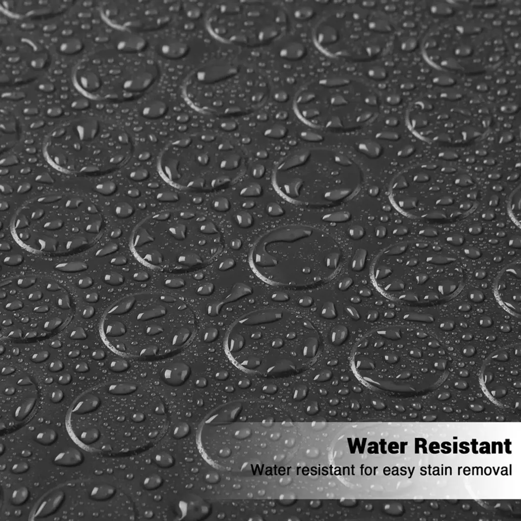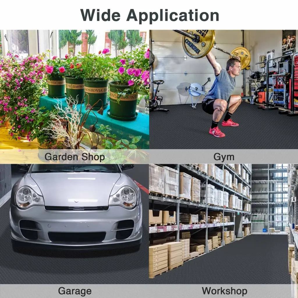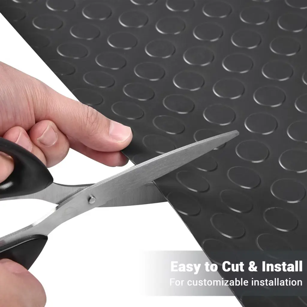 Features:- Anti-slip Floor Mat Roll - 156"x60" Floor Mat Roll features round dot pattern for better traction & superb slip resistance, covers concrete or wood sub-floors to prevent deterioration and hide cracks, ideal for residential garage, parking lot, warehouse, food factory, hospital, stadium, hallway- Safe & Durable Material - Made of PVC, floor mat contains no harmful substances for safe use and produces no odor; Durable and wear resistant, and can support long-time standing and withstand vehicle-grade loads like trailers, trucks, or SUVs without deforming- Easy to Cut & Install - Available in customizable shape by easy cutting with sharp knife or scissor according to your garage size; Easy to install by just rolling out the floor mat on the surface for a smooth and even display- Easy to Clean - Easy to clean by using vacuum cleaner, broomstick, dry mop to remove crumbs, dust or debris, which saves you time and energy; No dismantling required for effortless maintenance, only step on and clean- Water Resistant - Water resistant floor mat provides excellent protection from dirty water penetration, which makes stains easy to remove and no pollution to the floor creating a dry and clear environmentSpecifications:- Mat Size(LxW): 156" x 60" (396.3 x 152.4 cm)- Overall Thickness with Pattern: 1/16" (1.6 mm)- Material: PVC- Net Weight: 21.4 Lbs (9.7 kg)Package Contents:- 1x Floor Mat RollNotice: - Patterns of two mats may not match exactly along the seam when they are laid side by side.