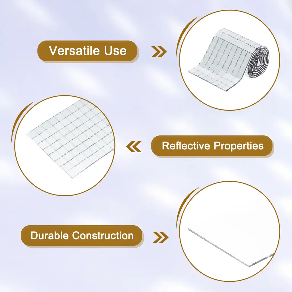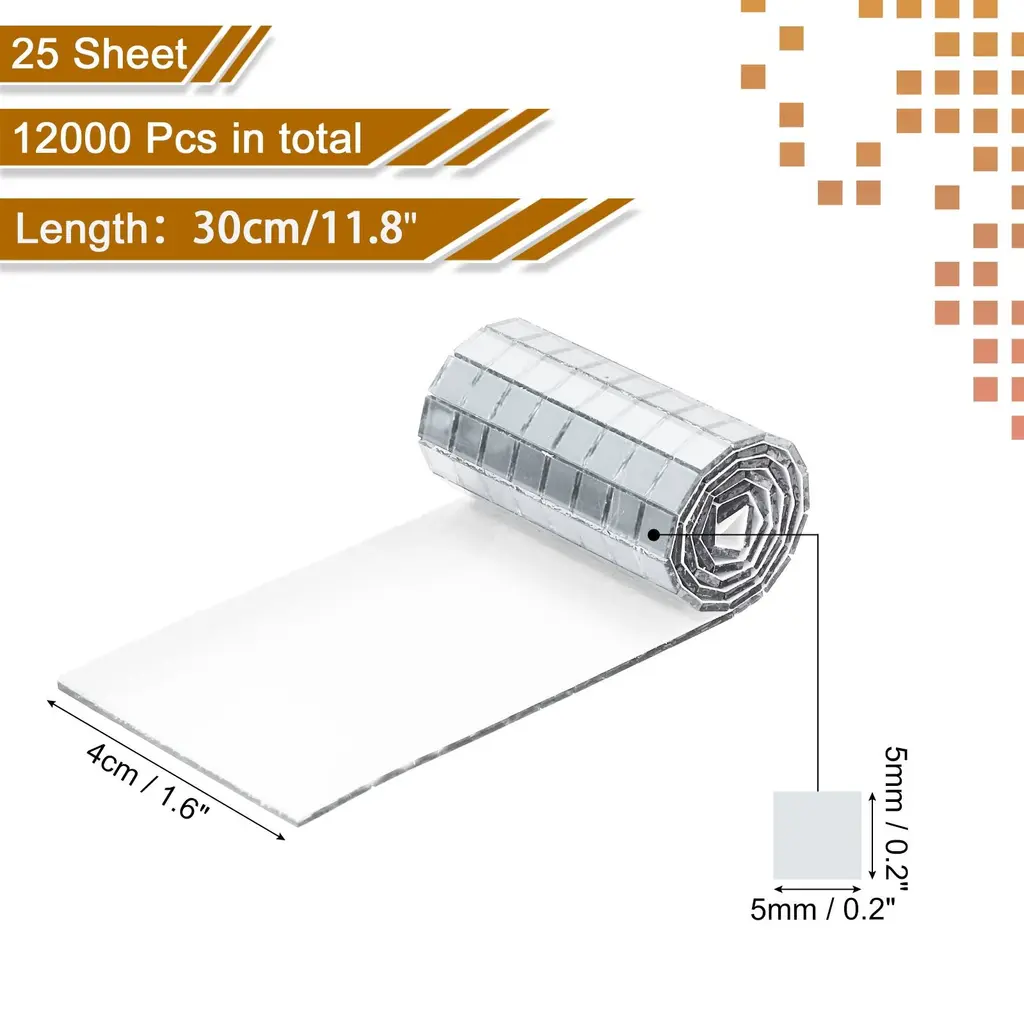 What is this?These mirror squares can be used in various applications - from home decor, parties, weddings, clubs, to stage performances. Whether you want to create an eye-catching centerpiece or a vibrant dance floor, these tiles are versatile enough to suit your needs.What will I get?Single Piece Size: 5 x 5mm / 0.2 x 0.2 inchTotal Size: 4 x30cm / 1.6 x 11.8 inchColor: SilverMaterial: GlassIn the package of: 25 Sheet x Mosaic Mirror, 12000 Pcs in totalAre there any advantages of the product?1. Reflective Properties: The glass mirror surface of these tiles reflects light beautifully, creating enchanting patterns and reflection around the room. They can enhance the ambiance and create a dynamic atmosphere wherever they are installed.2. Durable Construction: Made of glass material, these disco ball tiles are sturdy and long-lasting. They are designed to withstand regular use and applied for multiple events or occasions.How to use it?1. Ensure that the surface where you will be applying the mosaic tiles is clean, dry, and free from any dust, dirt, or debris.2. Peeling off the protective film from the self-adhesive side of each tile. Take care not to touch the adhesive as it may reduce its effectiveness.3. Press each tile firmly onto the desired surface, following your plan. Apply even pressure to ensure proper adhesion.4. Avoid touching or disturbing the mirror stickers during the time when waiting for adhesive.What should I notice?Please choose the correct size for you.