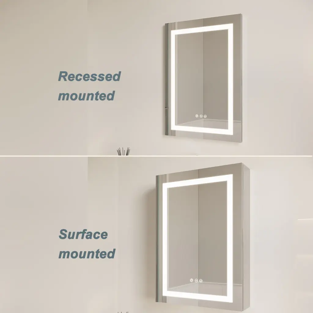 Surface-mounted or recessed-mounted, this medicine cabinet provides essential storage space without sacrificing floor space. Perfect for bathrooms that are a bit small. You can install it over the sink, next to the bathtub, or anywhere else. The mirror frame is made from aluminum alloy material, which is corrosion-resistant. You don''t have to worry about the stability of the structure. There are three touch switches for this cabinet, which control the main light, the anti-fog function respectively, the brightness adjustment, and the color temperature adjustment of the lighting. The independent control function allows users to know how to use it easily. An even mix of classic and contemporary elements, this clean-lined medicine cabinet lets you tuck away items in style.1.Single door mirror cabinet (2-in-1: embedded&wall mounted).2. Single door double-sided mirror door, with one circle of regular sanding on the mirror door (left door open).3.The mirror frame is made from aluminum alloy material, which is corrosion-resistant. You don''t have to worry about the stability of the structure.4.It is equipped with a three button Touch switch to control the main light and anti-fog film and adjust the light+color temperature, 3-color temperature, dimmable led with a long press to adjust the brightness. A lighted medicine cabinet can adjust the brightness from dark to bright according to your preference.5.This medicine cabinet with reasonable shelves to fully maximize storage space and let your bathroom and other scenarios be organized and clean.6.A bathroom medicine cabinet with a mirror provides uniform and optimal bright lighting, which can eliminate harsh shadows and hot spots when you are shaving, brushing your teeth, or putting on makeup.7.An even mix of classic and contemporary elements, this clean-lined medicine cabinet lets you tuck away items in style.8.The hinge is designed to slowly open and close, providing safety and care for you.