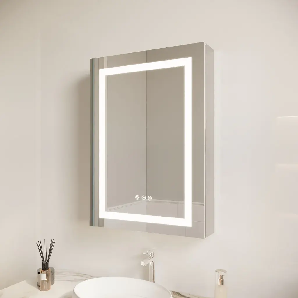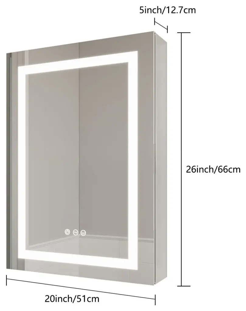 Surface-mounted or recessed-mounted, this medicine cabinet provides essential storage space without sacrificing floor space. Perfect for bathrooms that are a bit small. You can install it over the sink, next to the bathtub, or anywhere else. The mirror frame is made from aluminum alloy material, which is corrosion-resistant. You don''t have to worry about the stability of the structure. There are three touch switches for this cabinet, which control the main light, the anti-fog function respectively, the brightness adjustment, and the color temperature adjustment of the lighting. The independent control function allows users to know how to use it easily. An even mix of classic and contemporary elements, this clean-lined medicine cabinet lets you tuck away items in style. 1.Single door mirror cabinet (2-in-1: embedded&wall mounted)2. Single door double-sided mirror door, with one circle of regular sanding on the mirror door 3.The mirror frame is made from aluminum alloy material, which is corrosion-resistant. You don''t have to worry about the stability of the structure.4.It is equipped with a three button Touch switch to control the main light and anti-fog film and adjust the light+color temperature, 3-color temperature, dimmable led with a long press to adjust the brightness. A lighted medicine cabinet can adjust the brightness from dark to bright according to your preference.5.This medicine cabinet with reasonable shelves to fully maximize storage space and let your bathroom and other scenarios be organized and clean.6.A bathroom medicine cabinet with a mirror provides uniform and optimal bright lighting, which can eliminate harsh shadows and hot spots when you are shaving, brushing your teeth, or putting on makeup.7.An even mix of classic and contemporary elements, this clean-lined medicine cabinet lets you tuck away items in style.8.The hinge is designed to slowly open and close, providing safety and care for you.