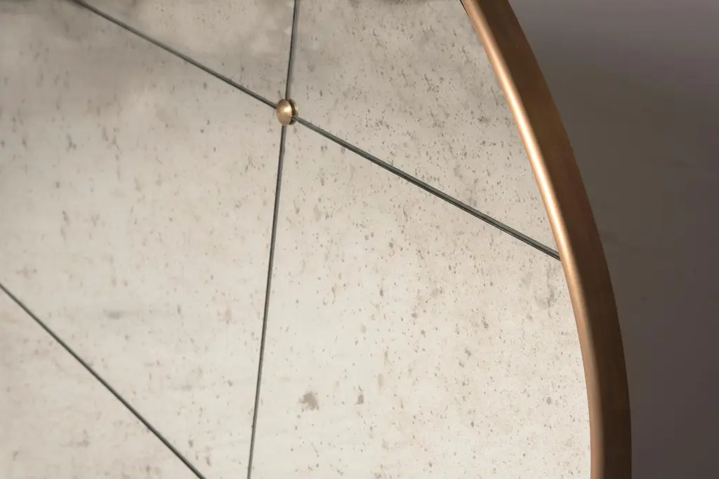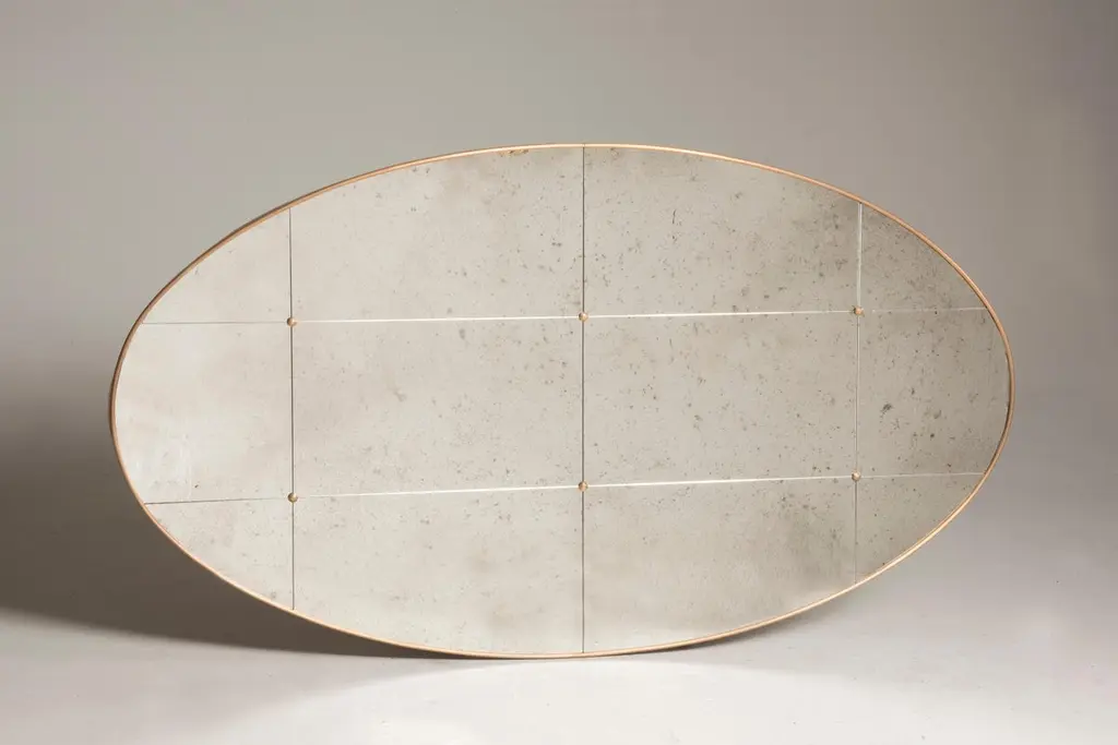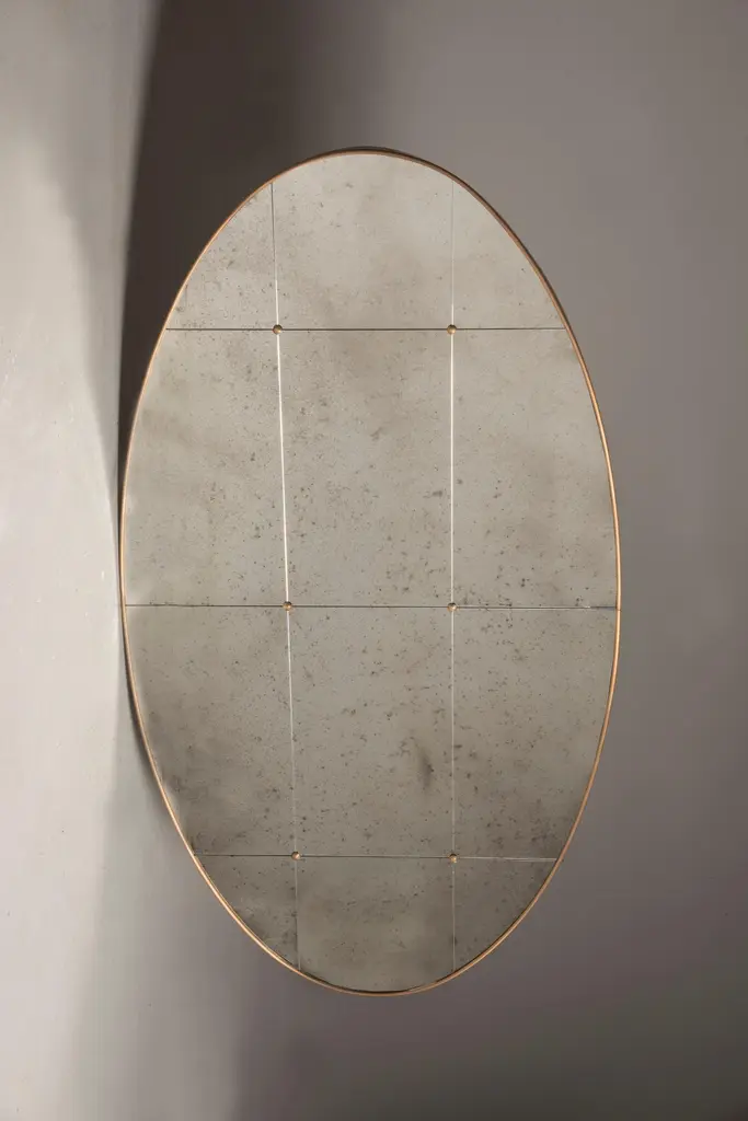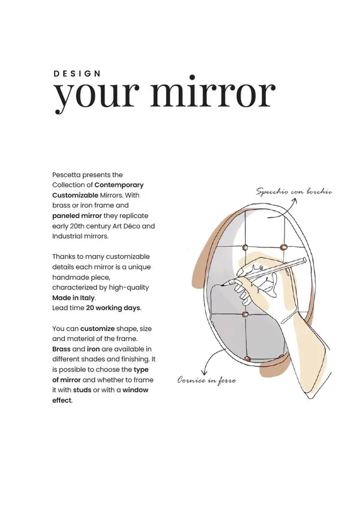 Pescetta presents its collection of contemporary customizable mirrors. With brass frame, window pane look and brass studs these mirrors replicate the idea of early 20th century Art Deco style mirrors. They suit both modern spaces which need a touch of elegance and very classical rooms which needs a wall decoration. They can be hanged in both directions or kept on the floor as floor mirrors. Each mirror is a unique handmade piece, characterized by Italian quality and taste.Lead time 20 business days.Worldwide shipment within 2 weeks.Price here refers to a mirror with following characteristics:shape: ovalBrass frame: simple profileBrass finishing: aged effectMirror panels: window look with studsMirror: aged effect glass - black and white typeAccessories: rounded studsSize: 200 x 11o cm / 78.74" x 43.30"Many details are customizable:Frame size and shape: squared, rectangular, oval, rounded, hexagonal, octagonal.Brass frame: simple profile or double profile.Brass finishing: shiny or aged effect (little bit darker)Mirror panels: unique glass panel or window look ( with studs or profiles)Mirror: Classic, aged effect, beveled, smoked or bronze.Accessories: studs, hangers (to transform the mirror into a coat rack), lights.Mirrors a) Classic: normal silver color mirror. b) Smoked: Smoke grey (cold effect) distortion of reflected colors. c) Bronze: Bronze (warm effect) distortion of reflected colors. d) Black and white: Classic silver base and several small spots. Most used one, light distressed effect, clear vision, no distortion of reflected colors. e) Black and white / Bronze: bronze base and several small spots. Warm bronze dis-tortion of reflected colors. f) Silver: strong distressed look, silver base with large spots as per mirrors from 18th century. Blurred vision in the complex. g) Saturn: medium distressed look, silver base and several large light spots. Reflected colors are darker in complex. h) Antique Venetian: several light spread big spots which gently turn reflected colors into powder pink tone. Low distressed look.