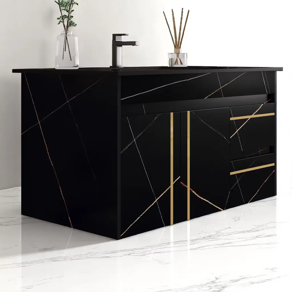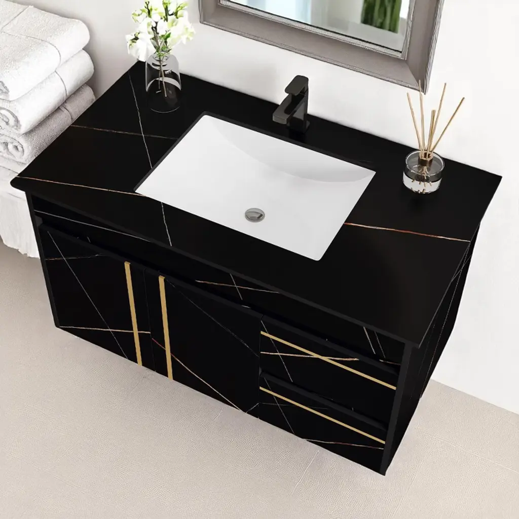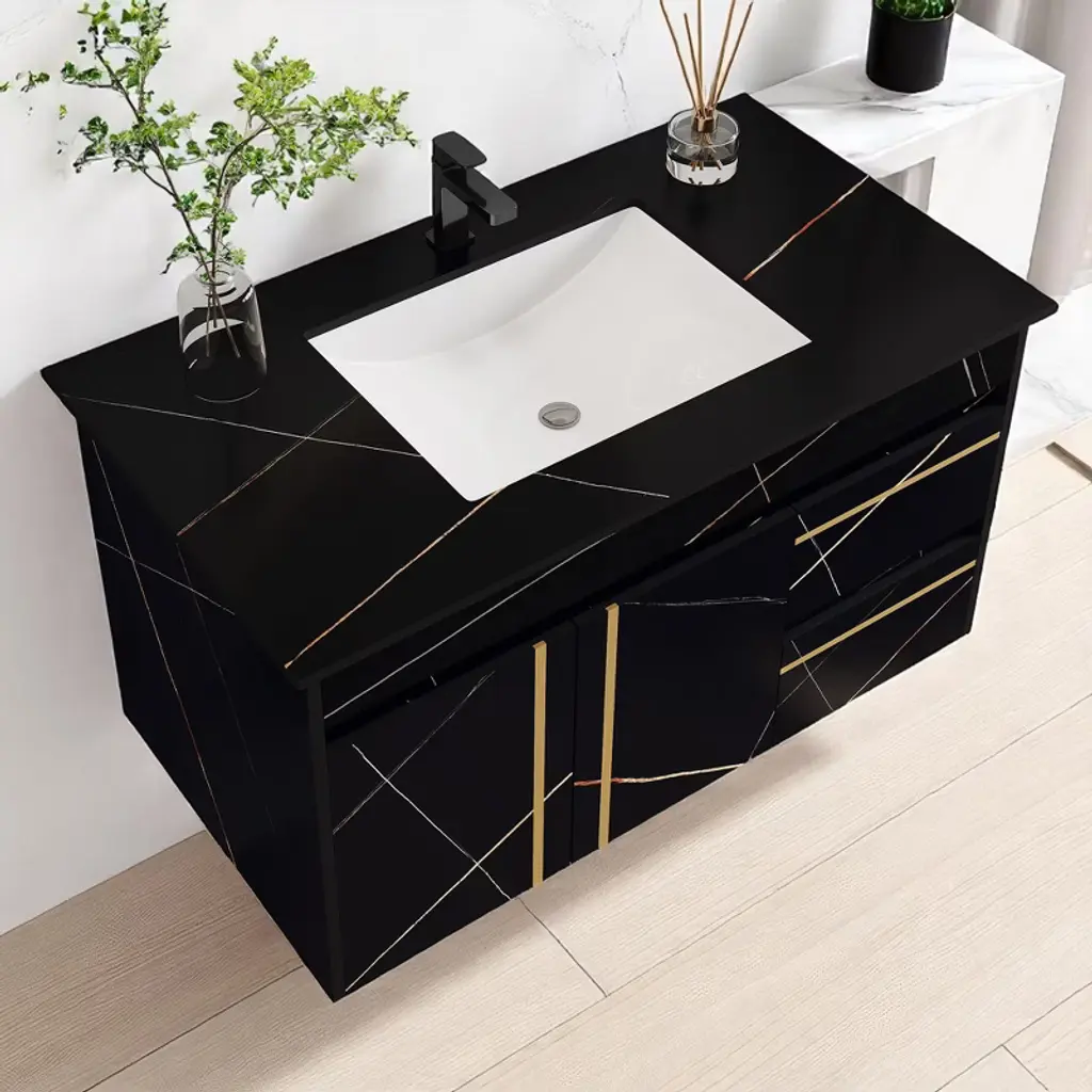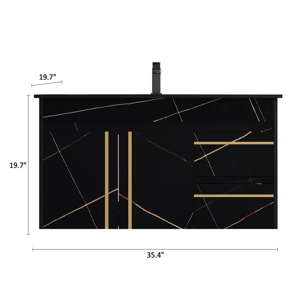 Product OverviewElevate your bathroom with this 35.4"" wall-mounted vanity, expertly designed for modern aesthetics and space efficiency. Featuring a luxurious faux marble top, undermount ceramic sink, and soft-close storage options, this floating vanity is perfect for urban homes, contemporary powder rooms, or compact master baths. The smooth black MDF cabinet adds a sleek visual contrast, while the wall-hung design maximizes floor space and ease of cleaning. (Mirror and faucet not included. Mounting bracket included.)Product FeaturesEngineered Stone Vanity Top: Durable faux marble top crafted from high-quality engineered stone resists stains, scratches, and moisture, while adding an elegant, contemporary touch.Integrated Undermount Ceramic Sink: Includes a seamlessly mounted ceramic sink with clean lines and a thick profile. A 1.38"" single-hole is pre-drilled to fit standard faucets (faucet not included).Soft-Close Storage Solutions: Equipped with two soft-close drawers and one silent-hinge cabinet door for smooth, quiet functionality and enhanced user comfort. Keep your bathroom essentials organized and out of sight.Space-Saving Wall-Mounted Design: The floating vanity provides a minimalist, airy appearance while freeing up floor space for easier cleaning and a larger feel in smaller bathrooms.Adjustable Drain Pipe: Includes a drain pipe that can be extended up to 31.5"" (80cm) to accommodate different plumbing layouts.Modern Finishes & Durability: Made with premium MDF and finished in matte black for a refined look. Built to withstand humid environments while offering long-lasting performance.Easy Pairing: Compatible with 1.38"" (35mm) single-hole faucets, allowing for effortless integration with your chosen hardware style.SpecificationsProduct Type: Wall-Mounted Bathroom VanityMain Color: BlackSink Type: Undermount Oval Ceramic SinkVanity Top: Faux Marble Engineered StoneCabinet Material: MDF with Painted FinishDimensions: 35.4"" W x 19.7"" D x 19.7"" H (900mm W x 500mm D x 500mm H)Weight: 77 lbsAssembly Required: Yes – Mounting bracket includedFaucet Compatibility: Standard 1.38"" (35mm) single-holeShipping: Ships securely in protective packagingSuitable ScenariosIdeal for small to mid-size bathrooms, powder rooms, and apartment bathroomsPerfect for remodels or contemporary bathroom upgradesGreat for spaces that benefit from space-saving, floating cabinetryNotesFaucet and mirror not included.Due to lighting and display variations, product color and finish may differ slightly from images.Installation by a professional is recommended for optimal results.
