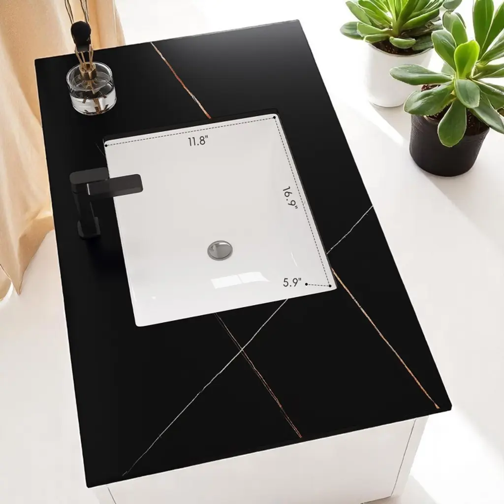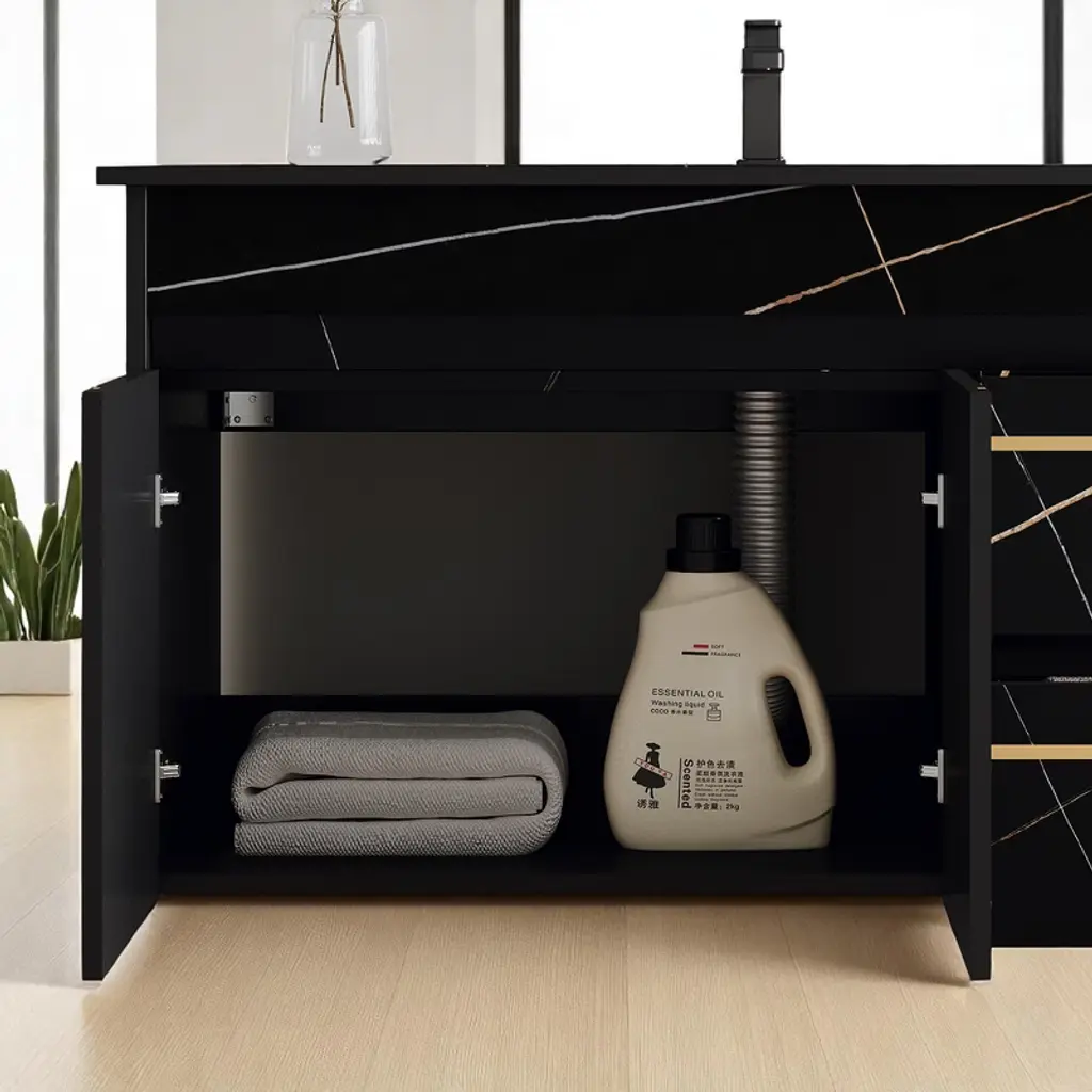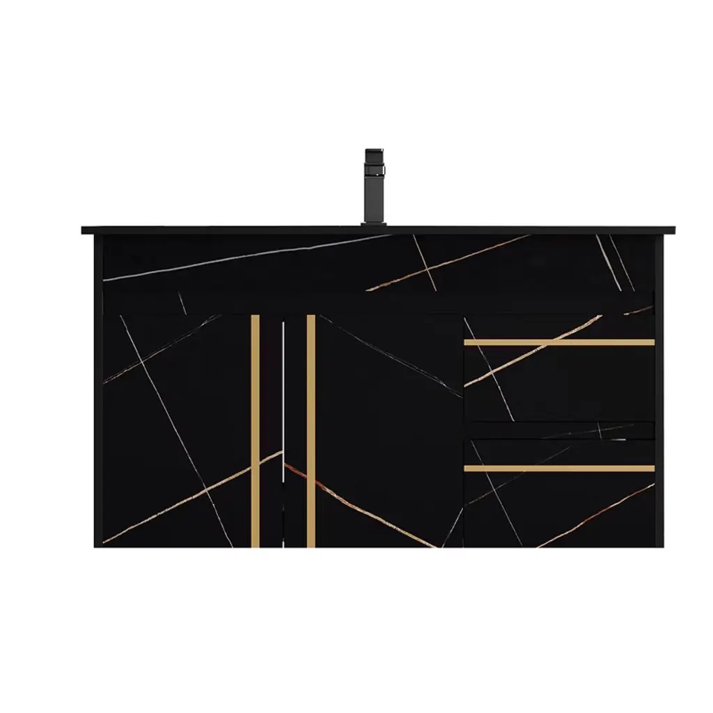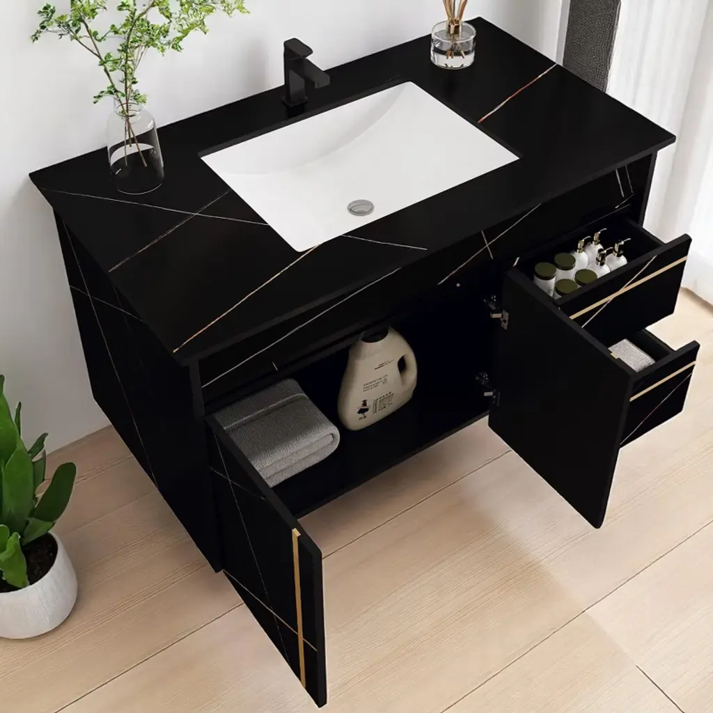 Product OverviewElevate your bathroom with this 35.4"" wall-mounted vanity, expertly designed for modern aesthetics and space efficiency. Featuring a luxurious faux marble top, undermount ceramic sink, and soft-close storage options, this floating vanity is perfect for urban homes, contemporary powder rooms, or compact master baths. The smooth black MDF cabinet adds a sleek visual contrast, while the wall-hung design maximizes floor space and ease of cleaning. (Mirror and faucet not included. Mounting bracket included.)Product FeaturesEngineered Stone Vanity Top: Durable faux marble top crafted from high-quality engineered stone resists stains, scratches, and moisture, while adding an elegant, contemporary touch.Integrated Undermount Ceramic Sink: Includes a seamlessly mounted ceramic sink with clean lines and a thick profile. A 1.38"" single-hole is pre-drilled to fit standard faucets (faucet not included).Soft-Close Storage Solutions: Equipped with two soft-close drawers and one silent-hinge cabinet door for smooth, quiet functionality and enhanced user comfort. Keep your bathroom essentials organized and out of sight.Space-Saving Wall-Mounted Design: The floating vanity provides a minimalist, airy appearance while freeing up floor space for easier cleaning and a larger feel in smaller bathrooms.Adjustable Drain Pipe: Includes a drain pipe that can be extended up to 31.5"" (80cm) to accommodate different plumbing layouts.Modern Finishes & Durability: Made with premium MDF and finished in matte black for a refined look. Built to withstand humid environments while offering long-lasting performance.Easy Pairing: Compatible with 1.38"" (35mm) single-hole faucets, allowing for effortless integration with your chosen hardware style.SpecificationsProduct Type: Wall-Mounted Bathroom VanityMain Color: BlackSink Type: Undermount Oval Ceramic SinkVanity Top: Faux Marble Engineered StoneCabinet Material: MDF with Painted FinishDimensions: 35.4"" W x 19.7"" D x 19.7"" H (900mm W x 500mm D x 500mm H)Weight: 77 lbsAssembly Required: Yes – Mounting bracket includedFaucet Compatibility: Standard 1.38"" (35mm) single-holeShipping: Ships securely in protective packagingSuitable ScenariosIdeal for small to mid-size bathrooms, powder rooms, and apartment bathroomsPerfect for remodels or contemporary bathroom upgradesGreat for spaces that benefit from space-saving, floating cabinetryNotesFaucet and mirror not included.Due to lighting and display variations, product color and finish may differ slightly from images.Installation by a professional is recommended for optimal results.