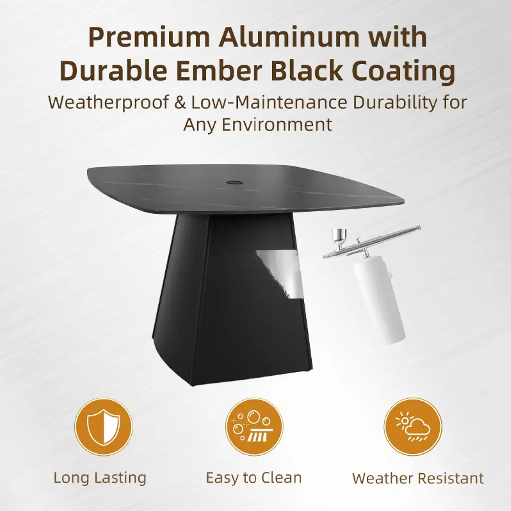 Enhance your outdoor dining space with the Koiai 44" Modern Patio Dining Table, a bold blend of sculptural elegance, modern utility, and high-performance materials. Designed to comfortably seat four, this 44 inch outdoor dining table for 4 is the ideal centerpiece for patios, balconies, gardens, or terraces where design and durability matter. The tabletop is crafted from premium sintered stone, available in classic Black or White finishes, each featuring seamless natural veining inspired by Greek marble. This square sintered stone patio table offers a low-maintenance surface that's fade-resistant, heat- and scratch-resistant, and built to withstand all weather conditions without sacrificing style. Smooth edges and gently rounded corners not only elevate the aesthetic but also add comfort and safety to your dining experience. The flared pyramid pedestal base, made of heavy-duty rust-proof aluminum and finished in Ember Black powder coating, anchors the table with sculptural strength and contemporary flair. The base mirrors the subtle curvature of the tabletop, creating a sleek, harmonious silhouette that complements any modern outdoor setup. A 2" umbrella hole with a matching aluminum cover adds practical shade compatibility, making this modern outdoor table with umbrella hole a smart and stylish choice for sunny settings. Engineered for both indoor and outdoor use, this table includes adjustable, scratch-resistant foot pads that stabilize the frame on uneven surfaces while protecting your floors. Whether you're hosting a dinner party under the stars or enjoying a quiet morning coffee outdoors, the Koiai table delivers performance, presence, and premium craftsmanship.