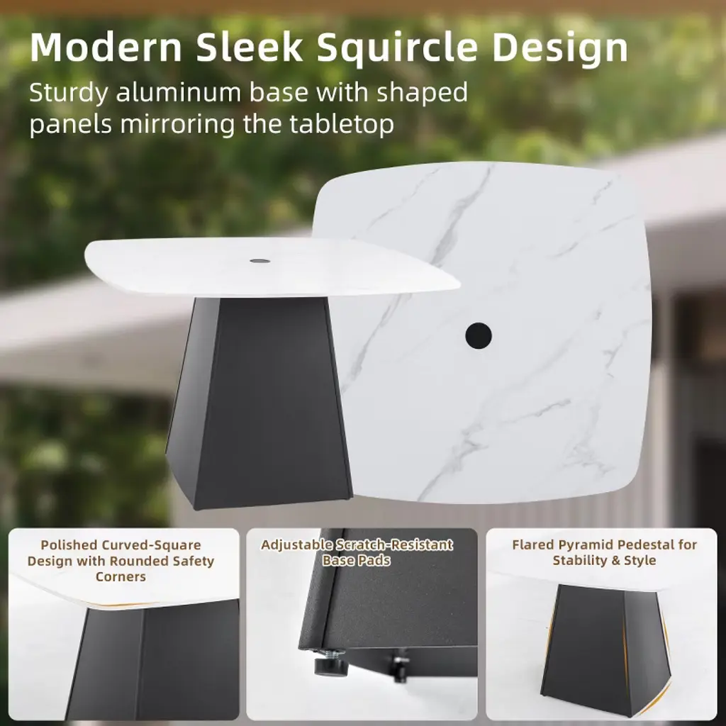 Enhance your outdoor dining space with the Koiai 44" Modern Patio Dining Table, a bold blend of sculptural elegance, modern utility, and high-performance materials. Designed to comfortably seat four, this 44 inch outdoor dining table for 4 is the ideal centerpiece for patios, balconies, gardens, or terraces where design and durability matter. The tabletop is crafted from premium sintered stone, available in classic Black or White finishes, each featuring seamless natural veining inspired by Greek marble. This square sintered stone patio table offers a low-maintenance surface that's fade-resistant, heat- and scratch-resistant, and built to withstand all weather conditions without sacrificing style. Smooth edges and gently rounded corners not only elevate the aesthetic but also add comfort and safety to your dining experience. The flared pyramid pedestal base, made of heavy-duty rust-proof aluminum and finished in Ember Black powder coating, anchors the table with sculptural strength and contemporary flair. The base mirrors the subtle curvature of the tabletop, creating a sleek, harmonious silhouette that complements any modern outdoor setup. A 2" umbrella hole with a matching aluminum cover adds practical shade compatibility, making this modern outdoor table with umbrella hole a smart and stylish choice for sunny settings. Engineered for both indoor and outdoor use, this table includes adjustable, scratch-resistant foot pads that stabilize the frame on uneven surfaces while protecting your floors. Whether you're hosting a dinner party under the stars or enjoying a quiet morning coffee outdoors, the Koiai table delivers performance, presence, and premium craftsmanship.