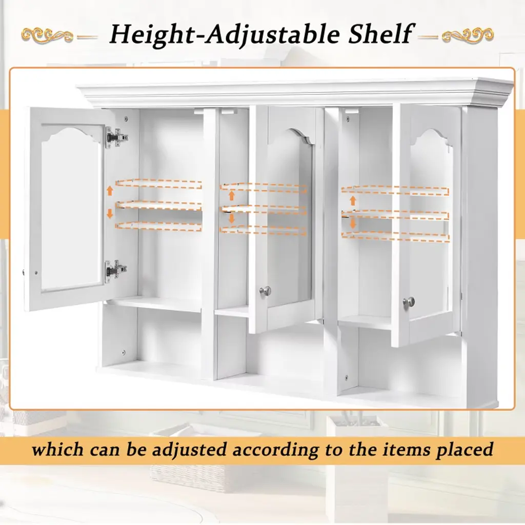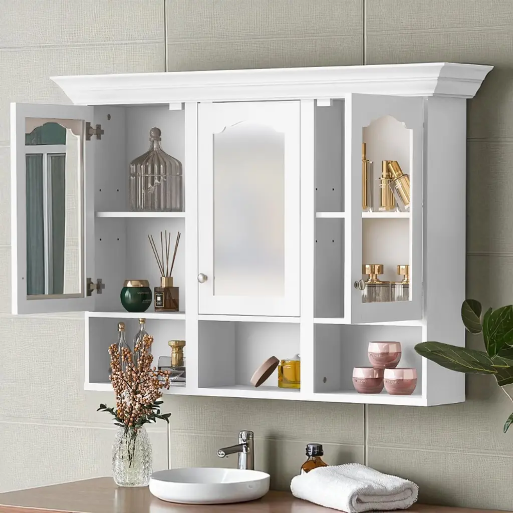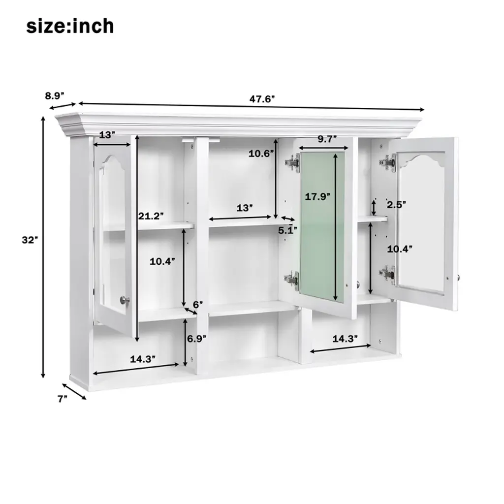 Product Overview Maximize bathroom space with this 47-inch wall-mounted storage cabinet featuring a large mirror, 3 glass doors, and 3 open compartments. With adjustable shelves and durable solid wood + MDF construction, this modern cabinet blends functionality with sleek style, keeping your essentials neatly stored while enhancing bathroom décor. Specifications Product Type: Wall Cabinet / Medicine Cabinet Main Material: Solid Wood + MDF Use Case: Bathroom Doors Included: Yes (3) Shelves Included: Yes (5+ Adjustable) Capacity: Overall 150 lbs / Per Panel 50 lbs Hardware: Metal Assembly: Required (instructions & hardware included) Product Features ✔ 2-in-1 Mirror & Cabinet – Combines a large mirror with enclosed storage, offering both style and practicality. ✔ Flexible Storage – 6 shelves in total, 3 of which are adjustable, plus 3 open compartments for towels or frequently used items. ✔ Space-Saving Design – Wall-mounted above sink or toilet, saving valuable floor space in compact bathrooms. ✔ Modern Aesthetic – Clean lines and smooth painted finish match contemporary or classic bathroom interiors. ✔ Durable Construction – Solid wood + MDF frame with moisture-resistant coating ensures long-lasting use. ✔ Easy Assembly & Maintenance – Numbered panels, step-by-step instructions, and a water-resistant surface for effortless setup and cleaning. Product Dimensions Overall: 47.80'' L x 8.90'' W x 32.00'' H Weight: 55.56 lbs Suitable Scenarios Ideal for bathrooms of all sizes, especially compact layouts. Perfect for installation above toilets, vanities, or sinks to store toiletries, towels, and everyday essentials while maintaining a tidy appearance. Notes 1. Real product color may slightly vary due to lighting or monitor settings. 2. Manual measurement has been used; slight differences may occur. Why Choose This ✔ Combines mirror + storage in one ✔ Adjustable shelves for versatile use ✔ Open compartments for breathable towel storage ✔ Durable solid wood + MDF build ✔ Sleek wall-mounted design saves space