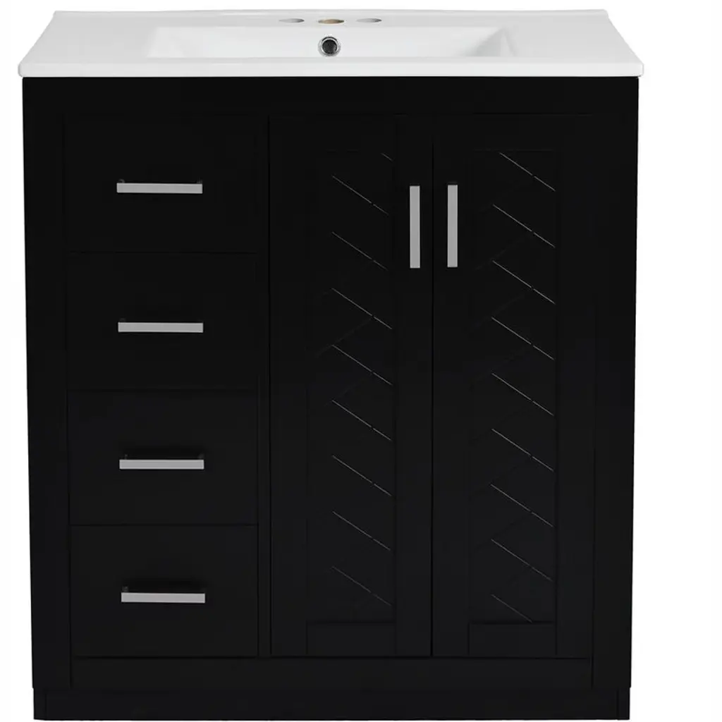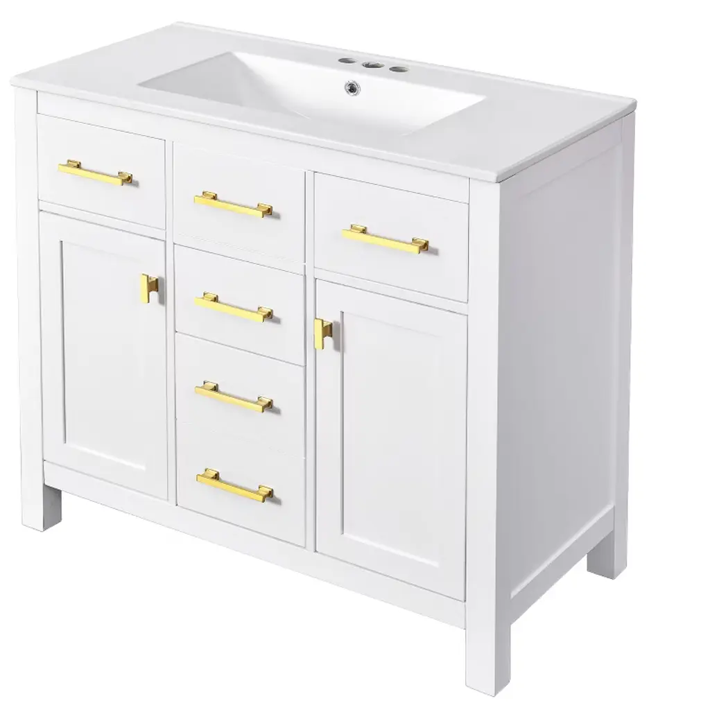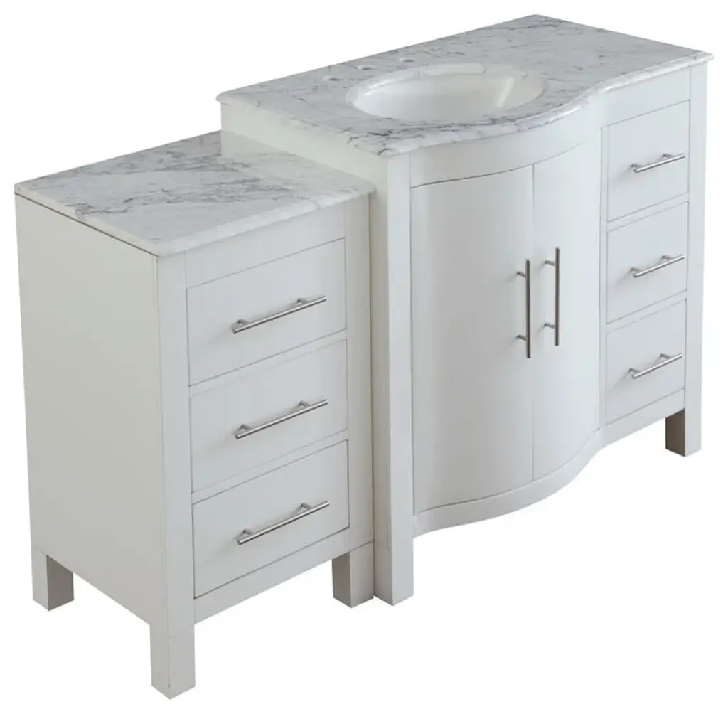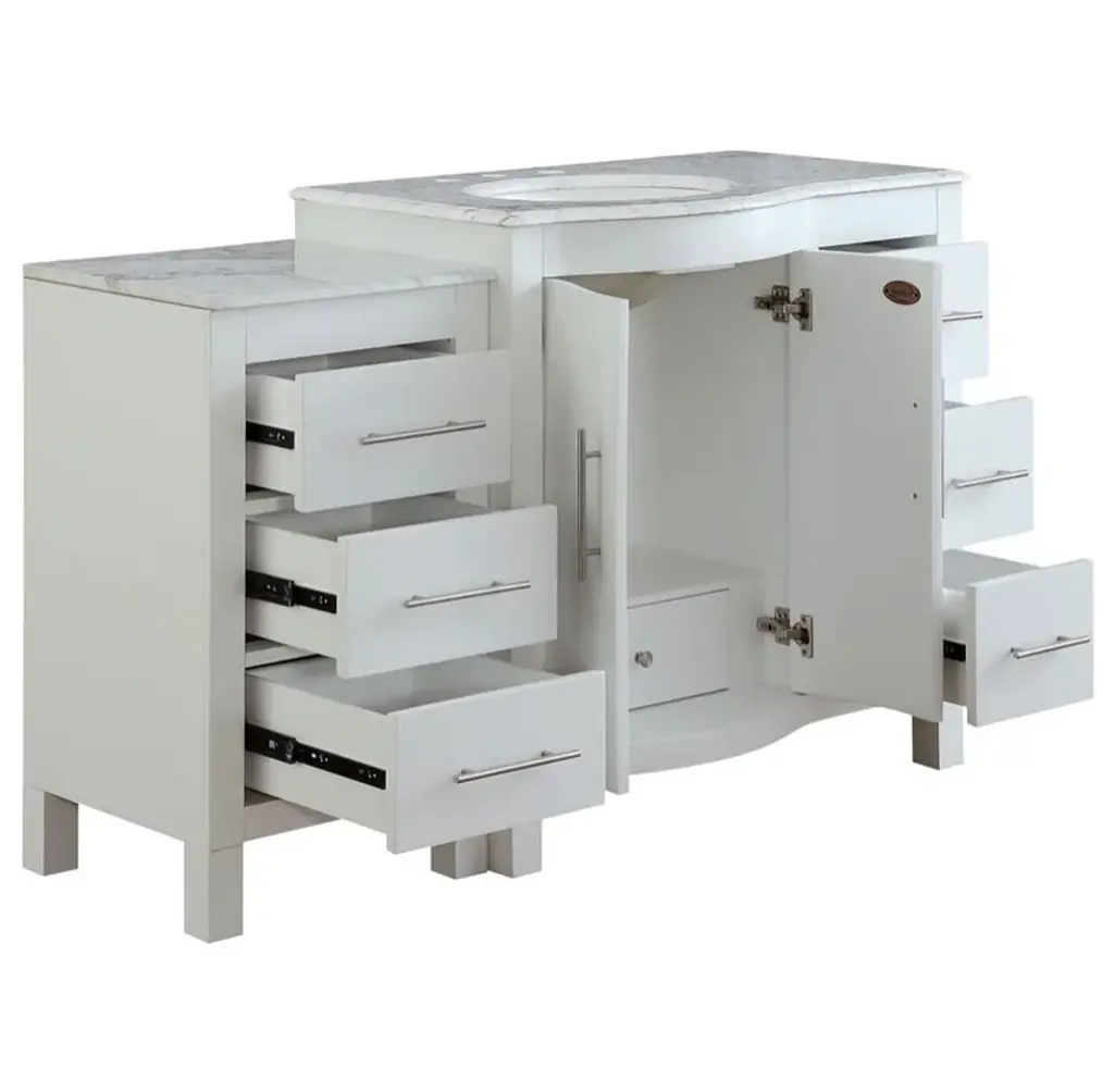 Silkroad Exclusive 53.5-inch Carrara White Marble Top Single Sink Bathroom Vanity with LEFT Offset Sink - V0290WW54L Dimensions: 53.5 W X 22 D X 36 H (Tolerance: +/- 1/2 INCH); Counter Top: Carrara White Marble; Finish: White; Features: 2 Doors, 6 Drawers; Hardware: Brushed Nickel; Sink(s): Oval Undermount White Ceramic; Faucet: Pre-Drilled for Standard Three Hole 8" Center (Not Included); Assembly: Fully Assembled; Large cut out in back for plumbing; Included: Cabinet, Sink; Not Included: Faucet, BacksplashIncluded: Base Cabinet, CountertopNot Included: Backsplash, FaucetDimensions: 53.5 W X 22 D X 36 H (Tolerance: +/- 1/2 INCH)Style: ModernVanity Type: Vanity with TopMounting Type: FreestandingCountertop Included: YesTop Material: Carerra White MarbleBacksplash Included: NoSink(s) Included: YesNumber of Sinks: One SinkSink Type: Oval Undermount White CeramicSink Material: CeramicSink Dimensions: N/AFaucet Included: NoFaucet Type: WidespreadFaucet Holes Per Sink: 3Overflow Drain Included: NoBase Material: Solid Wood Structure & TSCA Title VI Certified PanelsFinish: WhiteWood Tone: Light WoodNumber of Drawers: 6Dovetail Drawers: NoNumber of Doors: 2Soft Close Doors: NoNumber of Shelves: 0Shelves Adjustable: NoShelves Removable: NoHardware Finish: Brushed NickelMirror Included: NoAdditional Details:Open back fits all plumbing typesHandles and pulls are shipped screwed to the inside of each door or drawer; simply unscrew and attach them to the outsideDo not use harsh cleaning productsDo not use products that contain lemon, vinegar or other acidsProlonged exposure to sunlight may cause discolorationPeriodic resealing is recommended for marble topsAccommodates a standard size drain and p-trap (sold separately)Adjustable levelers/feet are easy to install and included for floor protection