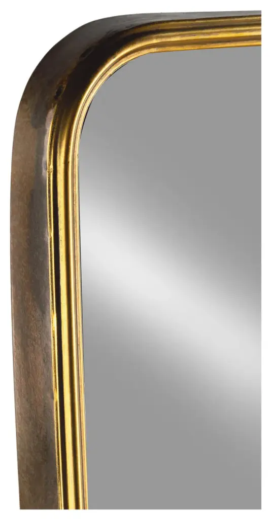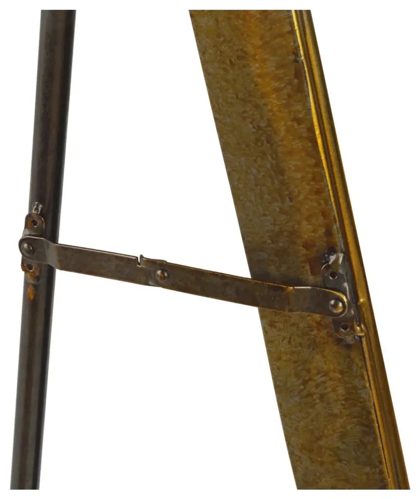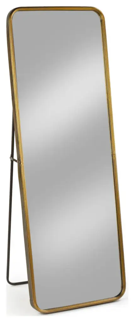 A modern mirror featuring a burnished gold simple frame surrounding a 54" tall by 18" wide mirror. Use with the easel back or lean against a wall. The back features an MDF protective panel. This simple modern design is perfect in a bedroom or lean it against a wall in a living room or foyer for a touch of extra glam!Easel Back MirrorUse mirror with easel back or lean against a wallOverall Mirror Size Standing: 18"W x 55"HOverall Leaning Height: 54.25"Overall Mirror Only: 18"W x 54"HDecorative Rim/Frame: .625"Protective MDF Backing