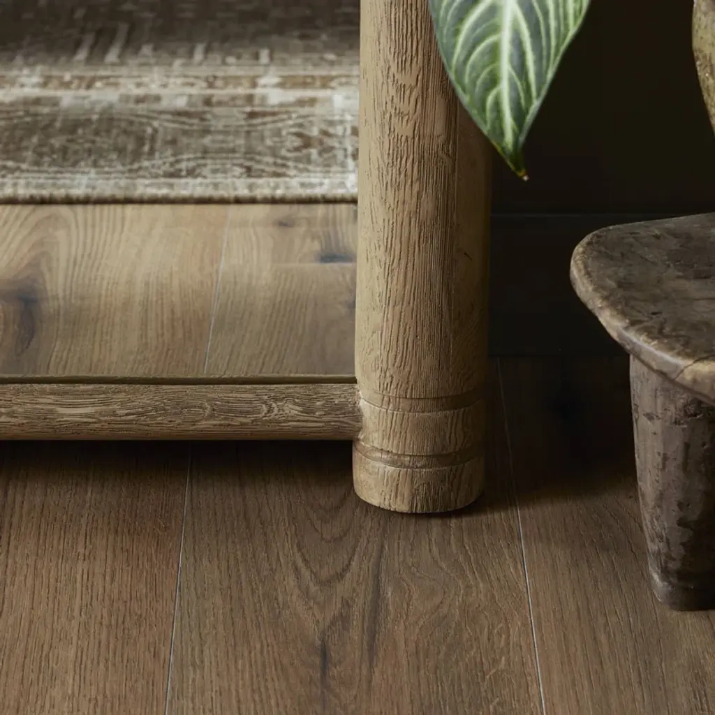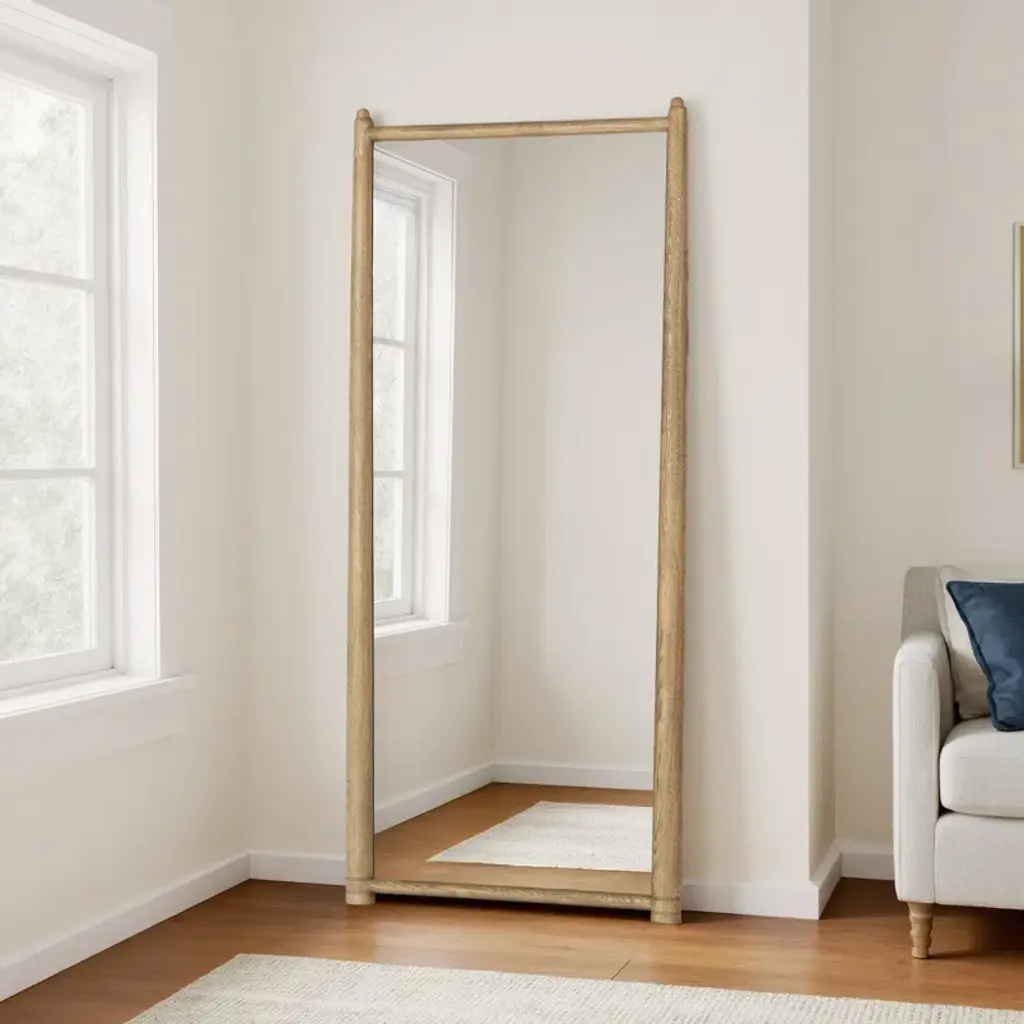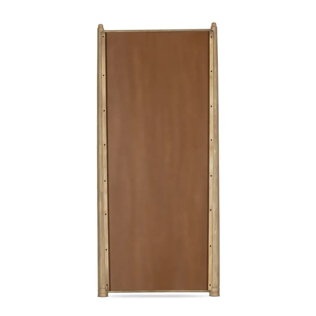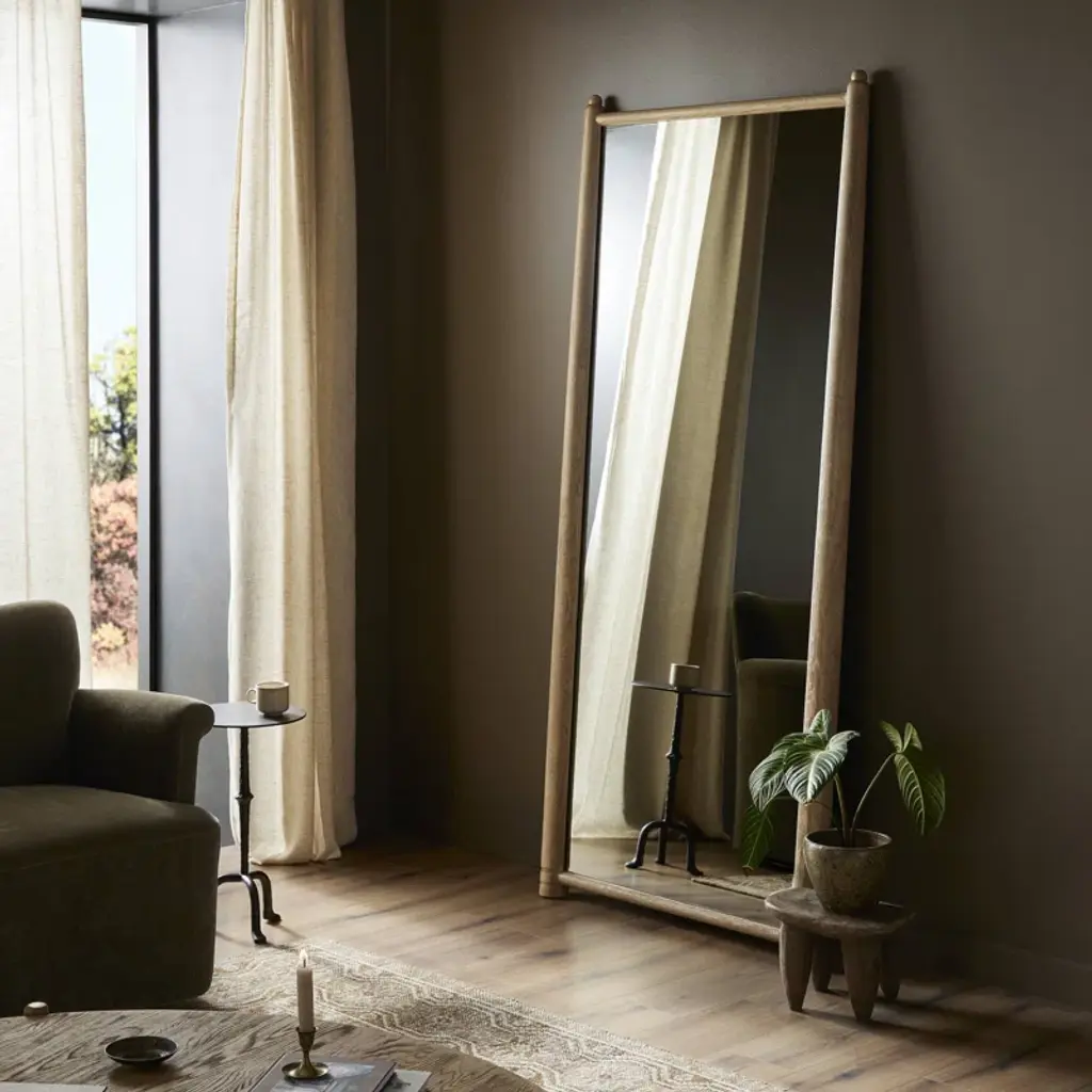 A design collaboration by Amber Lewis and Four Hands. Tapered columns frame this exaggerated floor mirror, finished with carved collar detailing around the feet and carved finials at the top.