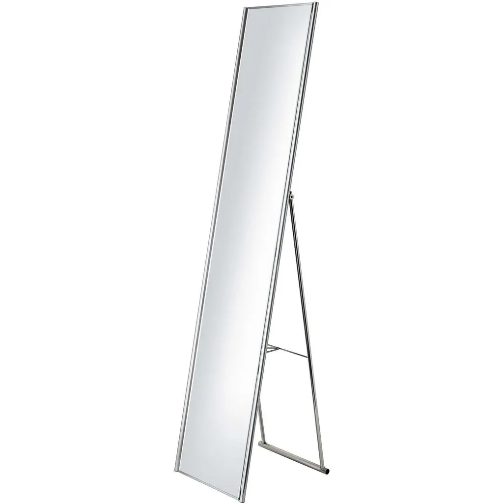 The Alice folding, stand-up mirror has a powder-coated, champagne steel finish. Quarter inch bevel trims give extra detail to the left and right sides of the mirror, whose overall width is 11.25". Overall size: 13.5" width, 59" height, open depth is 14.5" Folds flat to 2" depth for storage
