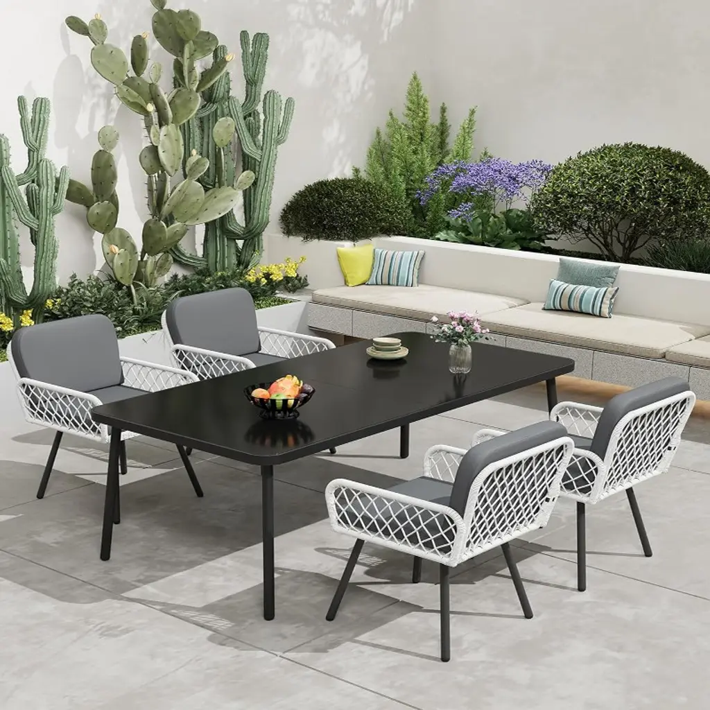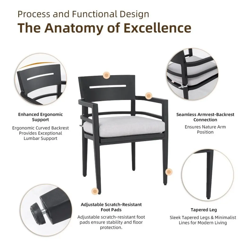 Aluminum Outdoor Dining Table Set For 4, Rounded Square Black Sintered Stone Table And 4 Armchairs With Sunbrella Cushions - Koiai