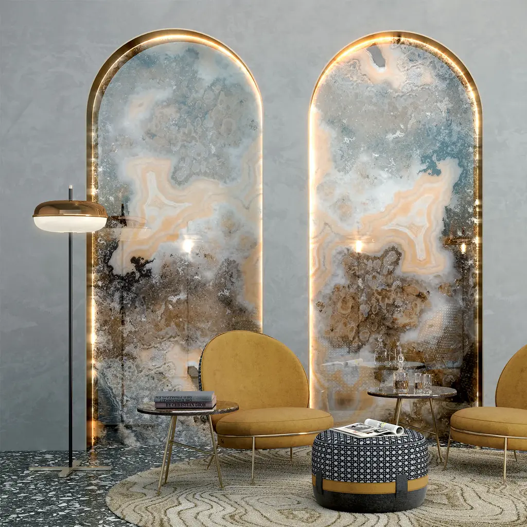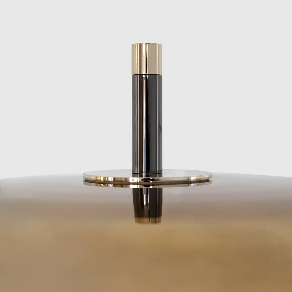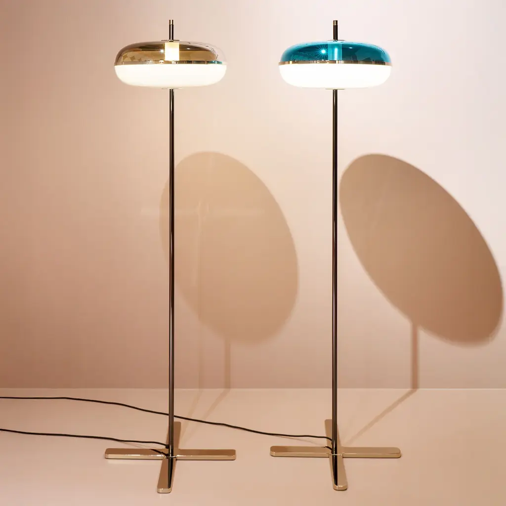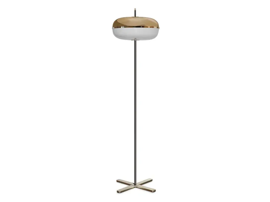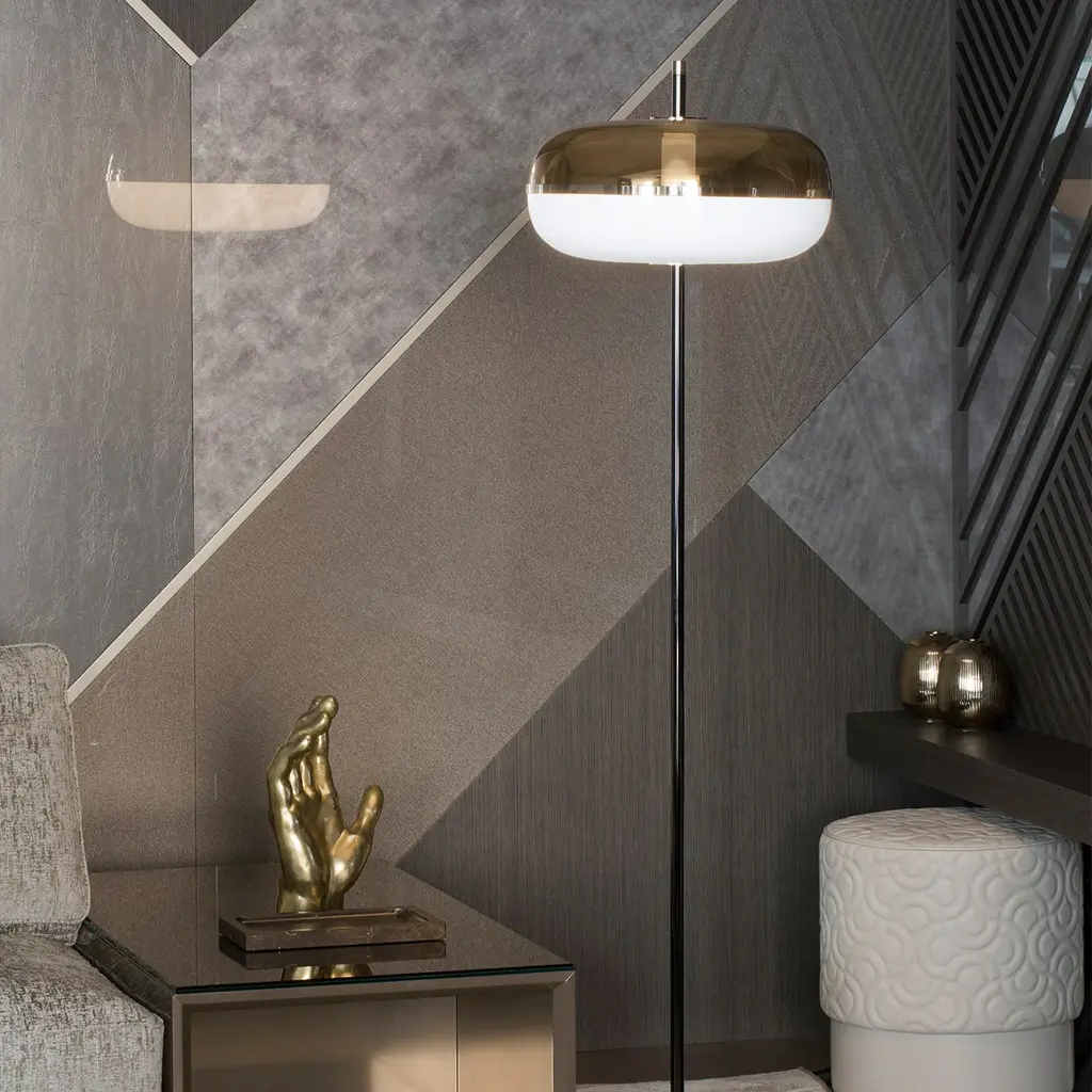 Designed to create unique atmospheres and evoke romantic impressions, this floor lamp is a true masterpiece of the Amaretto Collection, adding a vintage touch to any room in your house. Crafted with a metal structure in glossy black nickel and champagne finishes, its elegance is enhanced by a decorative blown glass fixture in milky white and bronze mirror finishes. This stunning lamp casts a soft and romantic glow, transforming any space into a haven of warmth and intimacy.