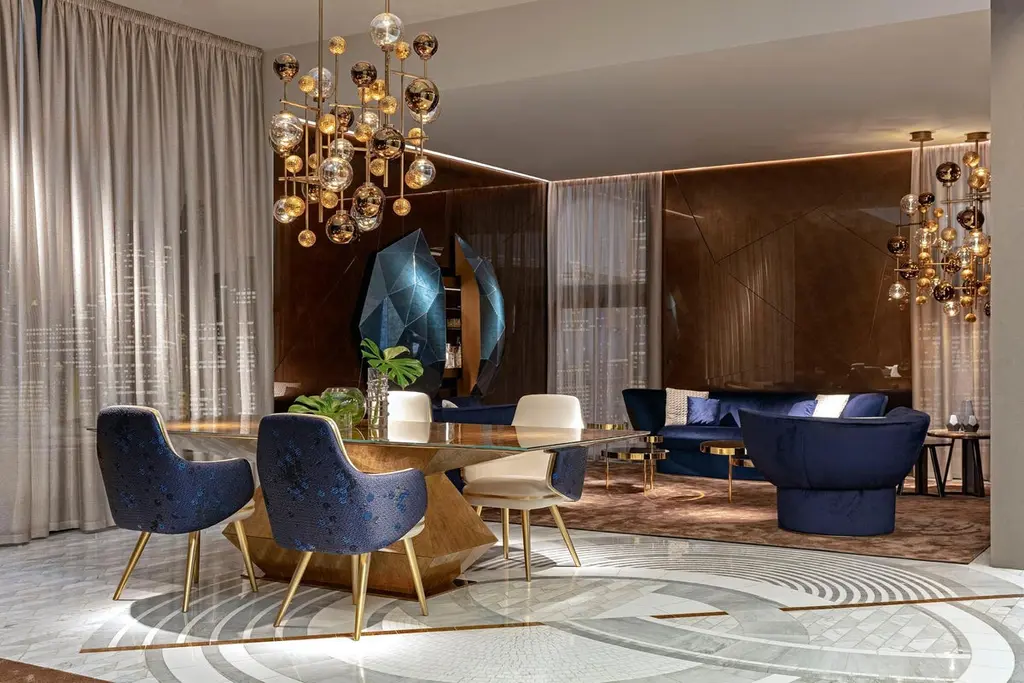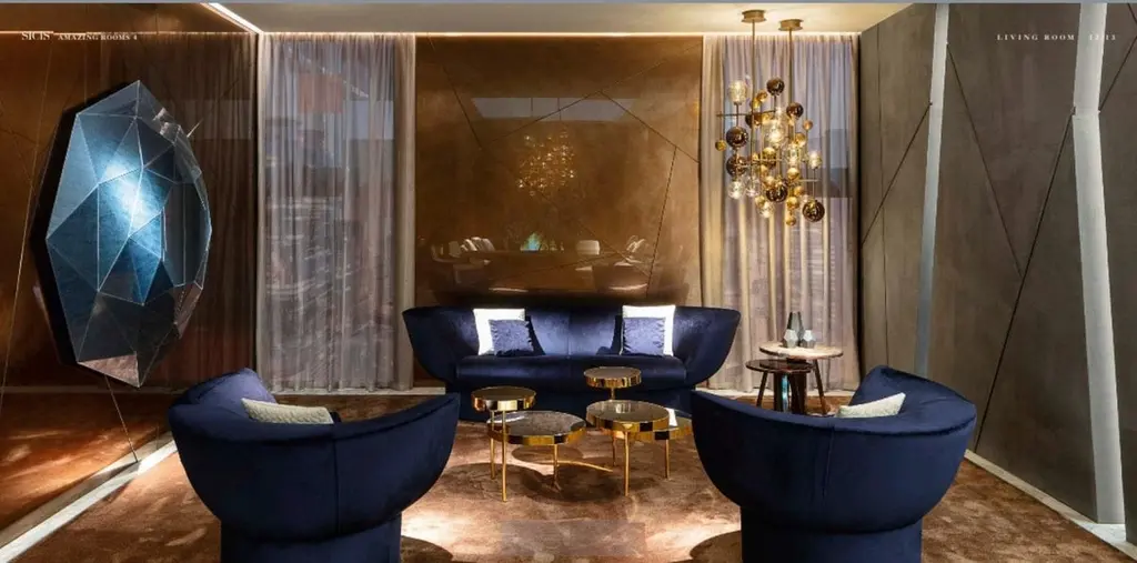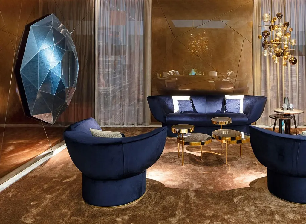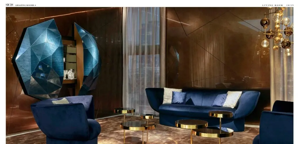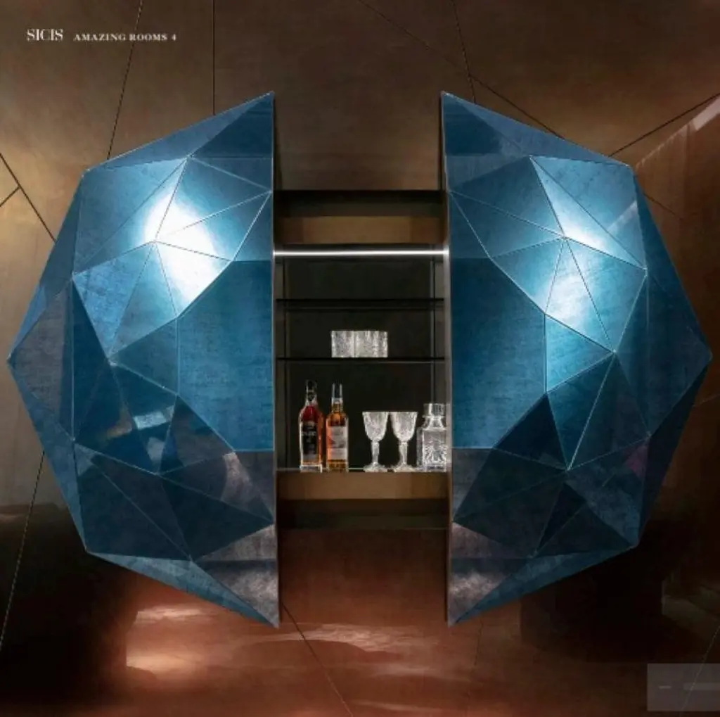 Bar cabinet, doors structure made of polyurethane line with Vetrite cobalt cladding. Interior shelves in bronzed glass and bronzed mirror lined. 3000° K Led lighting inside. Structural aluminum frame fixed on the floor and back wall. Remote control opening. Recess into wall.(Measures: H 225cm at installation).