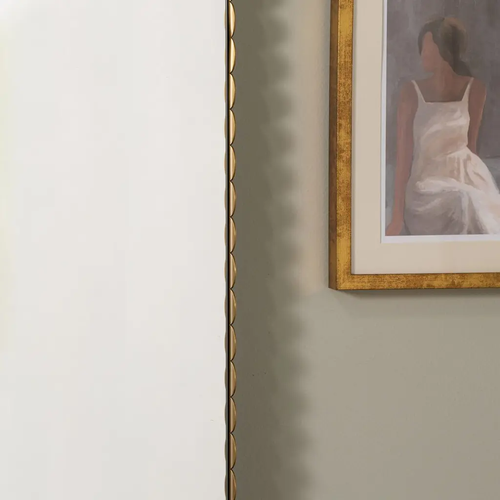 The Ansera Floor Mirror is a stunning addition to any room, designed to enhance your space with its elegant and timeless appeal. Its scalloped metal frame adds a touch of sophistication, making it not only a functional piece but also a statement of style. This mirror captures light beautifully, creating an illusion of space and adding a sense of openness to your home. Perfect for any decor, the Ansera Floor Mirror is a versatile piece that complements a variety of interior styles.