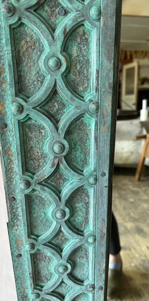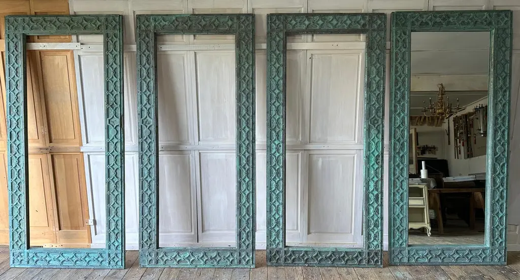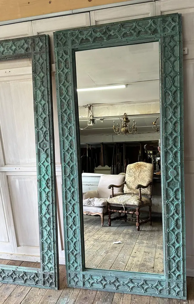 A very special and rare antique French bronze floor full length tall, wall mirror with beautiful green verdigris. The detailed geometric low relief fretwork decorated mirror was once an antique door that has been lovingly restored, reworked and made into mirror panels. This is one of four that is available. They can stand alone or use in a situation where 2, 3 or 4 can work to create a special and unique setting in an important room.Each mirror has some minor loses where hinges or door pulls once were. Detail photos show where these losses are and will also show that it does not take away from these mirrors but only add to its character and importance.\