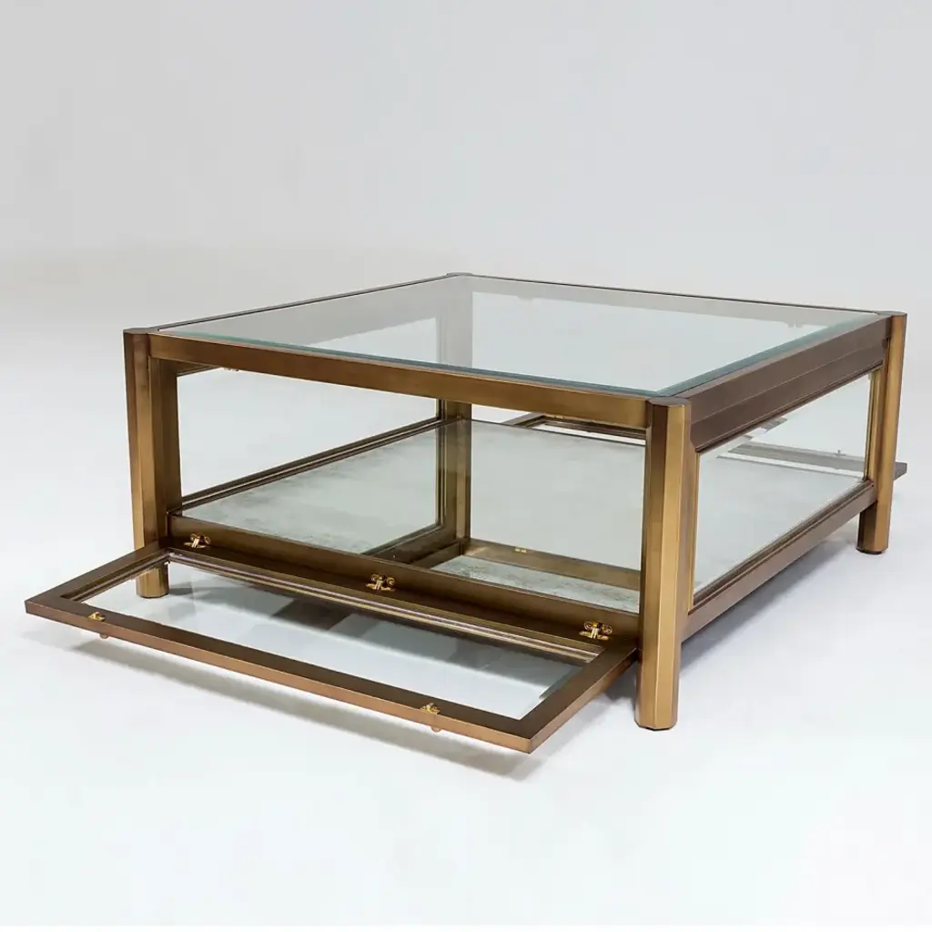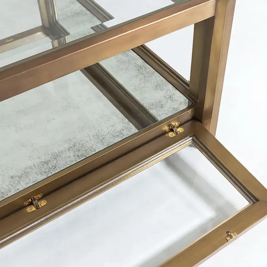 A totally unique and fresh take on an oversized cocktail table. Our Apothecary Cocktail table is made from an MDF frame and support clad in solid thick brass sheet material. The table has two sides with drop front door to allow easy access to the interior of the enclosed cocktail table base. An antique mirror surface covers the interior 'floor' of the table. Small and discreet knobs can be pulled to easily open the sides for access. Apothecary is one term for a medical professional who formulates and dispenses medical materials to physicians, surgeons, and patients. The modern pharmacist (also colloquially referred to as a chemist in British English) has taken over this role. In some languages and regions, the word "apothecary" is still used to refer to a retail pharmacy or a pharmacist who owns one. Apothecaries' investigation of herbal and chemical ingredients was a precursor to the modern sciences of chemistry and pharmacology. This definition of apothecary should help you well imagine how many wonderful, useful, and other oddities could be displayed within this beautiful low oversized cocktail table. From a fashion forward perspective, Global Views offers accessories, furniture, statement lighting, and an assortment of rugs and mirrors to add beauty and joy to your home.