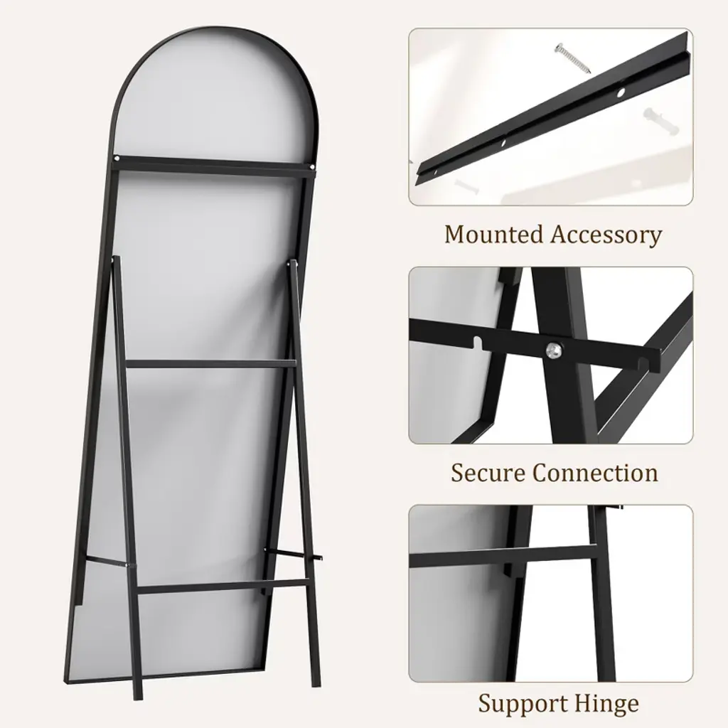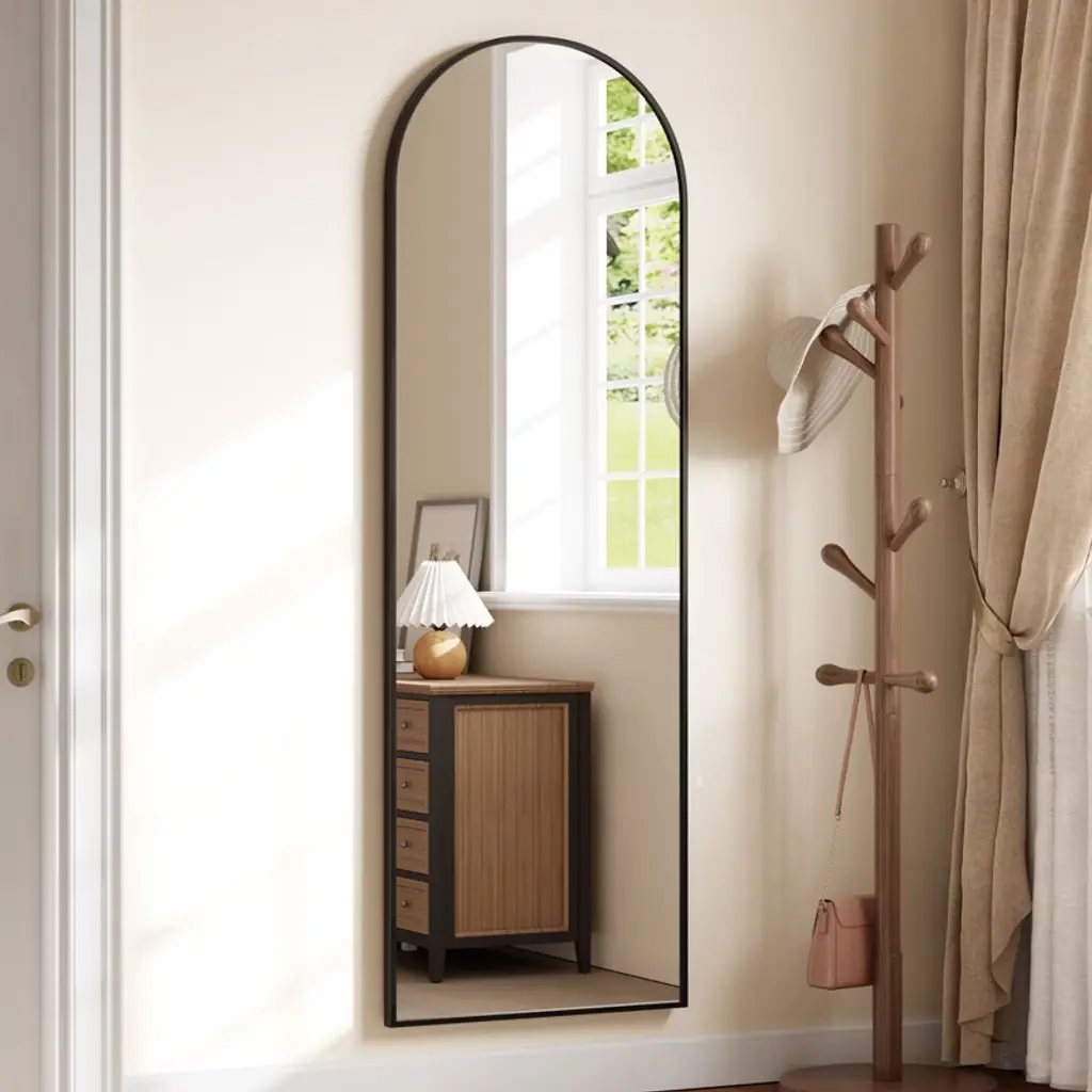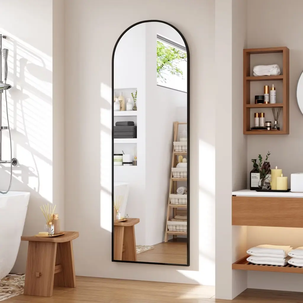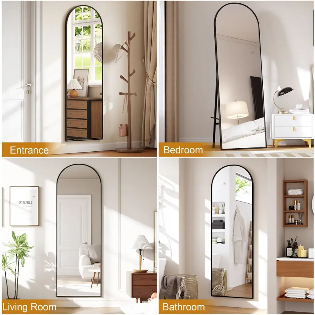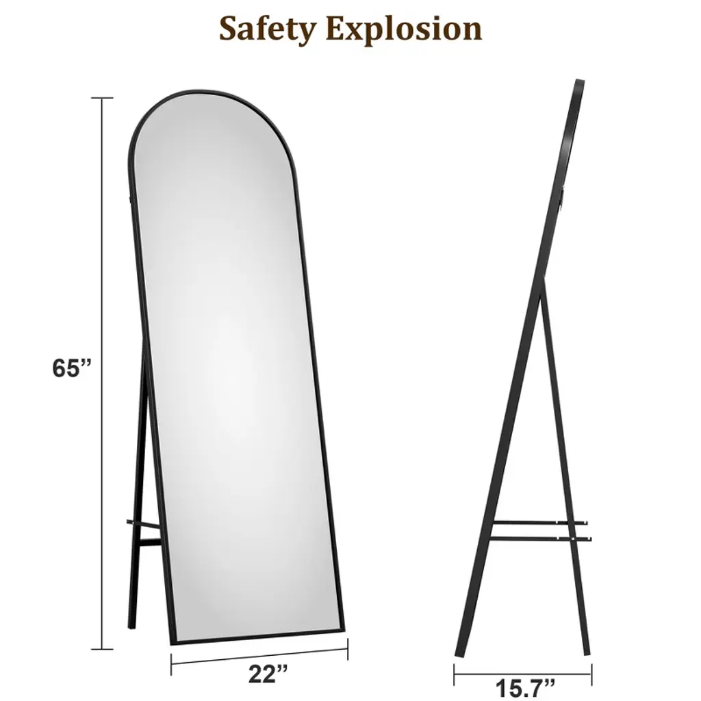 Feature:Elevate your home decor with this arched full length mirror, a perfect blend of style and functionality. Designed with a stunning arched shape, this mirror not only enhances your space but also creates an illusion of a larger room. Its sleek and modern aesthetic makes it an ideal addition to any room.This full floor mirror can be effortlessly placed anywhere in your home. It comes equipped with a sturdy standing holder, allowing it to stand freely on the floor. Prefer a more space-saving solution? Simply lean it against a wall for an elegant look or hang it vertically for a chic mounted style. The choice is yours!The full body mirror features a sturdy frame and a reflective surface that offers a crystal-clear image. It's perfect for dressing up, checking your outfit, or adding brightness to your space.Enjoy the flexibility of moving it around or securely mounting it to fit your home's unique layout. Upgrade your living space with this stunning and practical vanity mirror today! Specification:Size: 65x22 inchesColor: black frame Material: glass+aluminum alloyPackage dimension: 65x26.18x2.76 inches Package weight: 25.36 inches Note: When moving the mirror, please handle it with care. It is best to have two people work together to ensure safety during the move. Regularly check the stability of the mirror frame and hooks to ensure their safety and security. Packing list:Full length mirror x1Hardware bag x1Manual x1