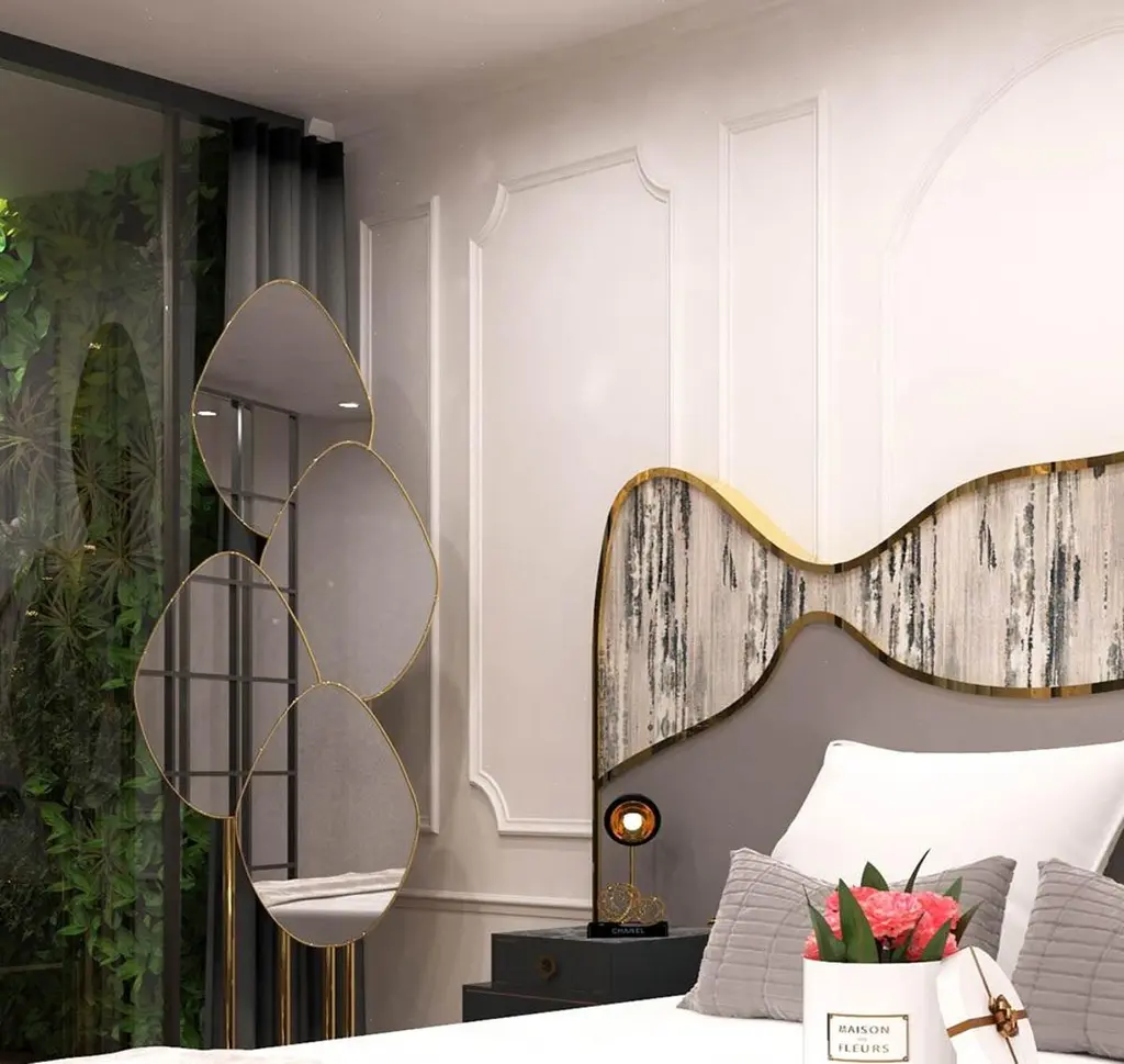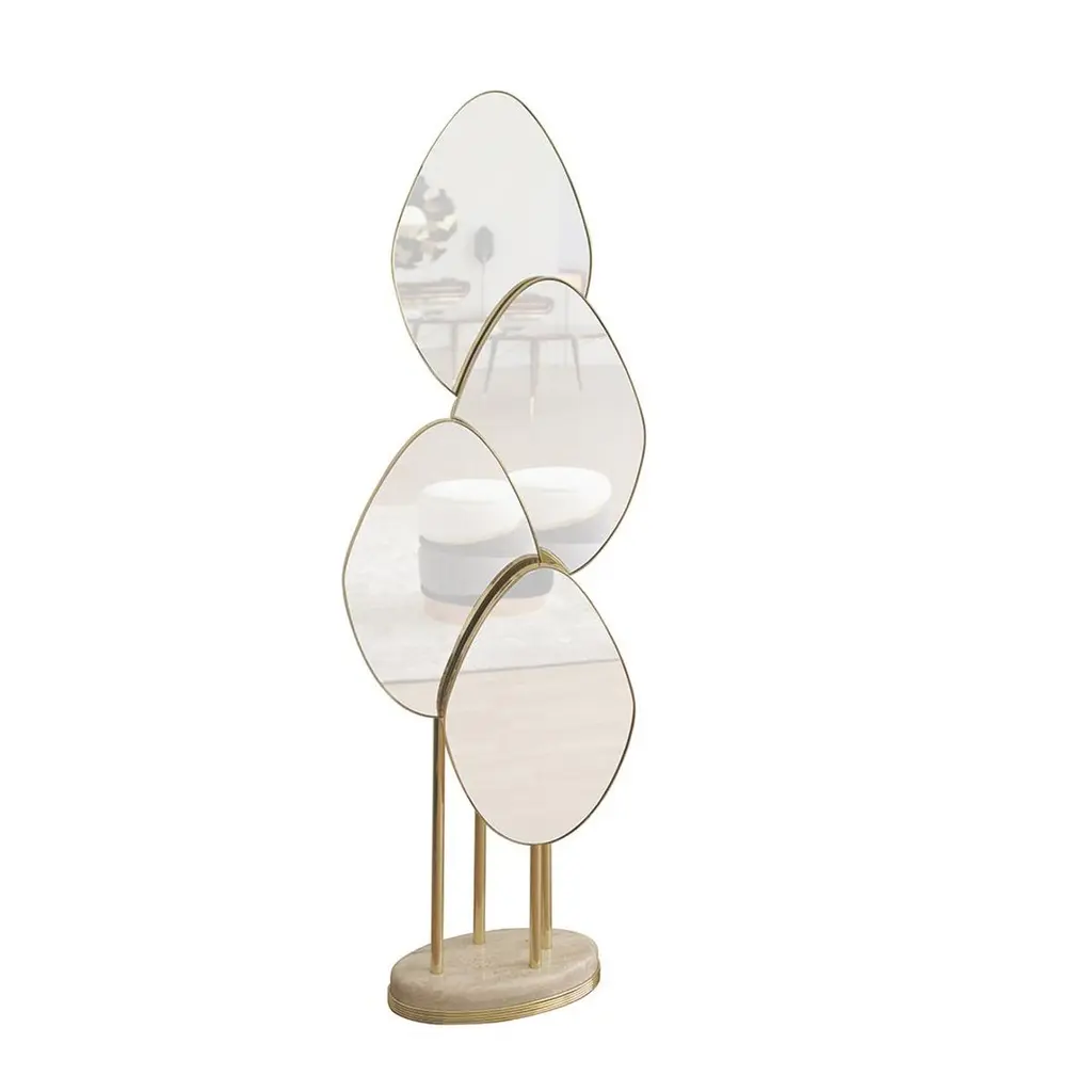 Art deco inspired floor mirror featuring series of polished brass tubes and four leaf shaped overlapping mirrors. The base in Travertino marble. Other metal and marble finishes available upon request.Dimesnions:H: 182 cm 71.6’’ W: 46 cm 18.1’’ D: 23 cm 9’’Materials: Structure tubes in Polished Brass finished with High Gloss Varnish. Clear mirror and marble.Please contact us if you have any questions about customization and pricing. We will be glad to check with the factory’s technical team if sizes, finishes, and colors can be customized. We do our best to expedite production and to ship and deliver product within the listed lead time, however current lead times might be longer due to global shipping backlog and delays. These delays are out of our control and cannot be a reason to cancel an order.