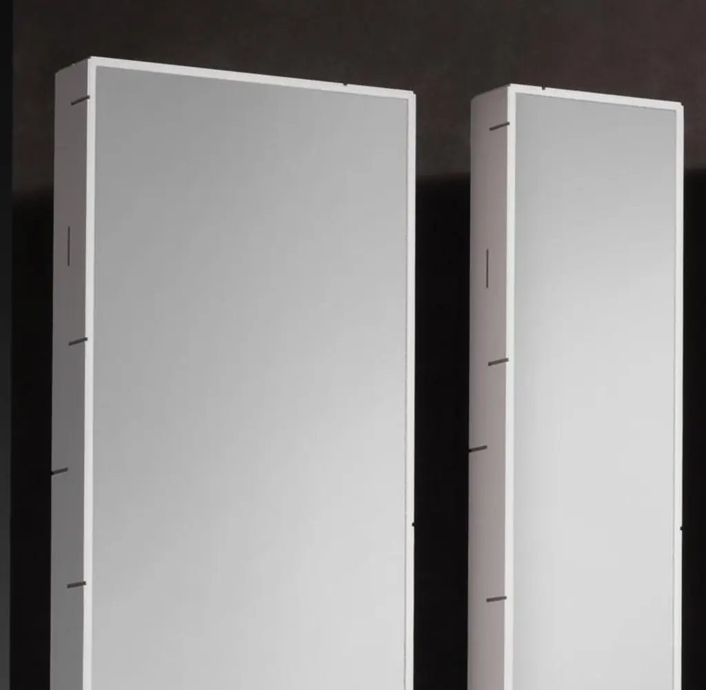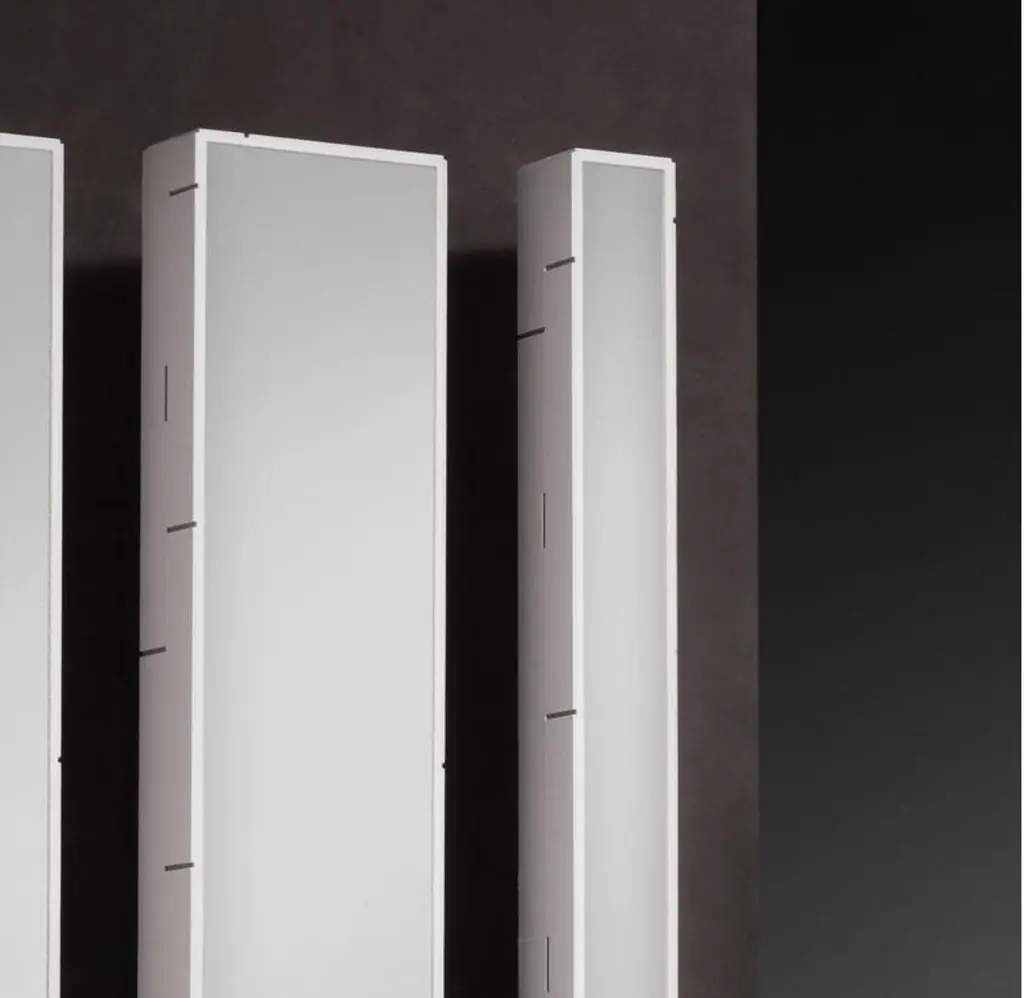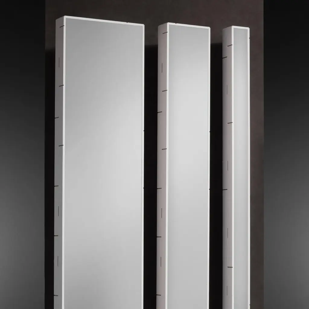 Designer Stephane Parmentier created the Atari furniture collection for Rabitti 1969 inspired by the beauty and the quality of the finest Italian leather and the craftsmanship and meticulous attention to details of leather artisans. The simple, clean silhouette of this striking frame is made of white saddle leather tiles with black grooves arranged in a graphic pattern evoking the late 1970s video games graphics. Either displayed by itself or with other pieces of the same collections, this floor mirror will increase light and a sense of spaciousness in any room, and its slim profile makes it easy to fit even small spaces.