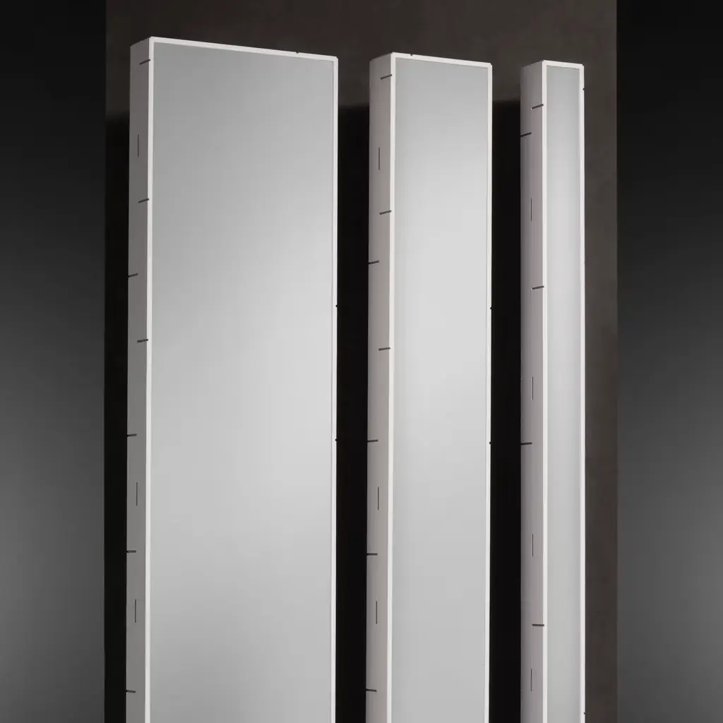 Designer Stéphane Parmentier created the Atari furniture collection for Rabitti 1969 inspired by the beauty and the quality of the finest Italian leather and the craftsmanship and meticulous attention to details of leather artisans. The simple, clean silhouette of this striking frame is made of white saddle leather tiles with black grooves arranged in a graphic pattern evoking the late '70s video games graphics. Either displayed by itself or with other pieces of the same collections, this floor mirror will increase light and a sense of spaciousness in any room, and its slim profile makes it easy to fit even small spaces.