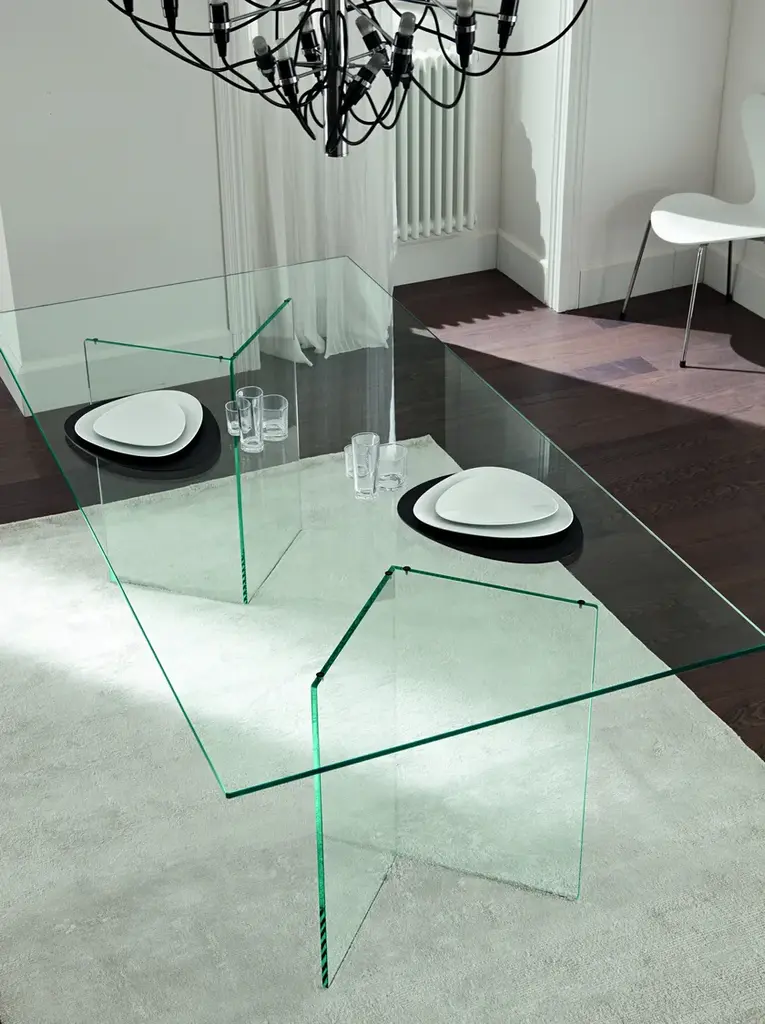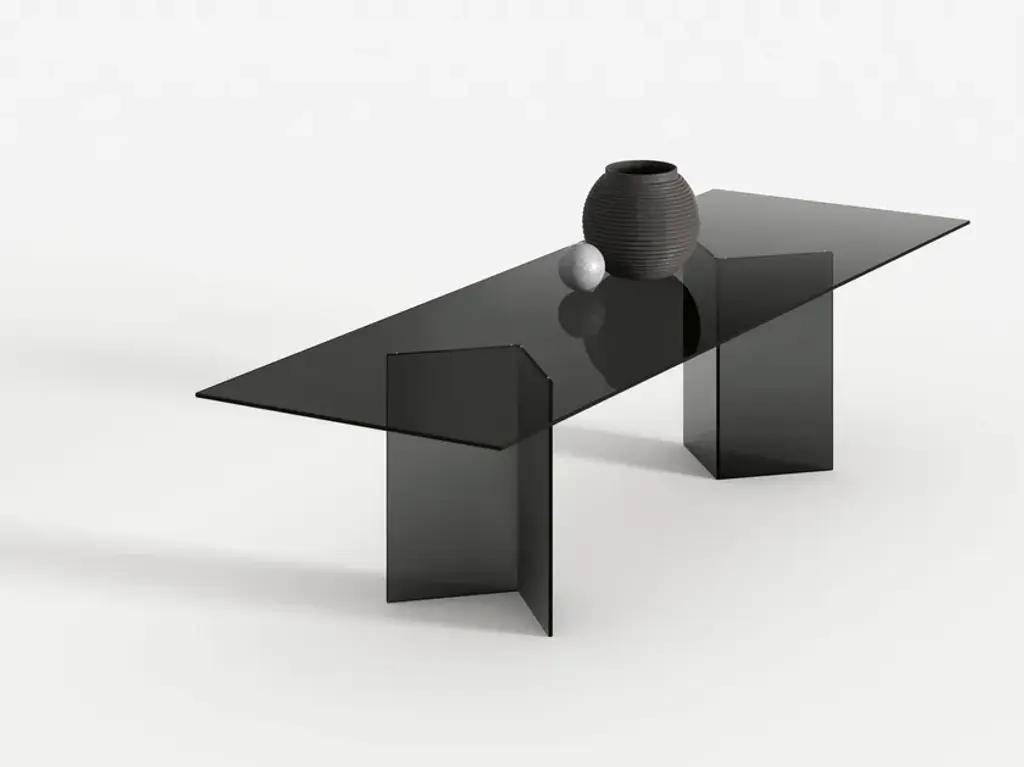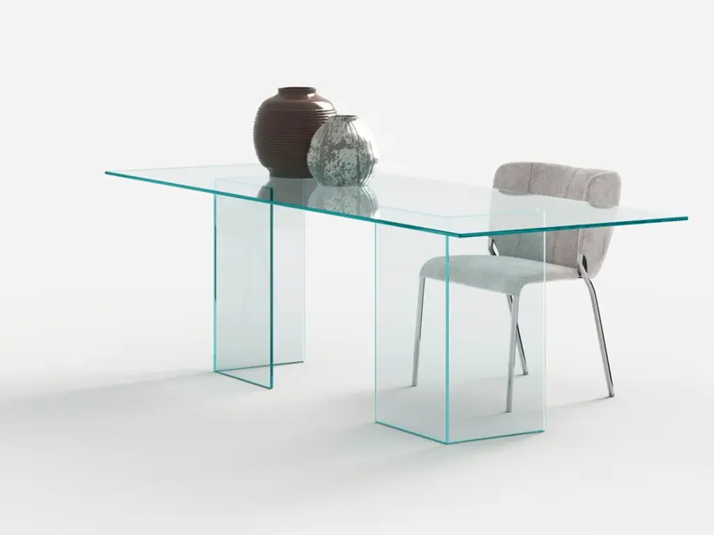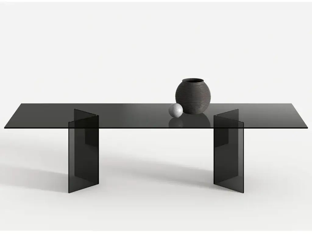 The glass table Bacco is composed of a top available in transparent, extra clear or smoked glass and of a base made of two mirroring glass supports that rest on the floor. Its clean lines are particularly suited for minimalistic decors because they do not burden the environment. The transparency makes the room brighter and creates a broader effect. Perfect for luxury studios and offices, dining rooms and lounges, the glass table Bacco can be ordered in different sizes according to needs. The glass of this designer table is resistant and tempered, which makes it also suitable for working areas and dining rooms.