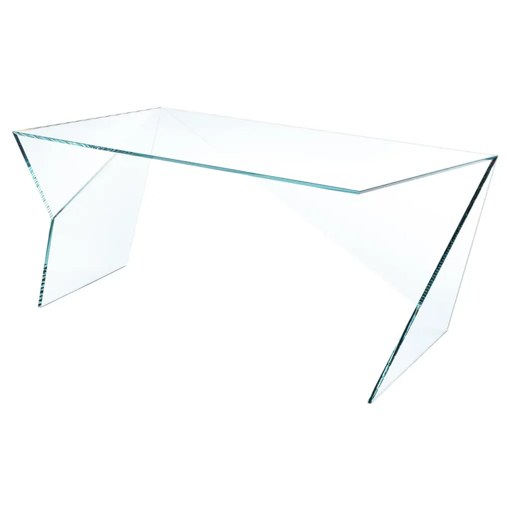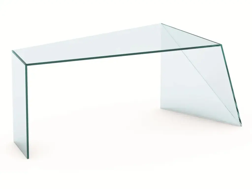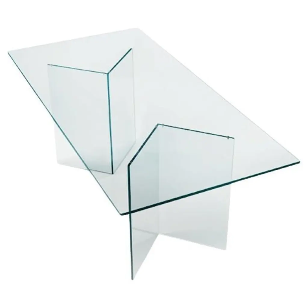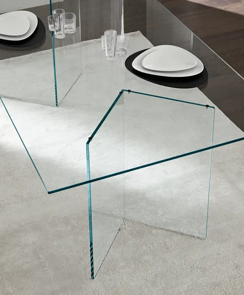 The glass table Bacco is composed of a top available in transparent, extra clear or smoked glass and of a base made of two mirroring glass supports that rest on the floor. Its clean lines are particularly suited for minimalistic decors because they do not burden the environment. The transparency makes the room brighter and creates a broader effect. Perfect for luxury studios and offices, dining rooms and lounges, the glass table Bacco can be ordered in different sizes according to needs. The glass of this designer table is resistant and tempered, which makes it also suitable for working areas and dining rooms.