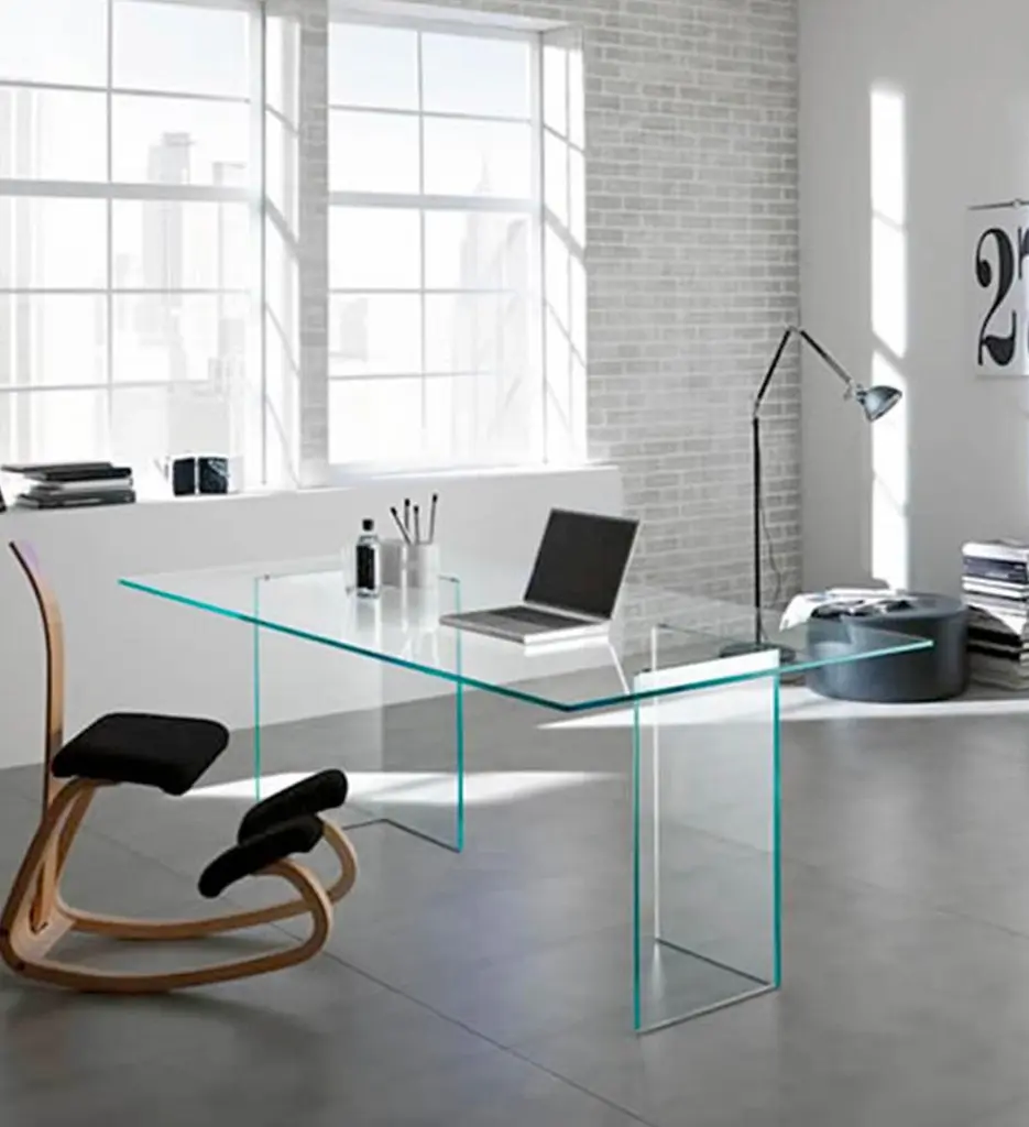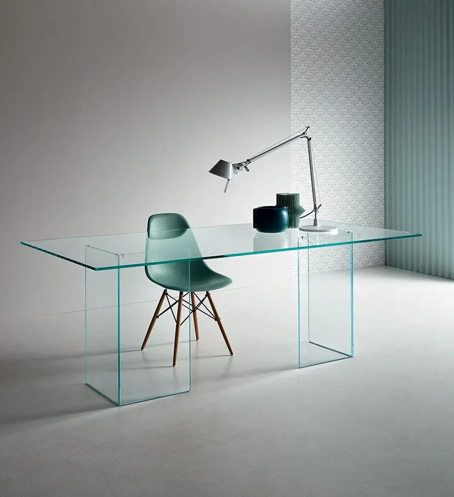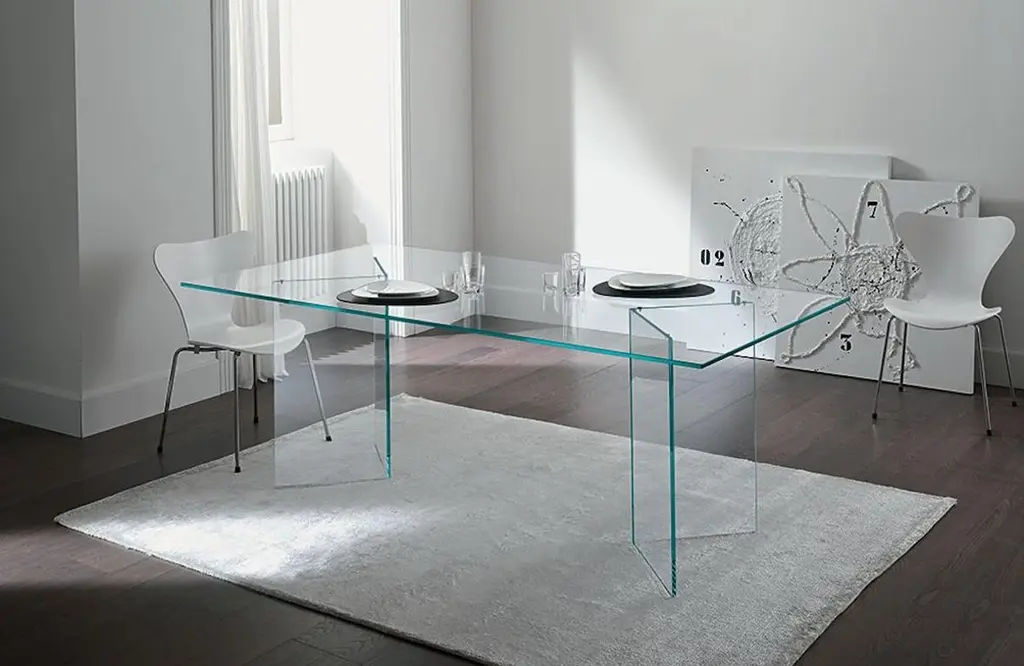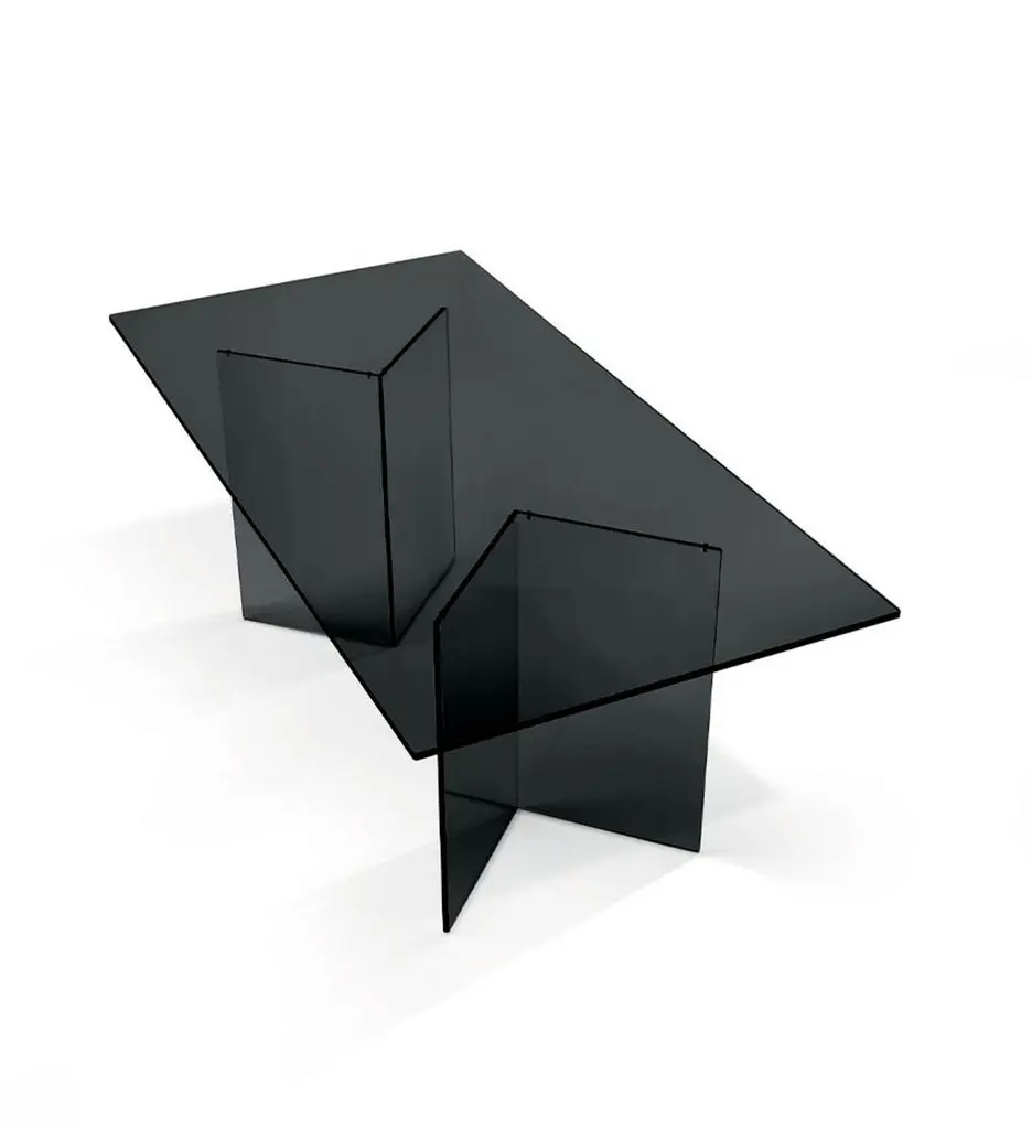 The glass table Bacco is composed of a top available in transparent, extra clear or smoked glass and of a base made of two mirroring glass supports that rest on the floor. Its clean lines are particularly suited for minimalistic decors because they do not burden the environment. The transparency makes the room brighter and creates a broader effect. Perfect for luxury studios and offices, dining rooms and lounges, the glass table Bacco can be ordered in different sizes according to needs. The glass of this designer table is resistant and tempered, which makes it also suitable for working areas and dining rooms.Designed by M.U. and made in Italy.