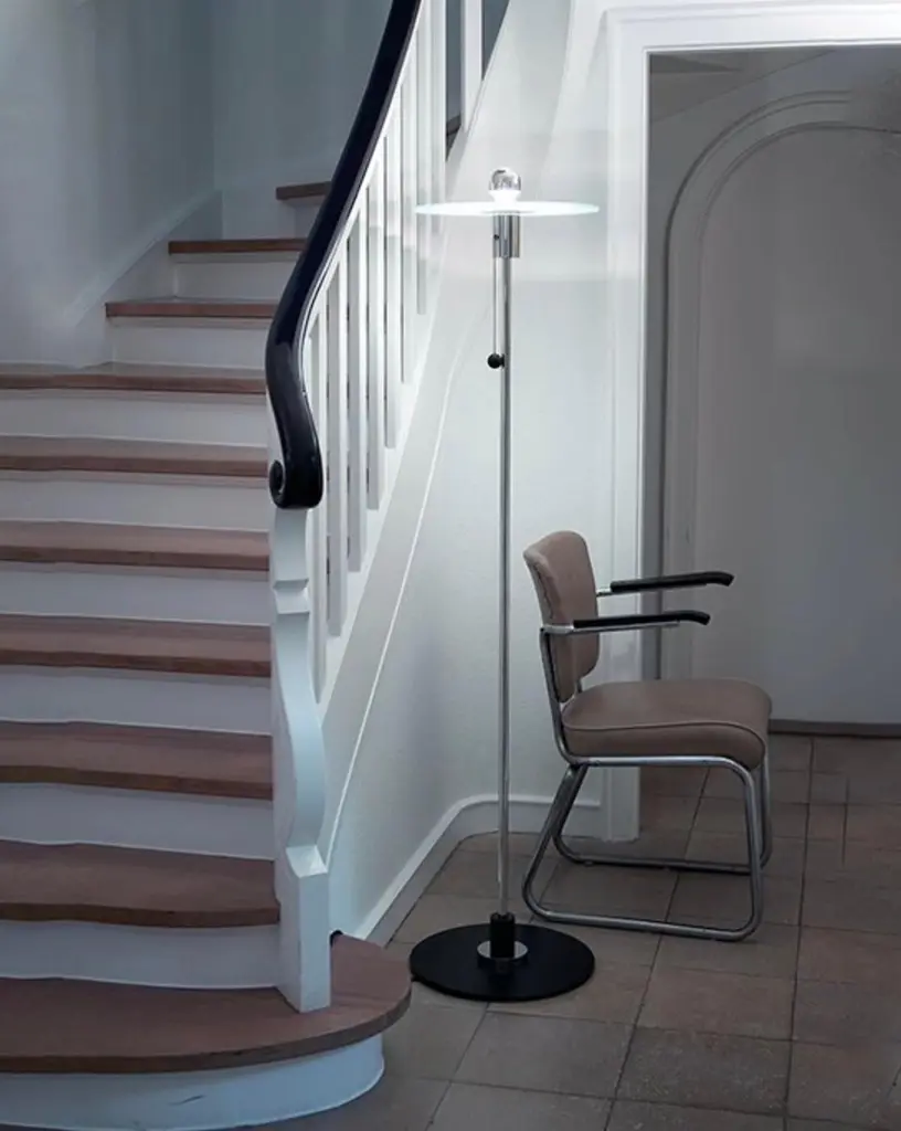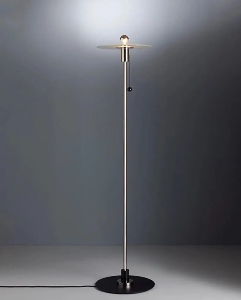 In his final year as a Bauhaus student in Weimar, Gyula Pap helped out Georg Muche and the construction department by designing a floor lamp for their experimental house, “Am Horn”. The light source is a special design feature in its own right – an exposed incandescent light bulb with a mirrored dome, which had just been invented at the time. The rays of light are channelled downwards, making the light source appear dark. The light is absorbed and refracted by the etched pane of frosted glass in such a way that it appears to float like a shining layer above the thin, nickel-plated metal tube. This lamp was shown as an example of functional design in the Bauhaus Book No. 7, “New Work at the Bauhaus Workshops”, published in 1925. The only original model was exhibited at the experimental house known as “Am Horn” and has sadly been lost. Tecnolumen's reproduction is based on a photo and a detailed drawing by Prof. Gyula Pap. Although no serial parts could be used for the production, with the exception of the socket and cable, all original dimensions were strictly adhered to. Special tools had to be built, and metal parts had to be twisted and refined to faithfully recreate the original design and appearance of the floor lamp. Floor lamp made of black lacquered iron, nickel-plated brass, frosted glass. Each lamp is numbered consecutively and bears the TECNOLUMEN / BAUHAUS logo.