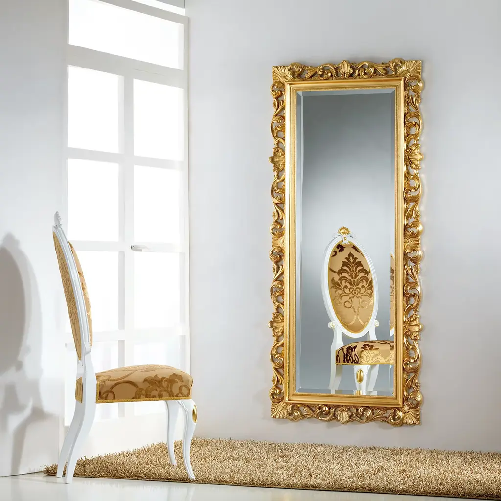 Featuring a rectangular, beveled mirror in prized Italian crystal, this sophisticated wall mirror will be an eye-catching addition to a refined interior. The bold baroque frame is crafted of wood and adorned by hand with gold leaf, highlighting its luxe allure. Suitable both as a floor and wall mirror, it features hooks already fitted to its back. Please inquire with the Concierge for customizations and to request the variant in silver leaf.