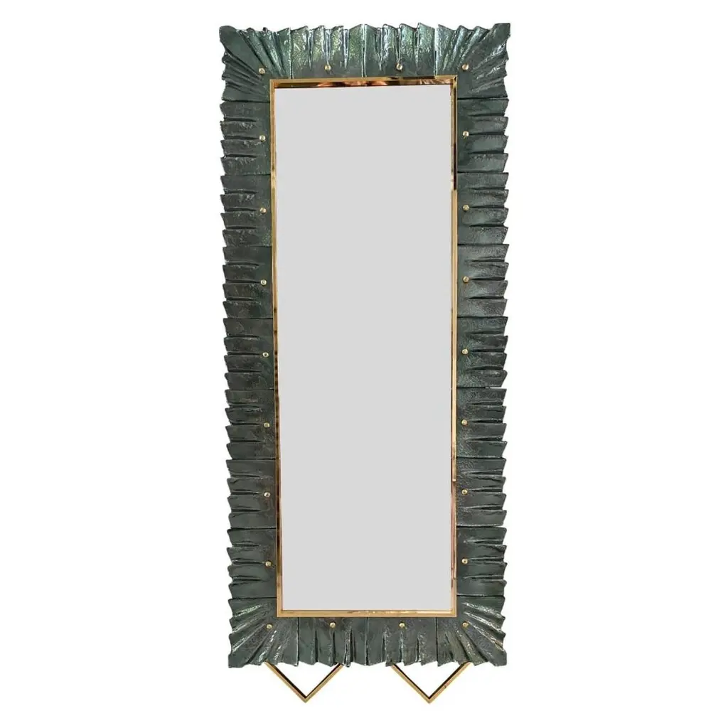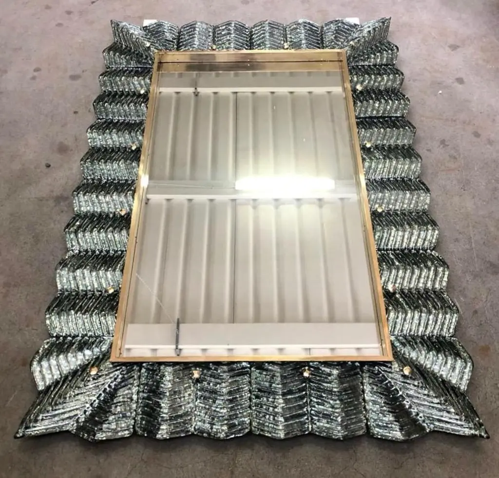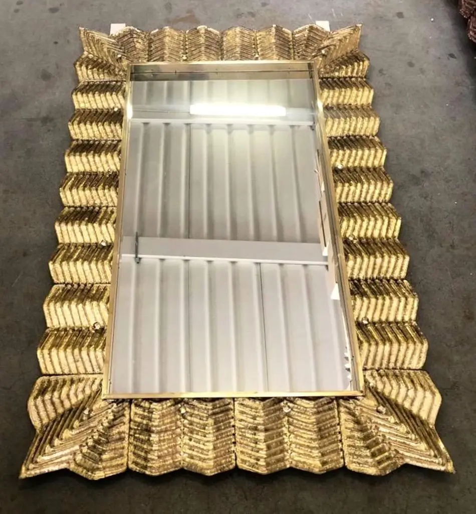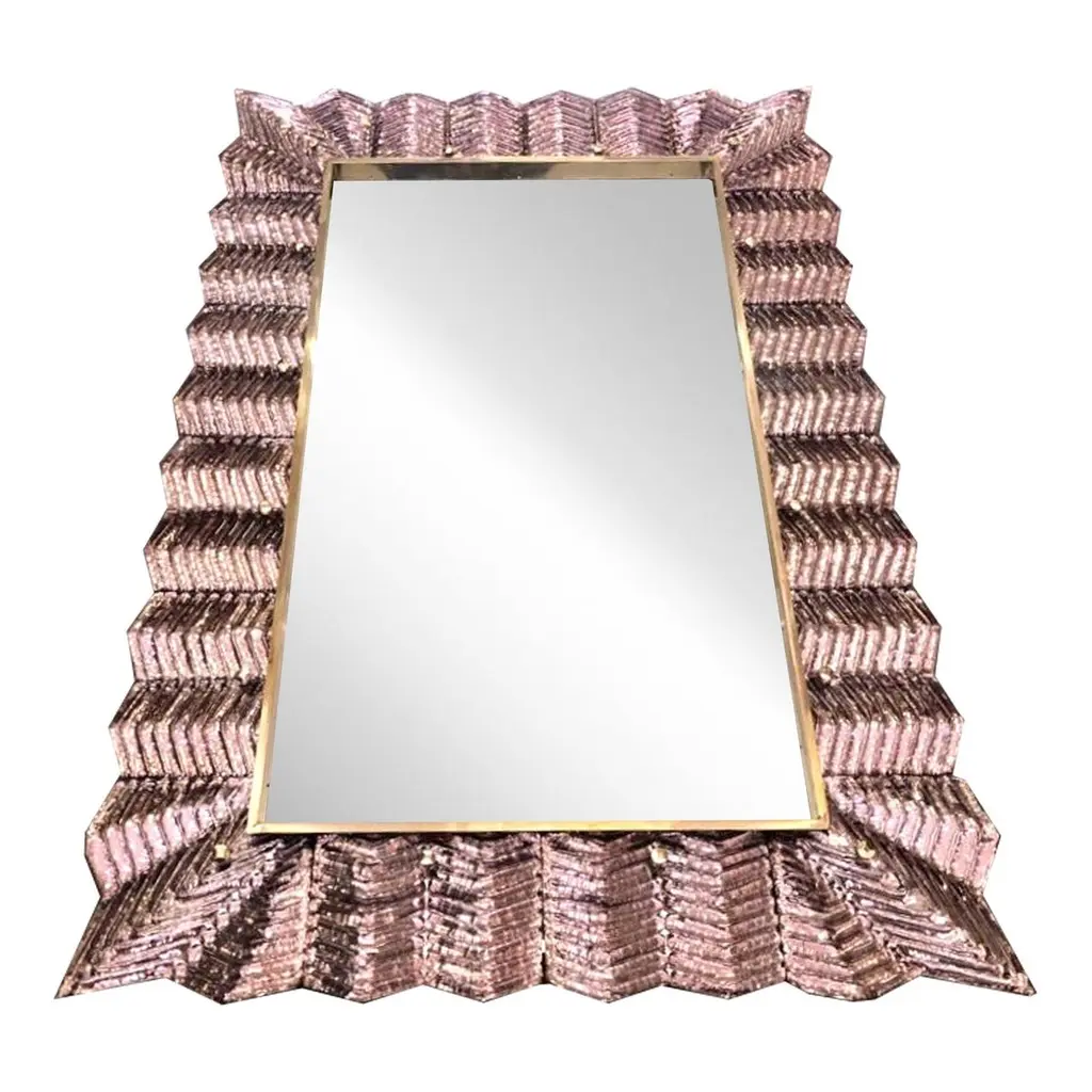 Venetian contemporary Couture design rectangular wall mirror, custom made in Italy, framed with a thick border in high quality blown Murano art glass in blush rose color, artistically decorated with a typical Art Deco reeded sculpture pattern that catches the light. High quality of execution with the wood back enclosed in a handcrafted brass border and the mirror plate edged with a brass border. The first 2 images illustrate the option of a silver leaf textured reverse that adds iridescence to the piece. This design can also be produced as a full-length floor mirror with a double triangular support as per image. Custom sizes will need to be multiples of approximately 8” due to the length of the glass elements composing the frame.