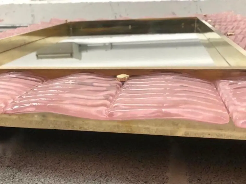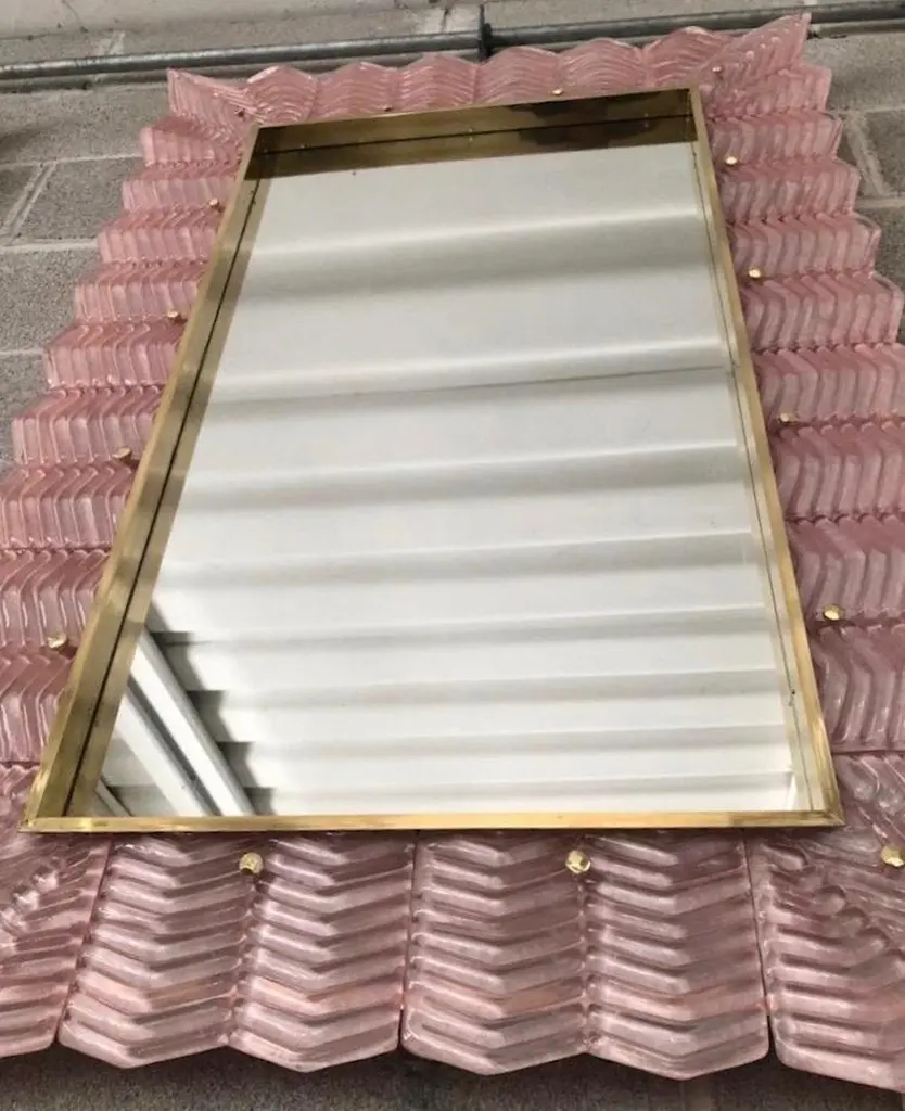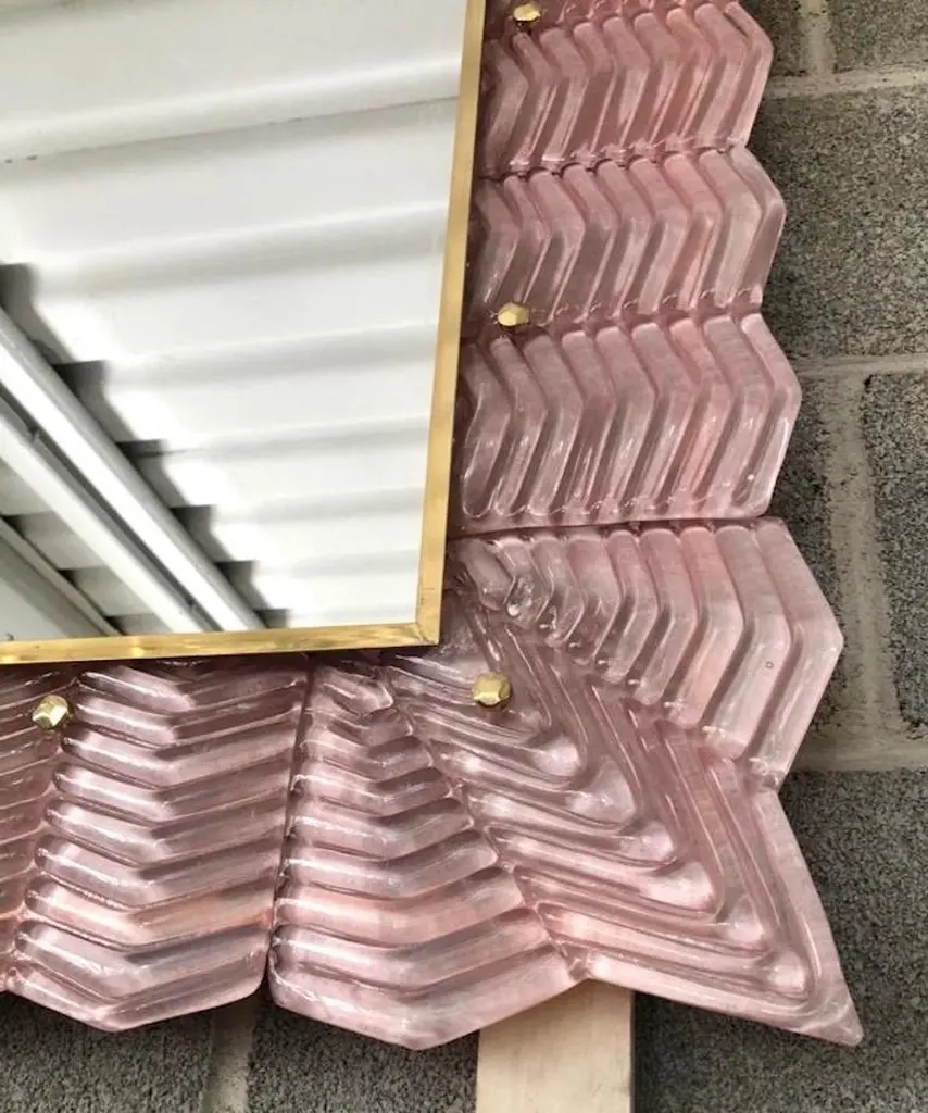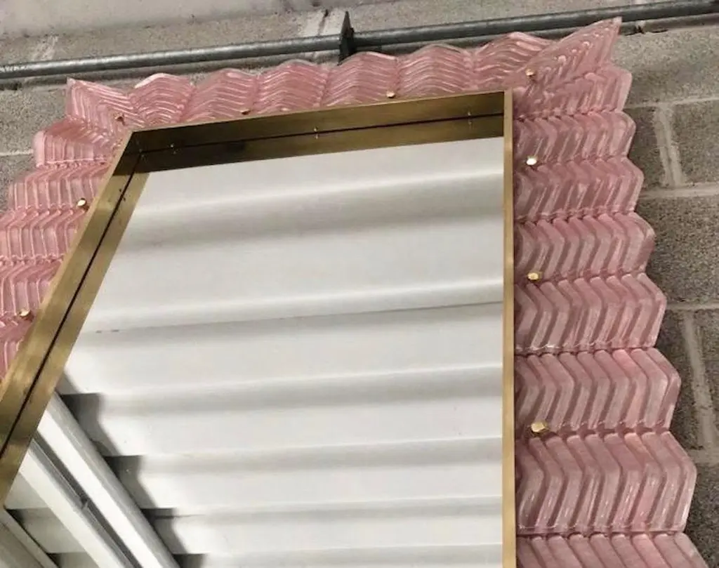 Bespoke Italian Art Deco Design Ruffled Silver Pink Murano Glass Brass Mirror