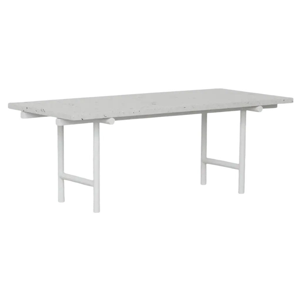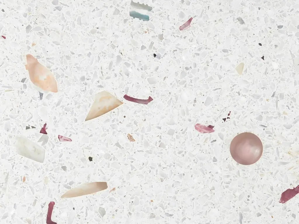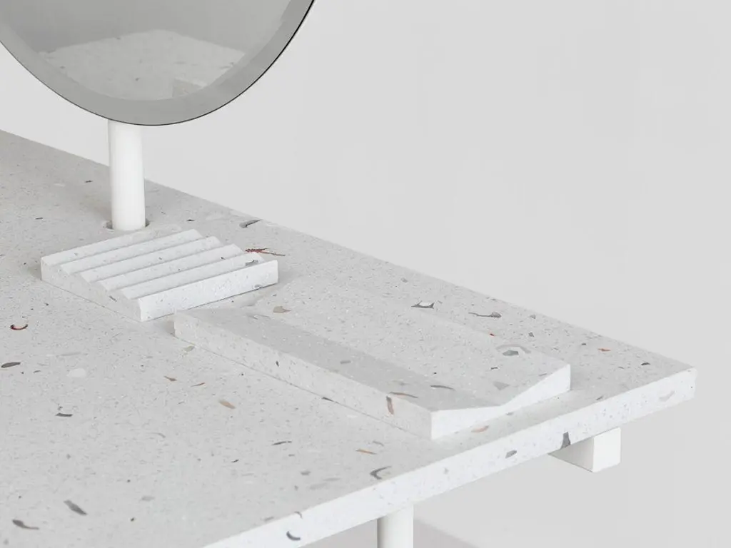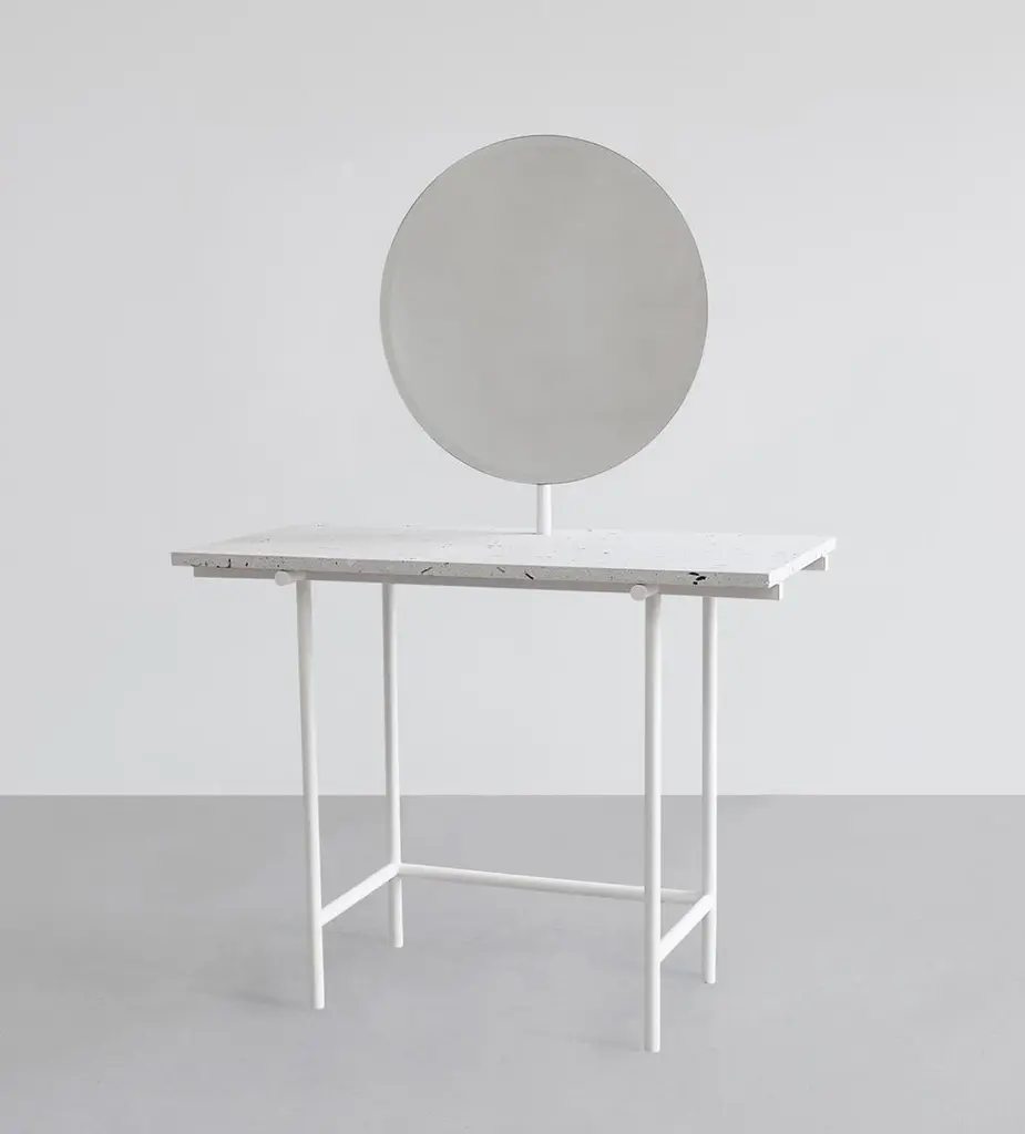 Boberella table and mirror by Llot LlovDimensions: W 50 x L 100 x H 147 cmMaterials: powder coated steel, glacier surface mirrorThe make-up table BOBERELLA is part of the first collection in collaboration with Trash to Treasure. The frame is made of powder-coated steel. The material GLACIER serves as a table surface. The round mirror is turnable. There are two versions of the make-up table available. GLACIER – Nail Polish Terrazzo is after OSIS the second surface material especially developed by LLOT LLOV.Our new material was developed in an Up-cycling Workshop for the German cosmetics group Cosnova GmbH. The goal was to make use of rejected nail-polish bottles and loose nail-polish colors in another work circle. First, we destroyed the bottles and then added the debris to a concrete mixture. The glass particles and the nail polish sink to the bottom of the cast stone slab and become visible through polishing.In this way, a new interpretation of colourful terrazzo comes into being, a material that can be used in the kitchen, like shelves, in a bar or on the floor. Our dining table BOB and our low table BOBBY, as well as our lamp 25/25, are produced with this new material.LLOT LLOV produce exclusive furniture and objects for private or corporate clients and also manage interior design projects such as hotels or offices. In addition, the duo has been running a shop for fashion and accessories in Berlin-Mitte with BAERCK since 2007.