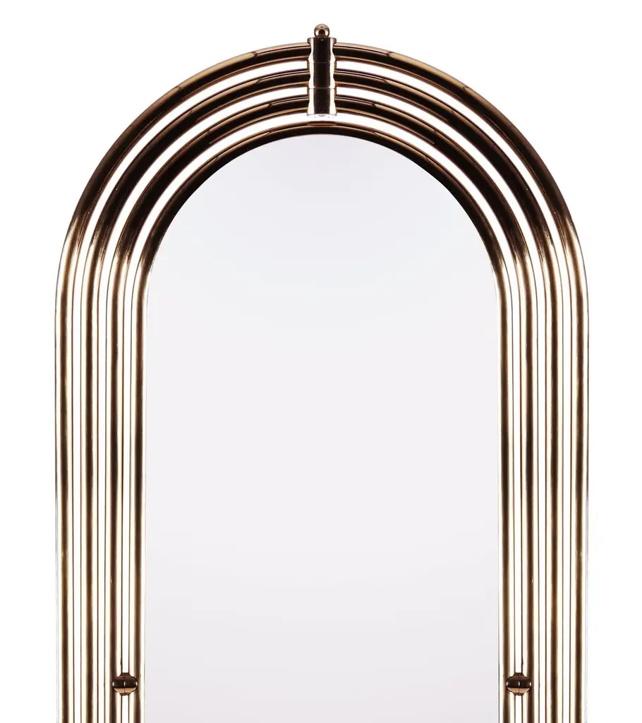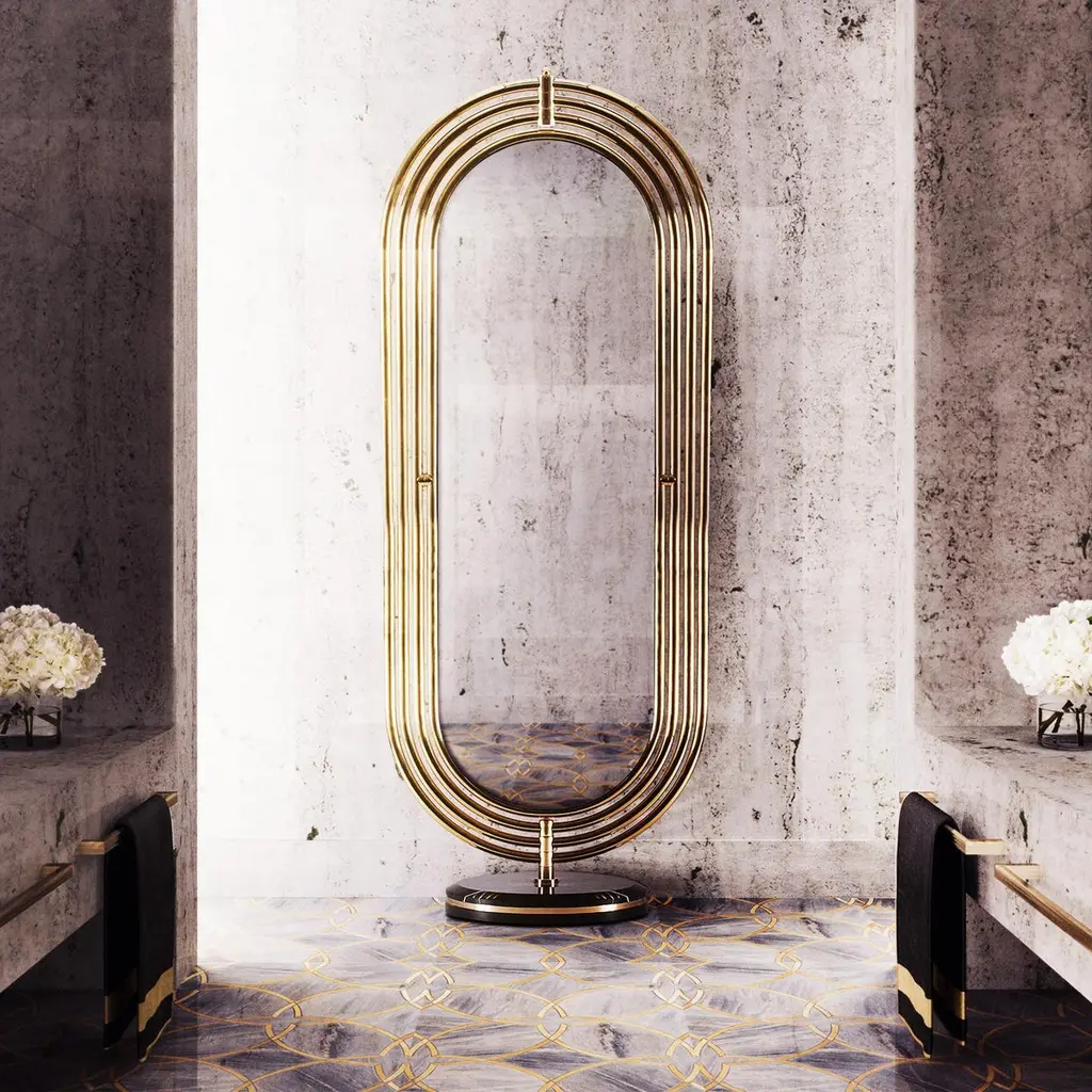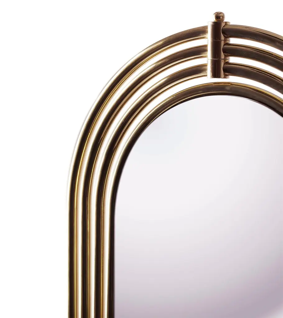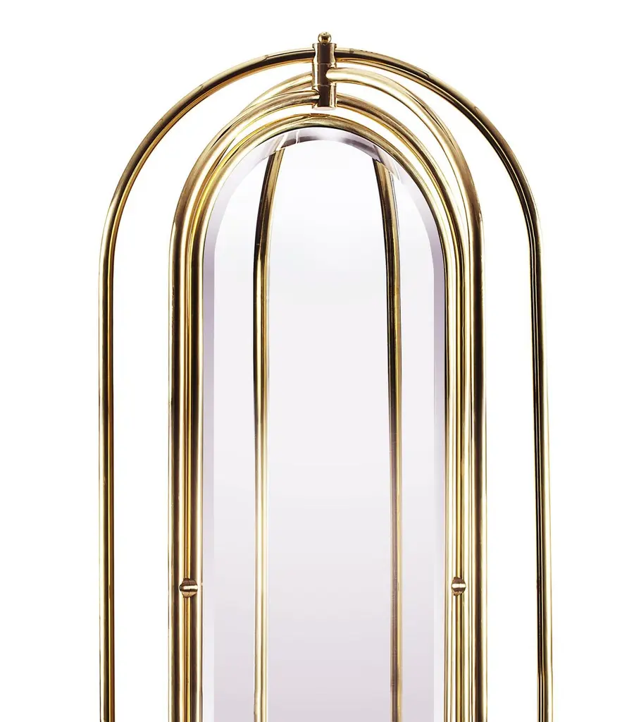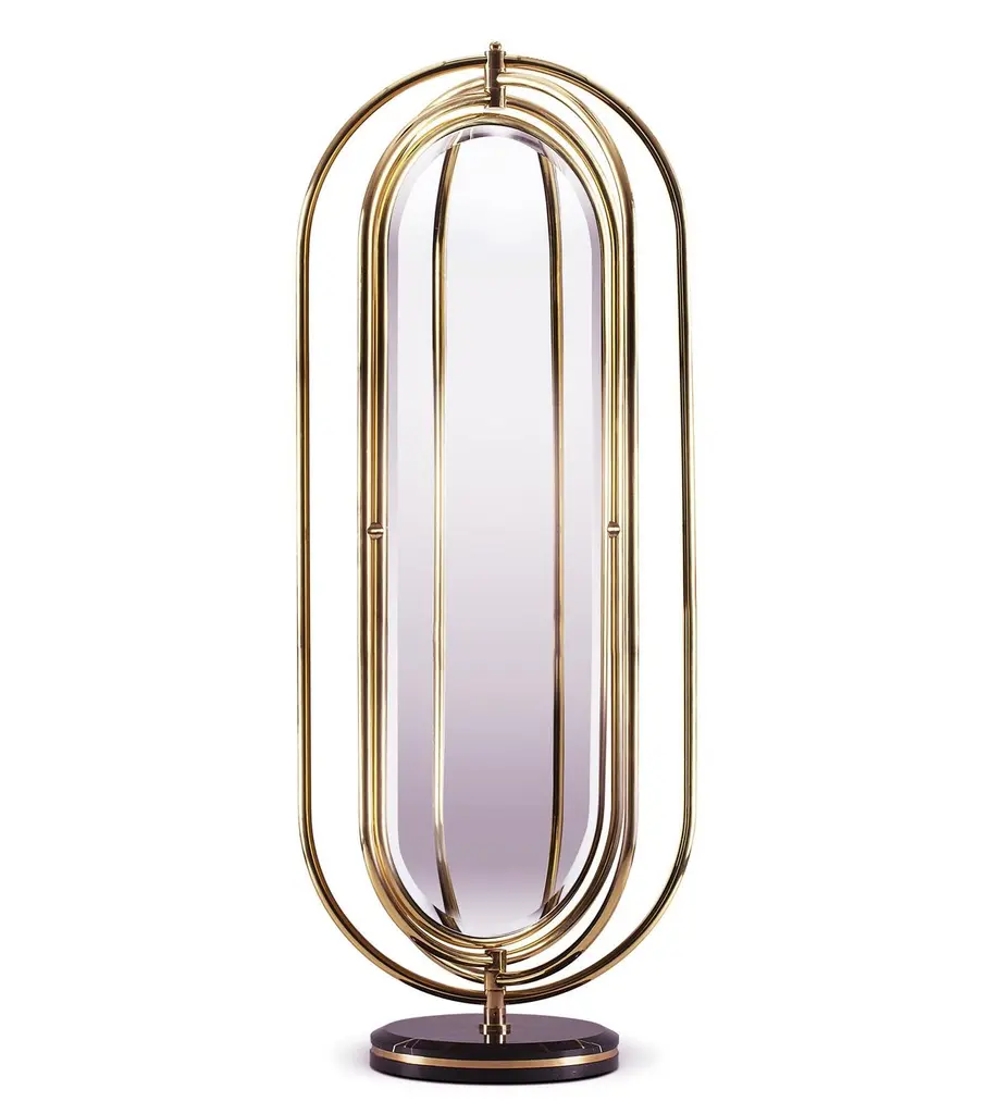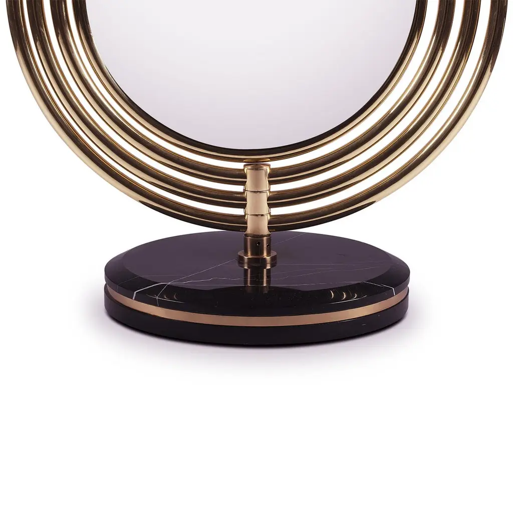 Floor mirror brass tubular with LED light withpolished brass tubular frame structure. Ledlight system included in brass tubular frame.Rotate mirror on 360 degrees axis on blackmarble round base with brass trim around.With beveled mirror glass.