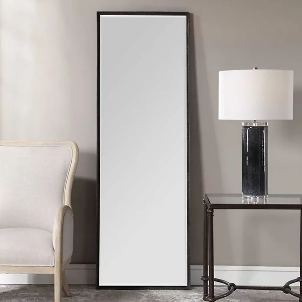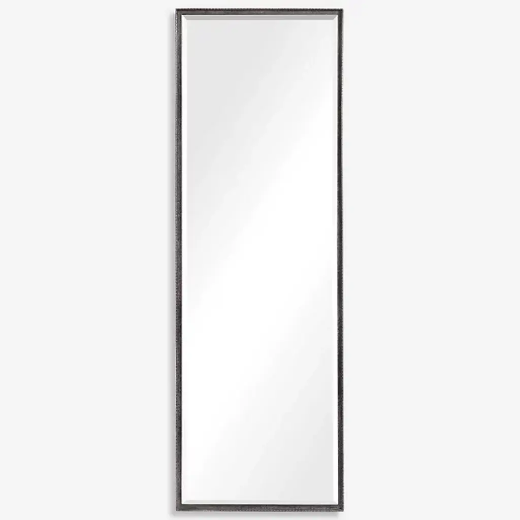 The Callan Floor Mirror from Uttermost comes from Grace Feyock's study of essential forms. The iron frame adopts an understated approach, letting subtle edge work create depth. Small decorative touches mark key points along the perimeter, while the thin profile keeps the piece from dominating its surroundings. This mirror pairs especially well with transitional spaces like hallways or dressing areas. Its dual mounting options allow it to adapt to various room layouts, making it a practical choice for both vertical and horizontal applications.