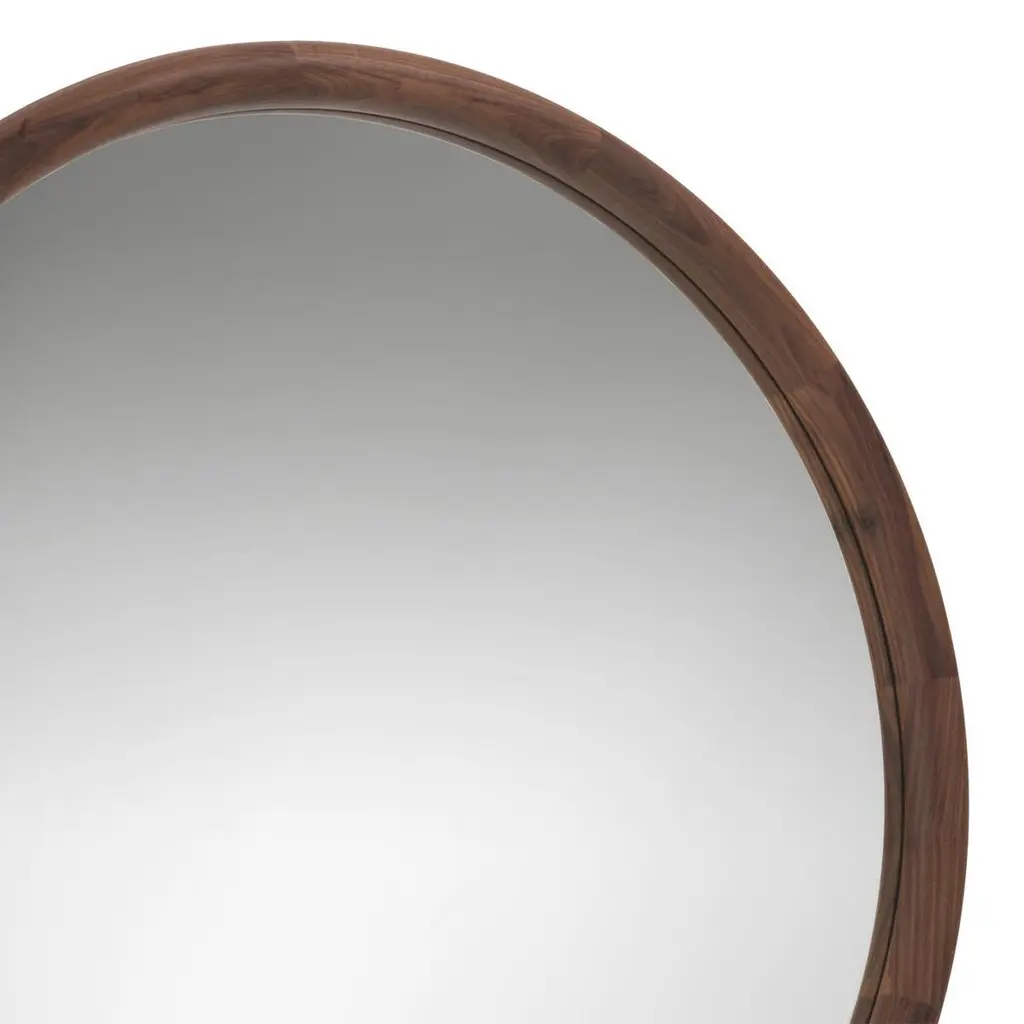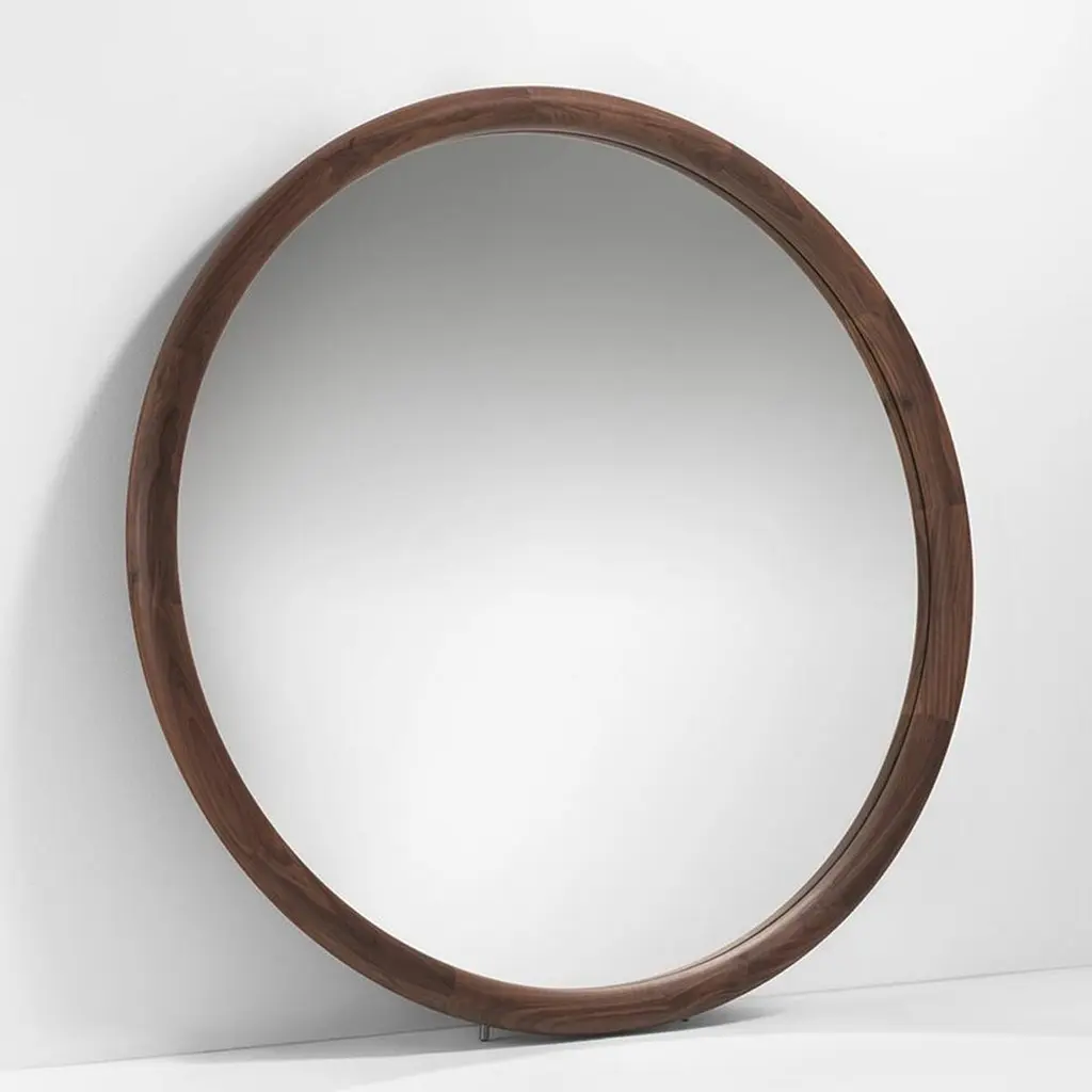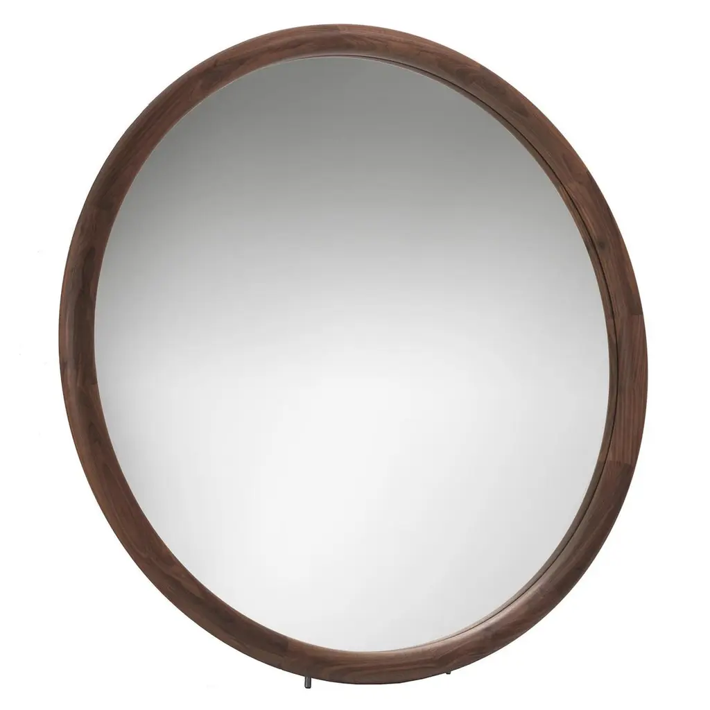Mirror circle walnut with solid walnut frame andwith round flat mirror glass, mirror to be hung asa wall mirror or to be leant as floor mirror. It is onlyadvise toremoving the feet support to hang the mirror to the wall.