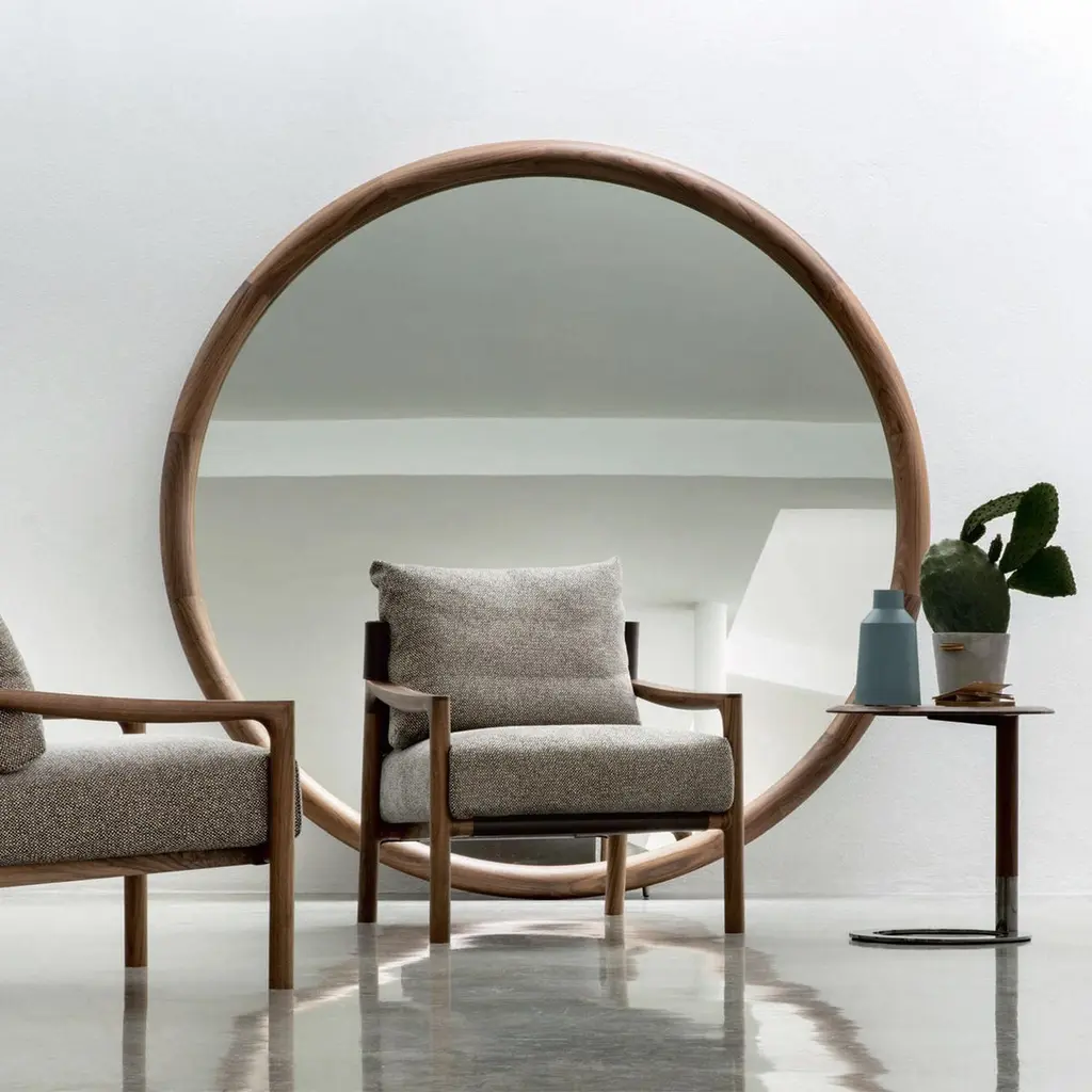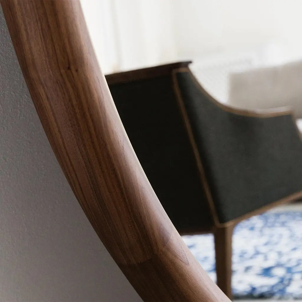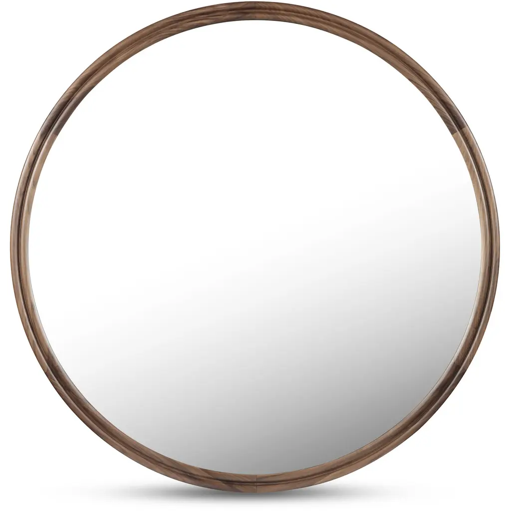 Mirror circle walnut with solid walnut frame andwith round flat mirror glass, mirror to be hung asa wall mirror or to be leant as floor mirror. It is onlyadvise toremoving the feet support to hang the mirror to the wall.