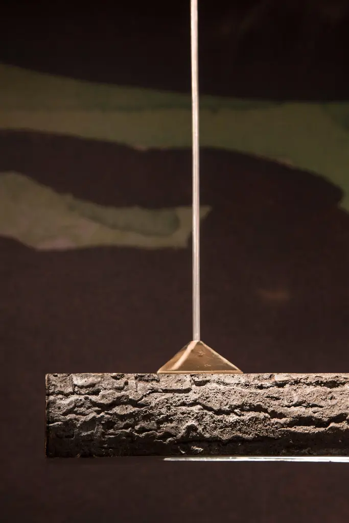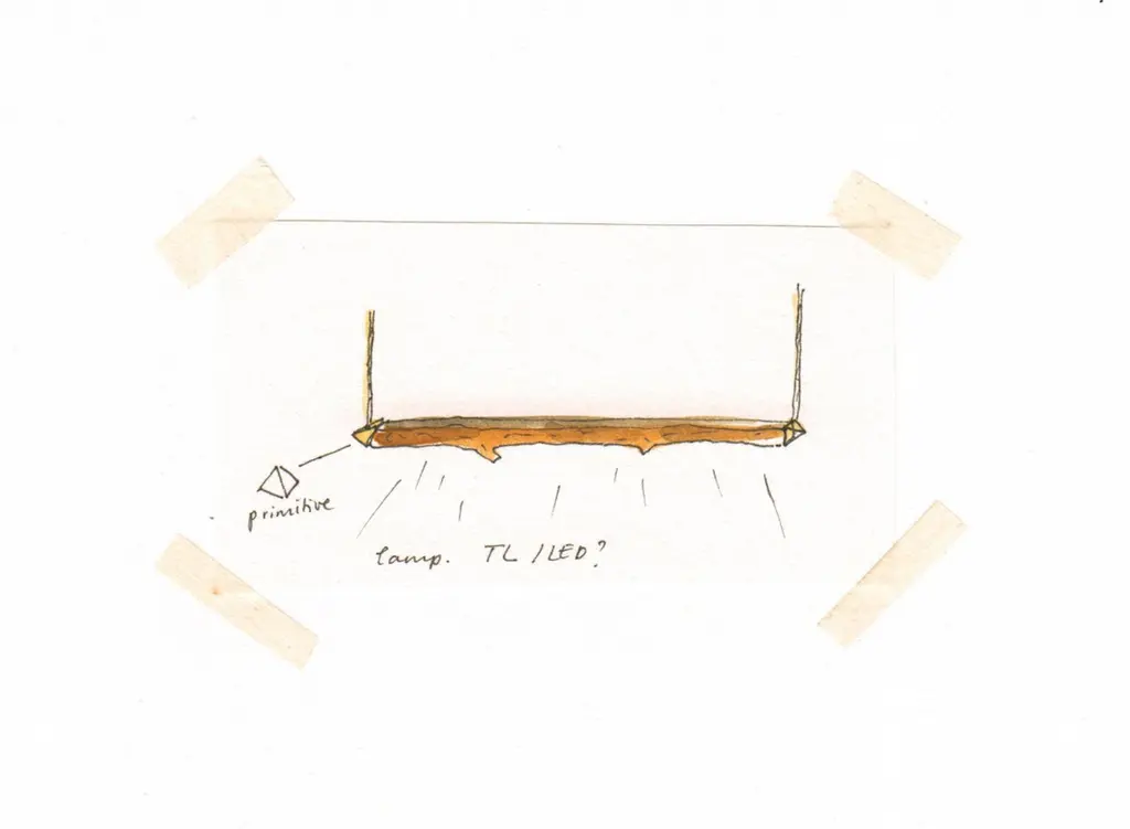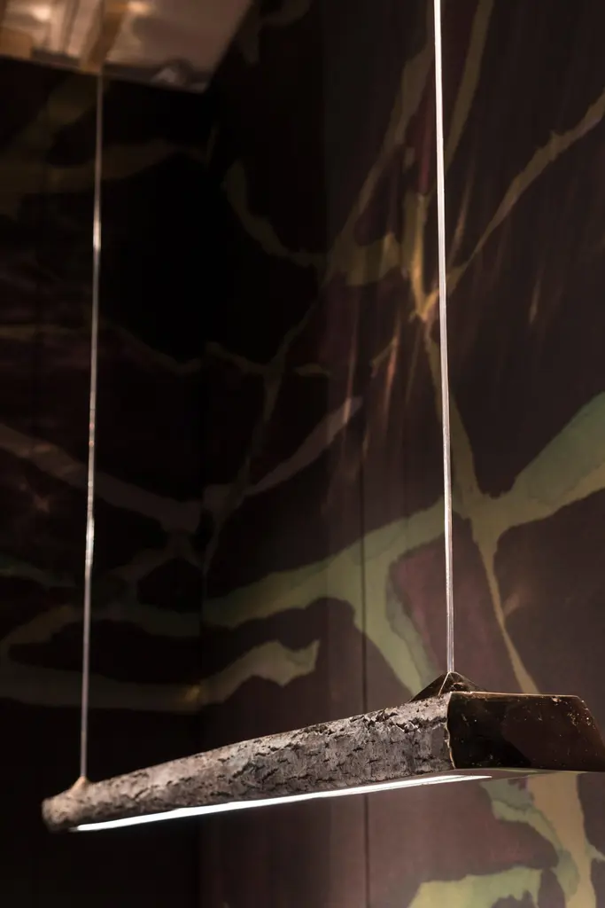 Civilized Primitives is an extraordinary unique collection that brings together natural elements and the old technique of bronze casting. The designer investigates the basic and functional methodologies of surviving into the wild and nomadic ways of living. The inspiration from survival techniques and the respect for nature are at the core of the collection. Each of the pieces is modelled on branches found in the forest. sanded smooth on three sides and left textured on the last in her workshop before being cast in bronze.Civilized Primitive's largest pieces are a single A-frame daybed with a seating cushion woven at the TextileMuseum in the NL and a desk with a conical light hanging overhead. A mirror. candleholder. floor lamp and pendant lamp do enrich the collection.The three rough sides have been treated with a beautiful patina which will even get more lived through time. whereas the other side is smooth and high polished.