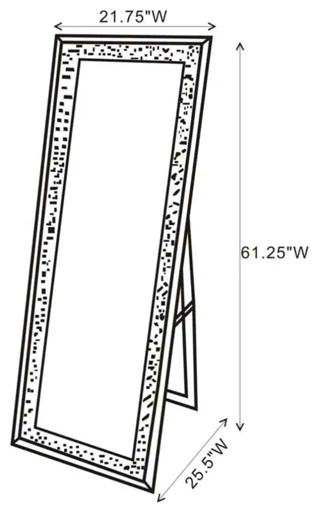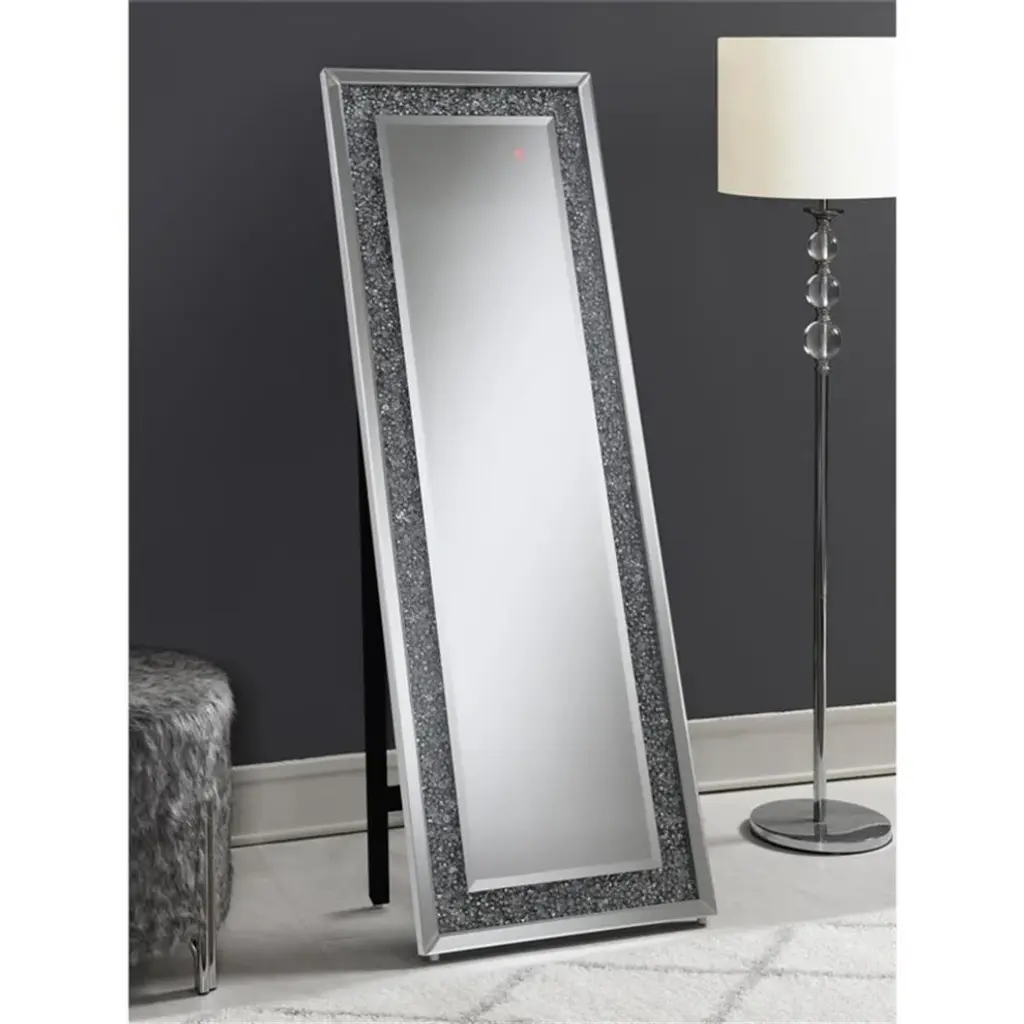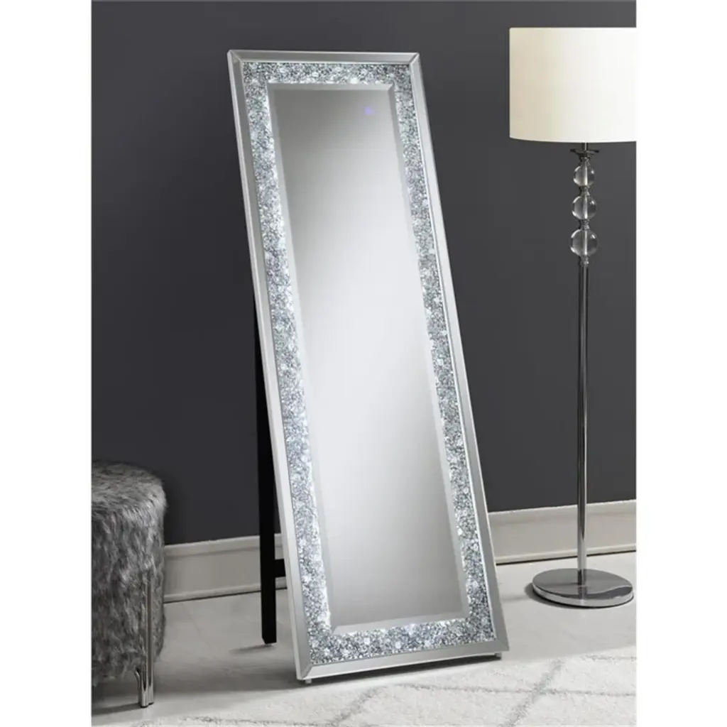 Bring a cool vibrancy to your home when you add this standing mirror. It features MDF and mirror construction that brightens up a bedroom or makes for a unique addition to the foyer. The silver finish is embellished with crystal accents that give the mirror a splash of panache. Yet, the LED lighting around frame really enlivens the home and sets it apart from other mirrors. You''ll always be sure you look good with this stunning standing mirror.Features: • Includes: One (1) standing mirror • Finish: Silver • Materials: MDF, mirror • Glam elements include the crystal embellishments • Touch activated LED on and off switch • Bulb type: 5W • Power cord length: 98.5" • Number of hooks: None • Type of hook/orentation: NoneSpecifications: • Product Dimensions: 61.25" H x 21.75" W x 25.5" D • Product Weight: 42.01lbs • Assembly Required: No • Warranty: One (1) year limited manufacturer warranty