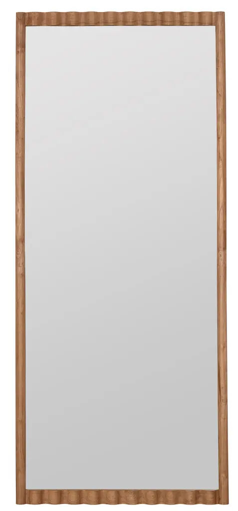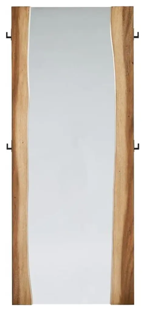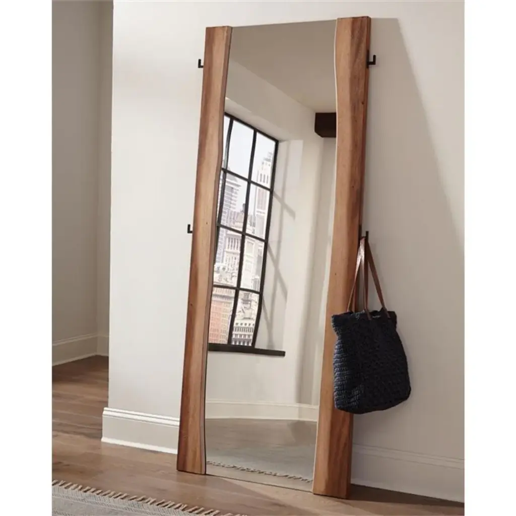 Put your best foot forward each and every day. This full-length floor mirror lets you walk out the door feeling confident from head to toe. Fashionable and functional, it features a striking wooden frame in an appealing, smokey walnut and coffee bean finish. Curvy edges between the frame and mirror give it an eye-catching look. This mirror''s metal brackets allow you to easily affix it to any wall, making it ideal for a bedroom or walk-in closet.Features: • Includes: One (1) floor mirror • Finish: Smokey Walnut • Materials: Mahogany, trembesi veneer • Full-length floor mirror with a striking wooden frame • Features a smokey walnut and coffee bean finish for a fashionable look • Curvy edges between the frame and mirror for an eye-catching aesthetic • Comes with metal brackets for easy wall mounting • Ideal for bedrooms or walk-in closets to boost confidence before stepping out • Number of Hooks: 2 hanger left and 2 right side • Rubber at bottom sideSpecifications: • Product Dimensions: 76" H x 31" W x 1.5" D • Product Weight: 57.32lbs • Assembly Required: No • Warranty: One (1) year limited manufacturer warranty