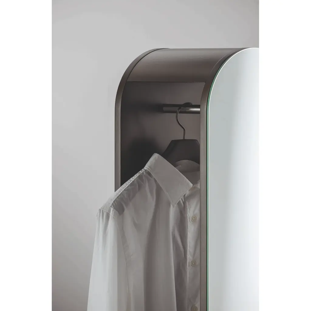 The Vague mirror combines a floor-based mirror and a coat hanger in a single small space. The mirror has the concrete base that is typical of the Vague collection, from which two panels emerge vertically, the front section mirrored and the rear in wood, joined together by a metal frame and a rod on which to hang clothes, combining the function of reflection with the practicality of a clothes hanger.