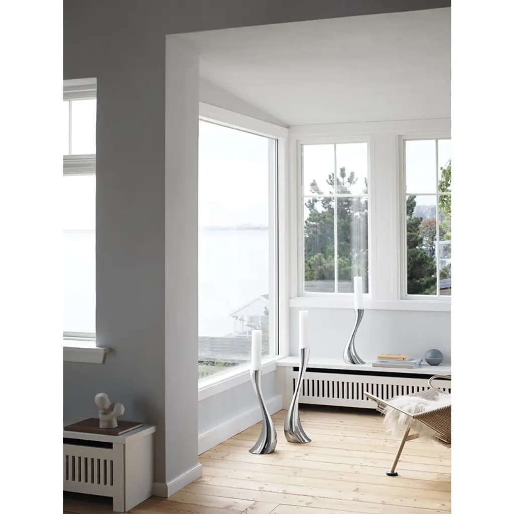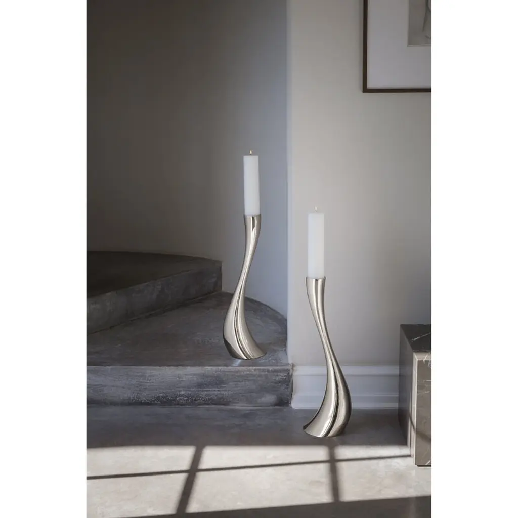 Georg Jensen's Cobra floor candleholder catches the eye with its height of 23.62 in (60 cm) and shine of mirror polished steel. The organic lines of the candleholders resemble melting wax – almost as if a classic candlestick had started to melt. Designed by Constantin Wortmann, Cobra collection is characterized by a swerving, dramatic appearance, and its strong curves create an impression of fast movement. Just like actual cobras, the members of the Cobra collection are imposing, striking and bold. With its mirror-polished steel surface and dynamic design, Cobra is a true design classic that adds a dramatic element to any interior.